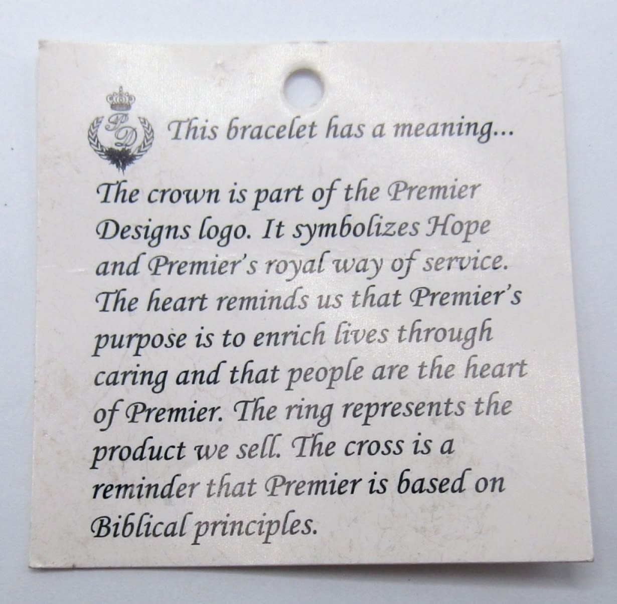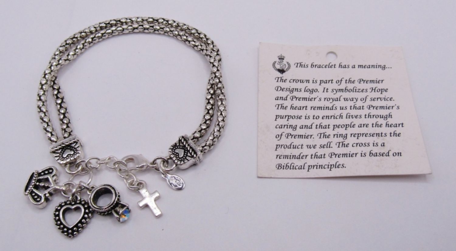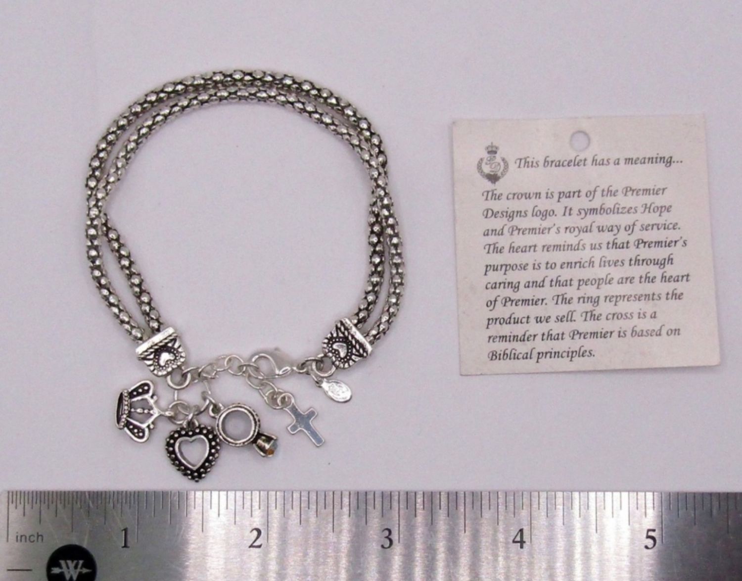 SILVER CHARM BRACELET, PREMIER DESIGNS LOGO, DOUBLE ROPE STYLE WITH CLASP, WITH CHARMS OF RING, HEART, CROWN, CROSS
