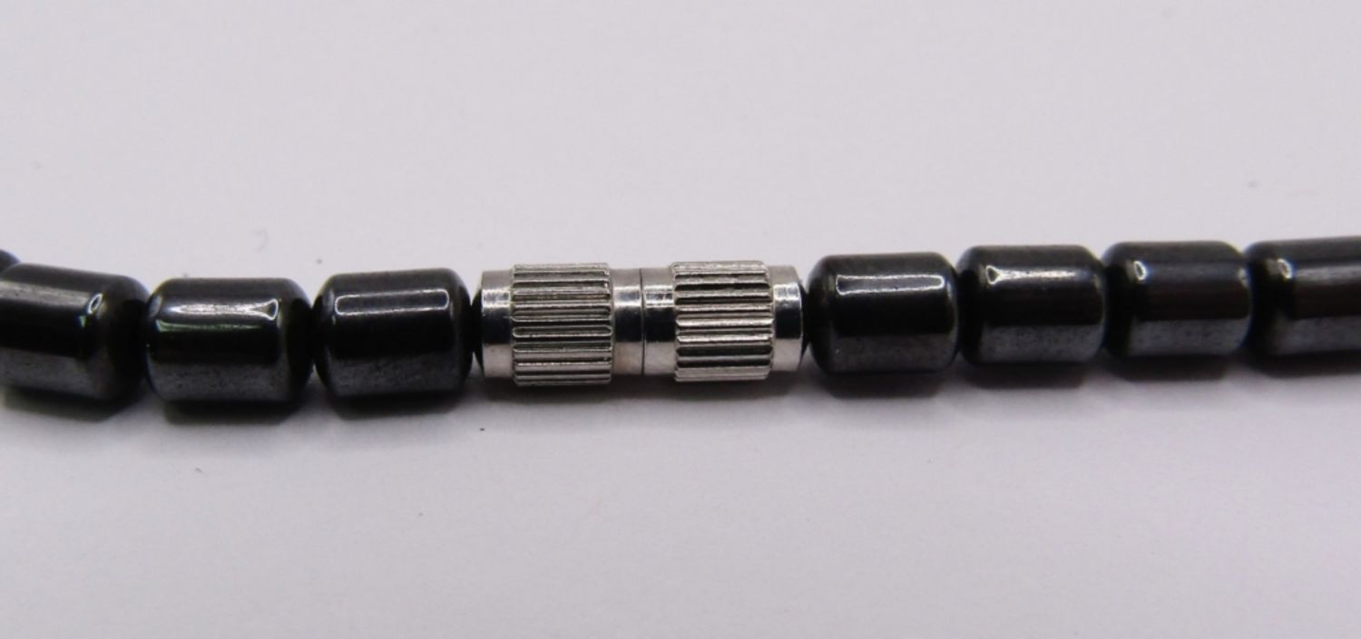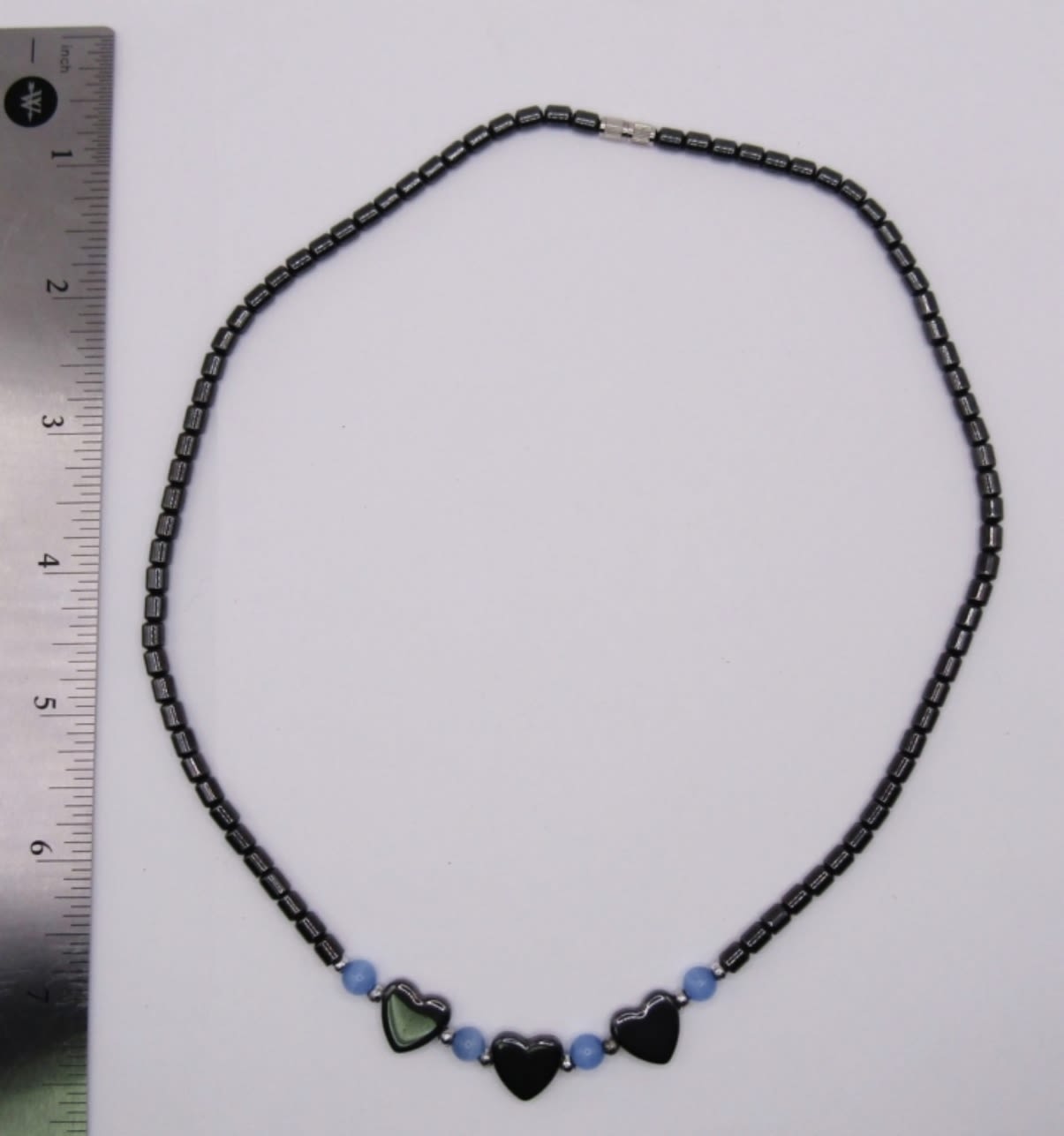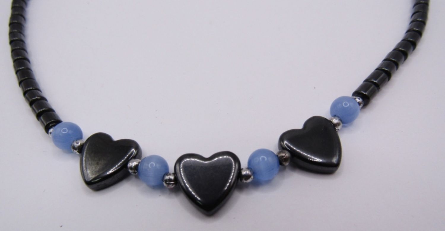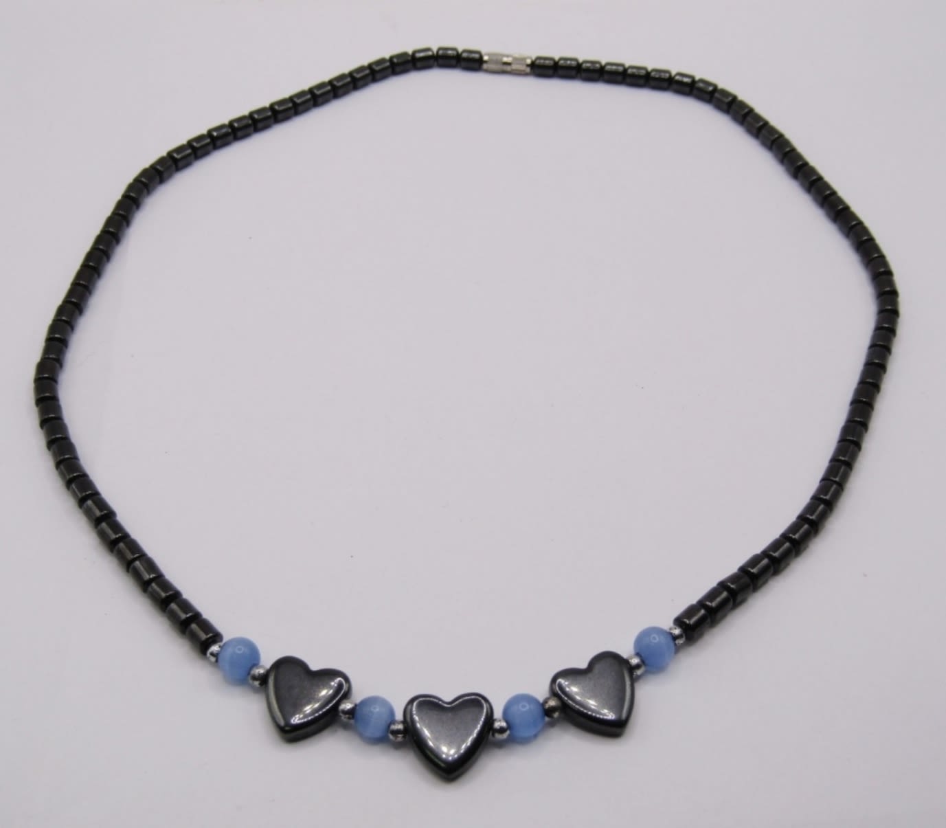 HEMATITE BEADED NECKLACE WITH TRIPLE HEART DESIGN AND LIGHT BLUE ACCENT BEADS, TINY TWIST CLASP