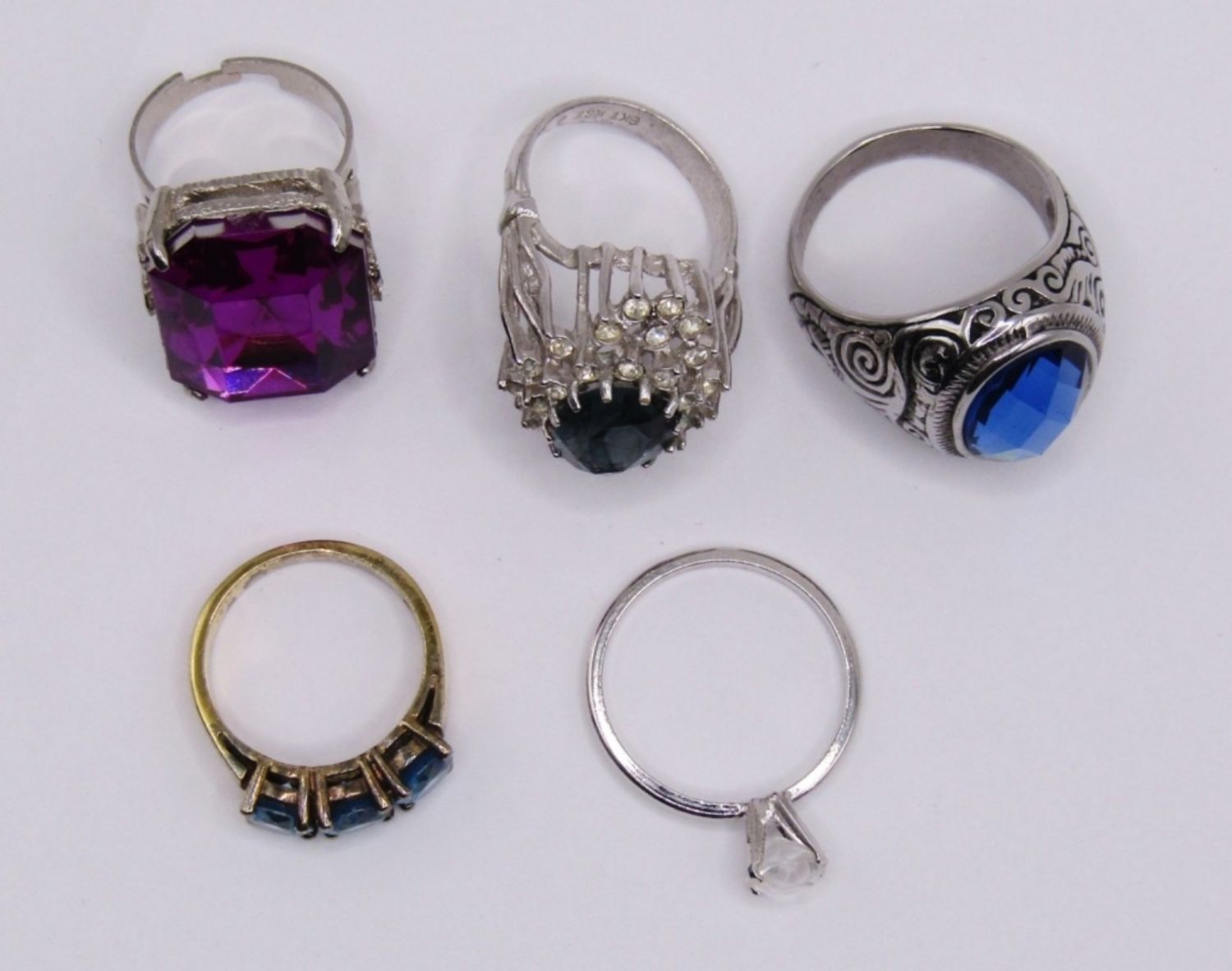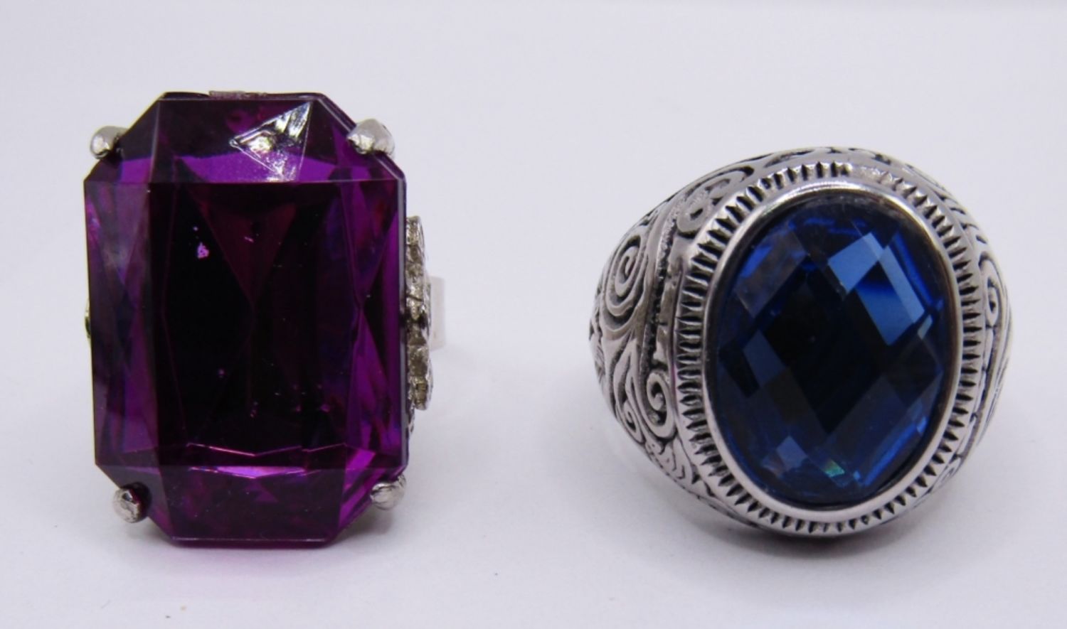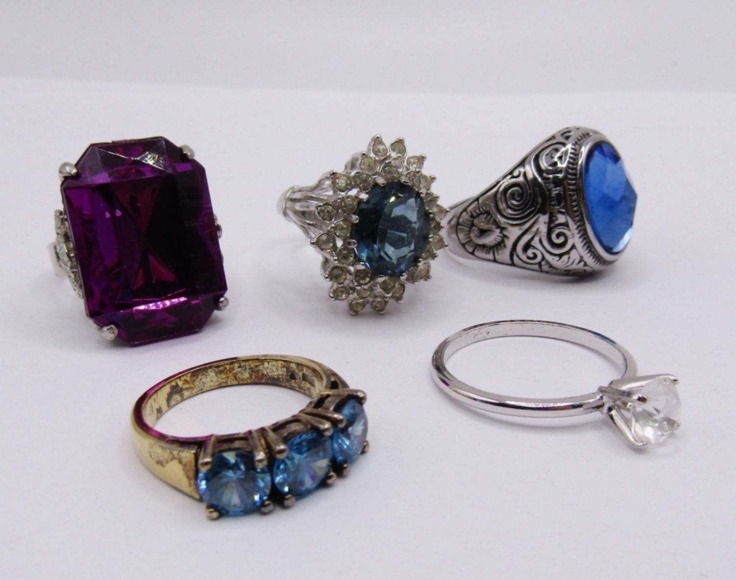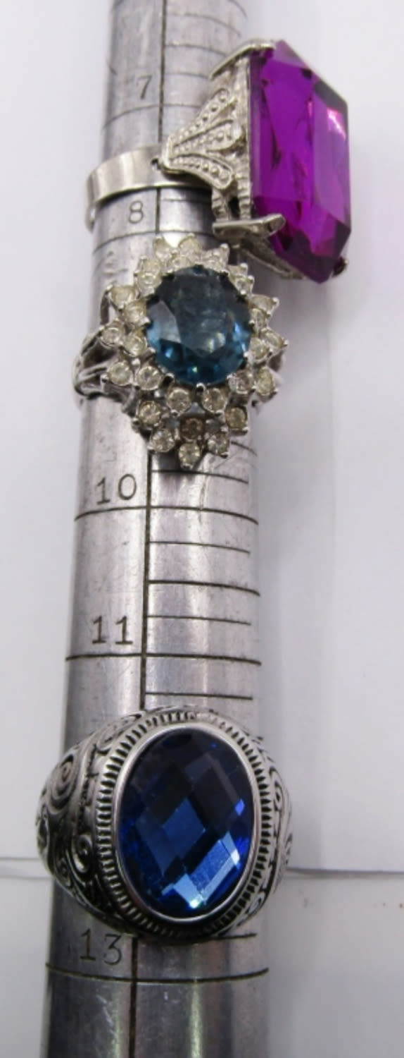 LOT OF 5 SILVER TONE FASHION COSTUME COCKTAIL BLING RINGS, PURPLE BLUE CLEAR STONES, SIZES 9-11.