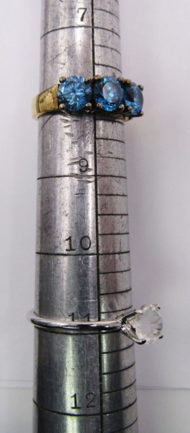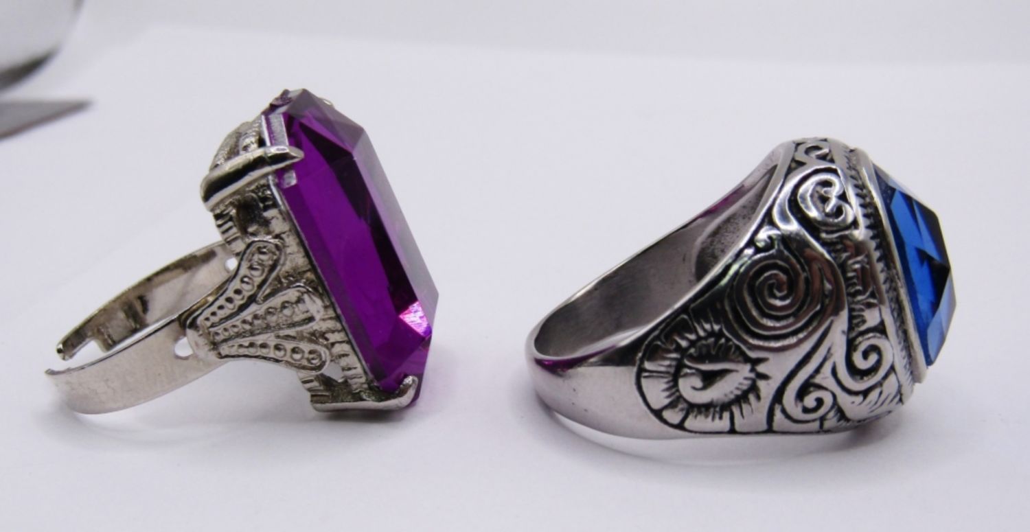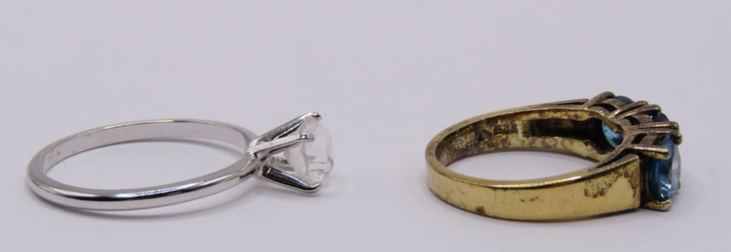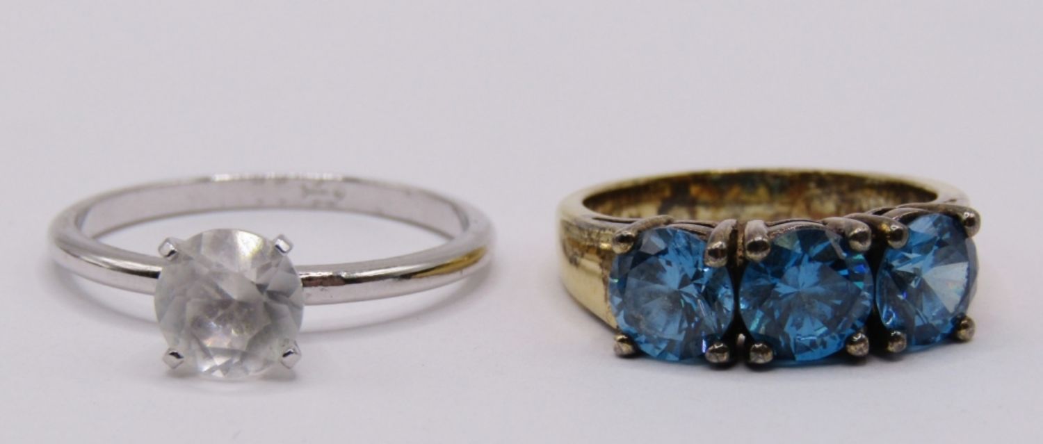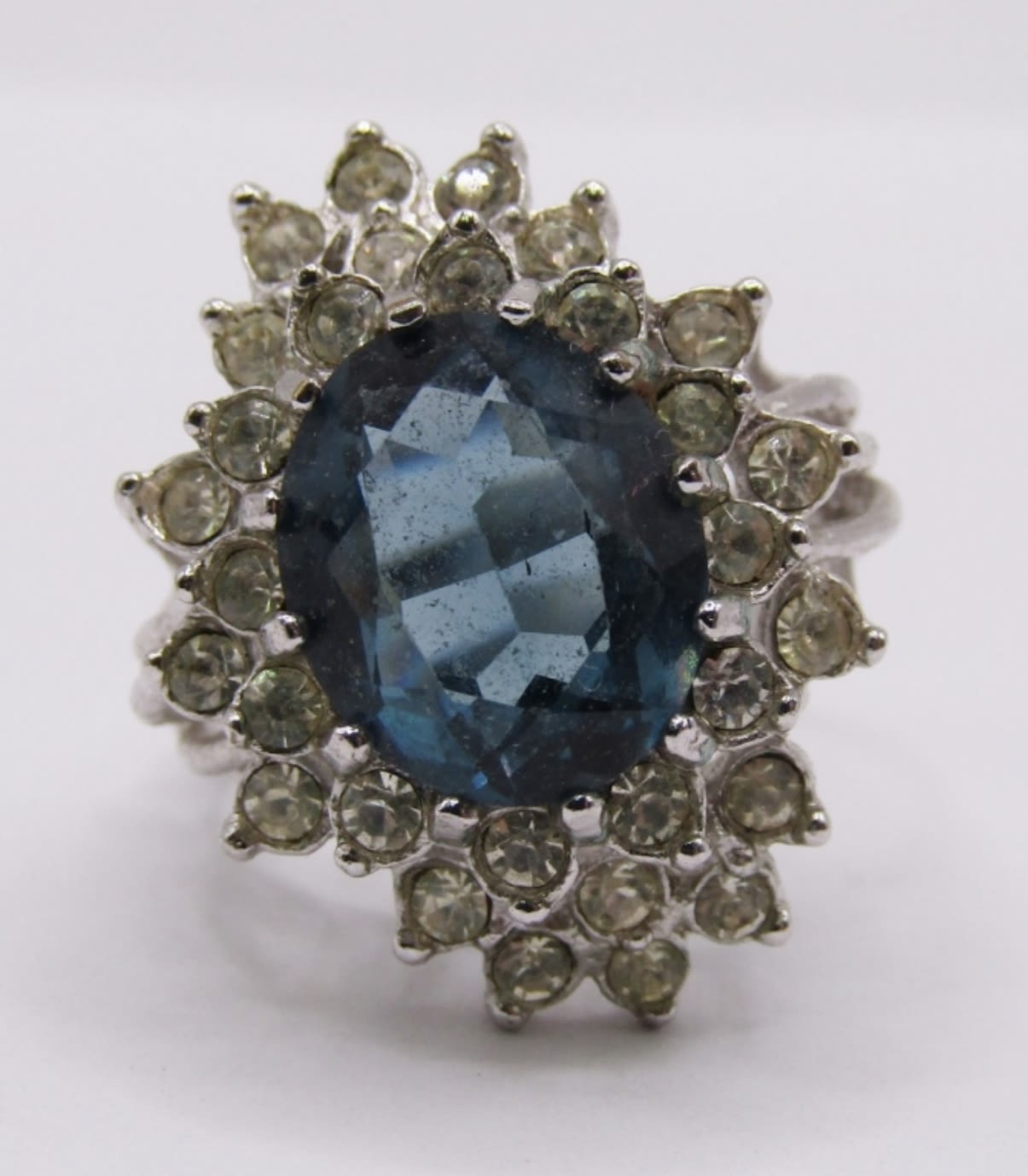 LOT OF 5 SILVER TONE FASHION COSTUME COCKTAIL BLING RINGS, PURPLE BLUE CLEAR STONES, SIZES 9-11.