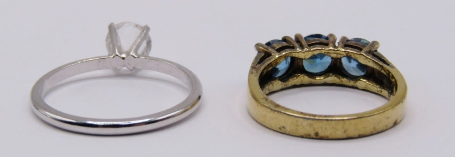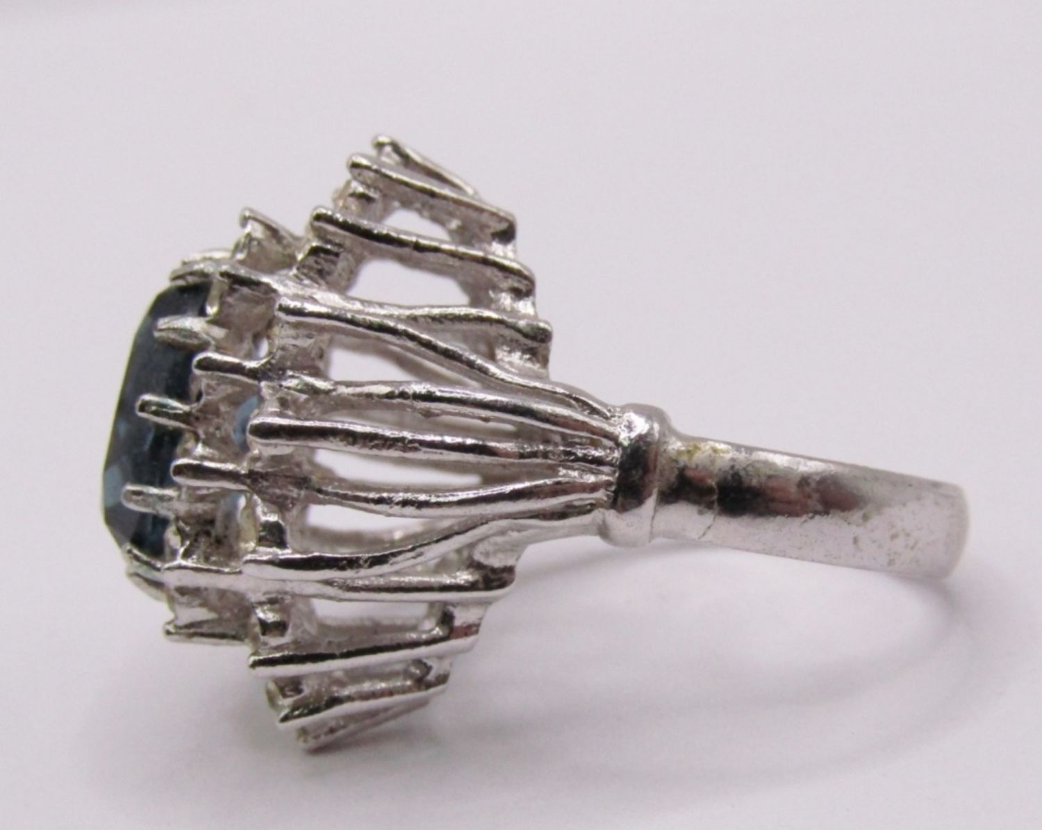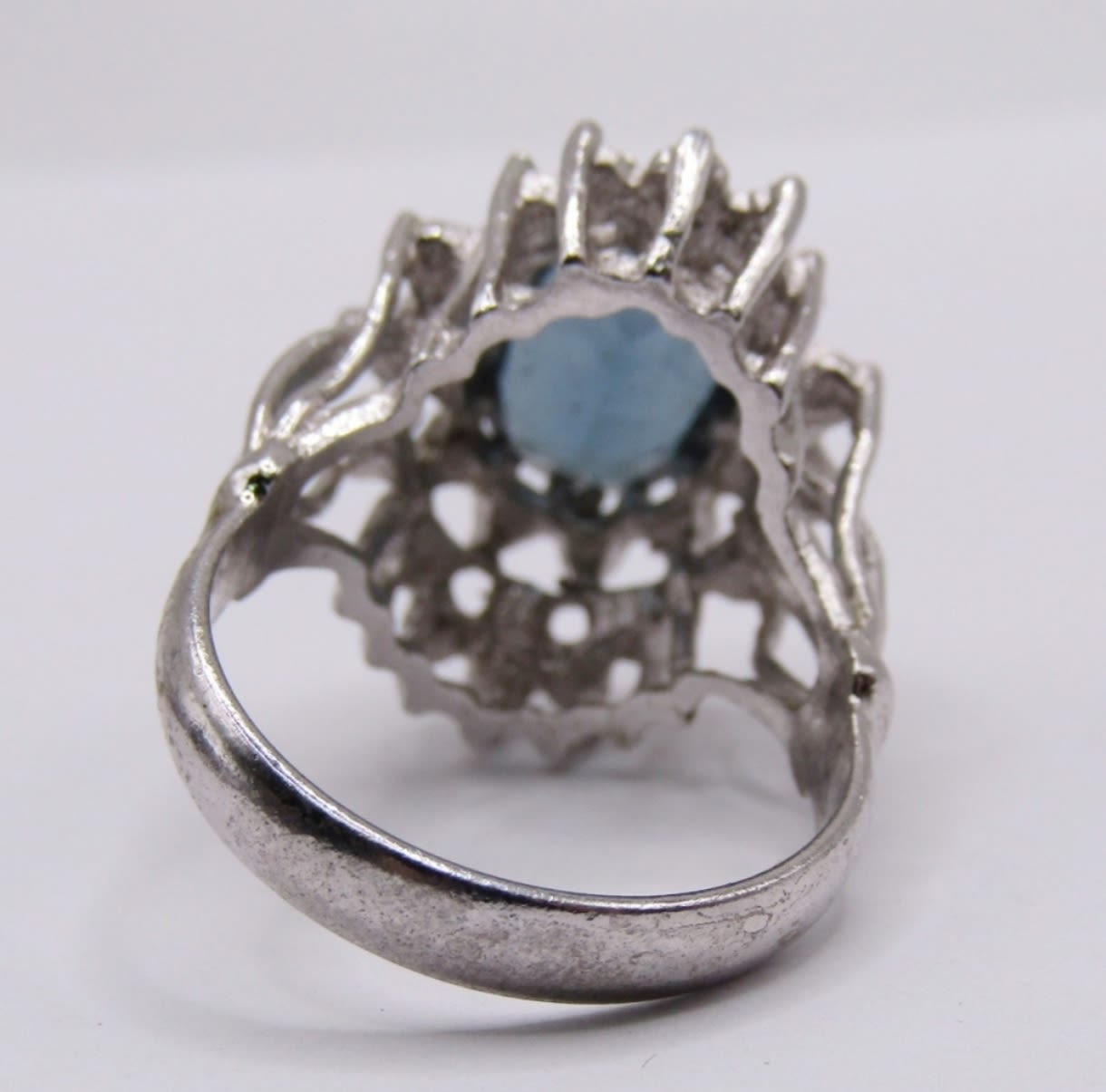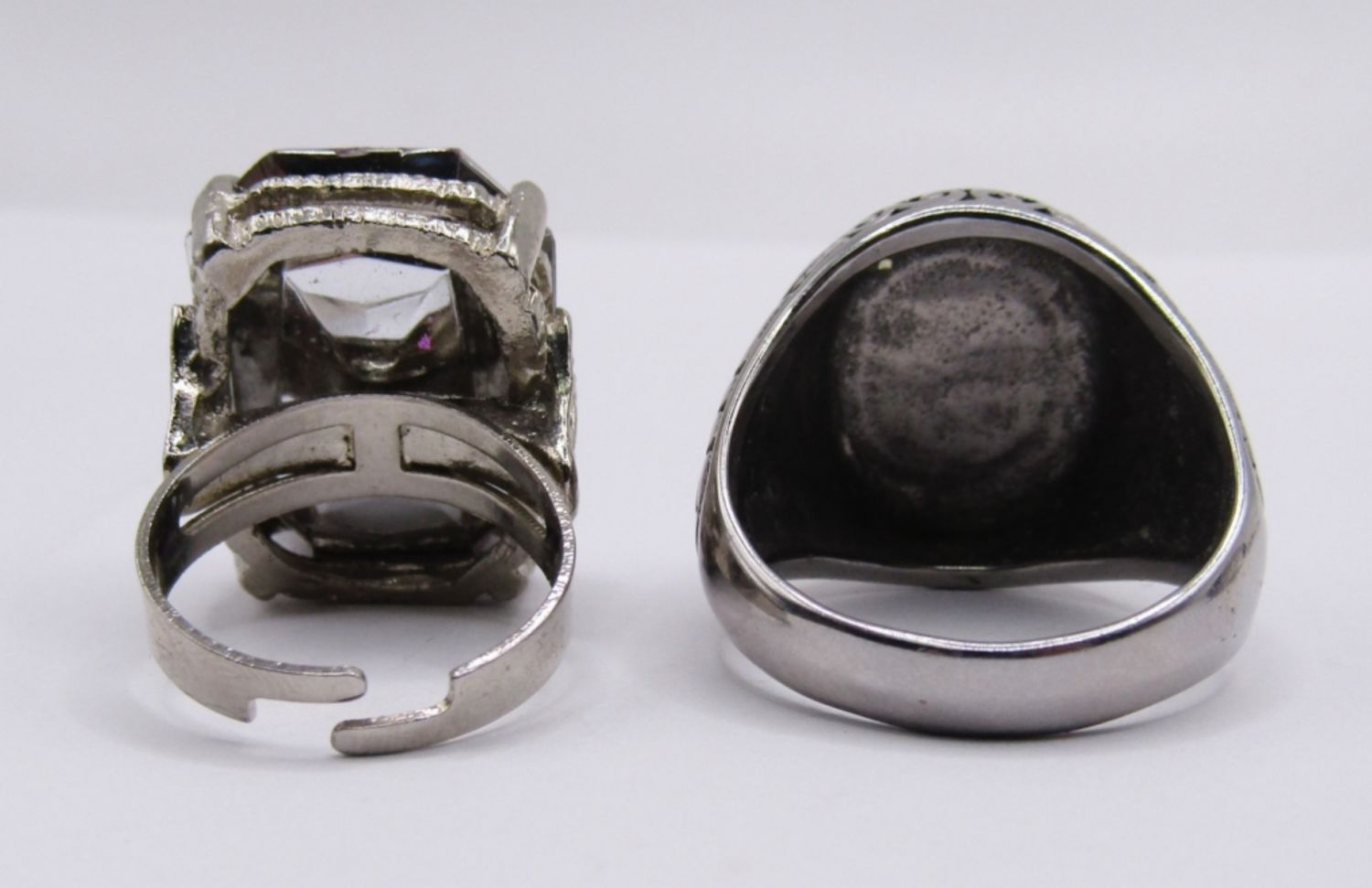 LOT OF 5 SILVER TONE FASHION COSTUME COCKTAIL BLING RINGS, PURPLE BLUE CLEAR STONES, SIZES 9-11.