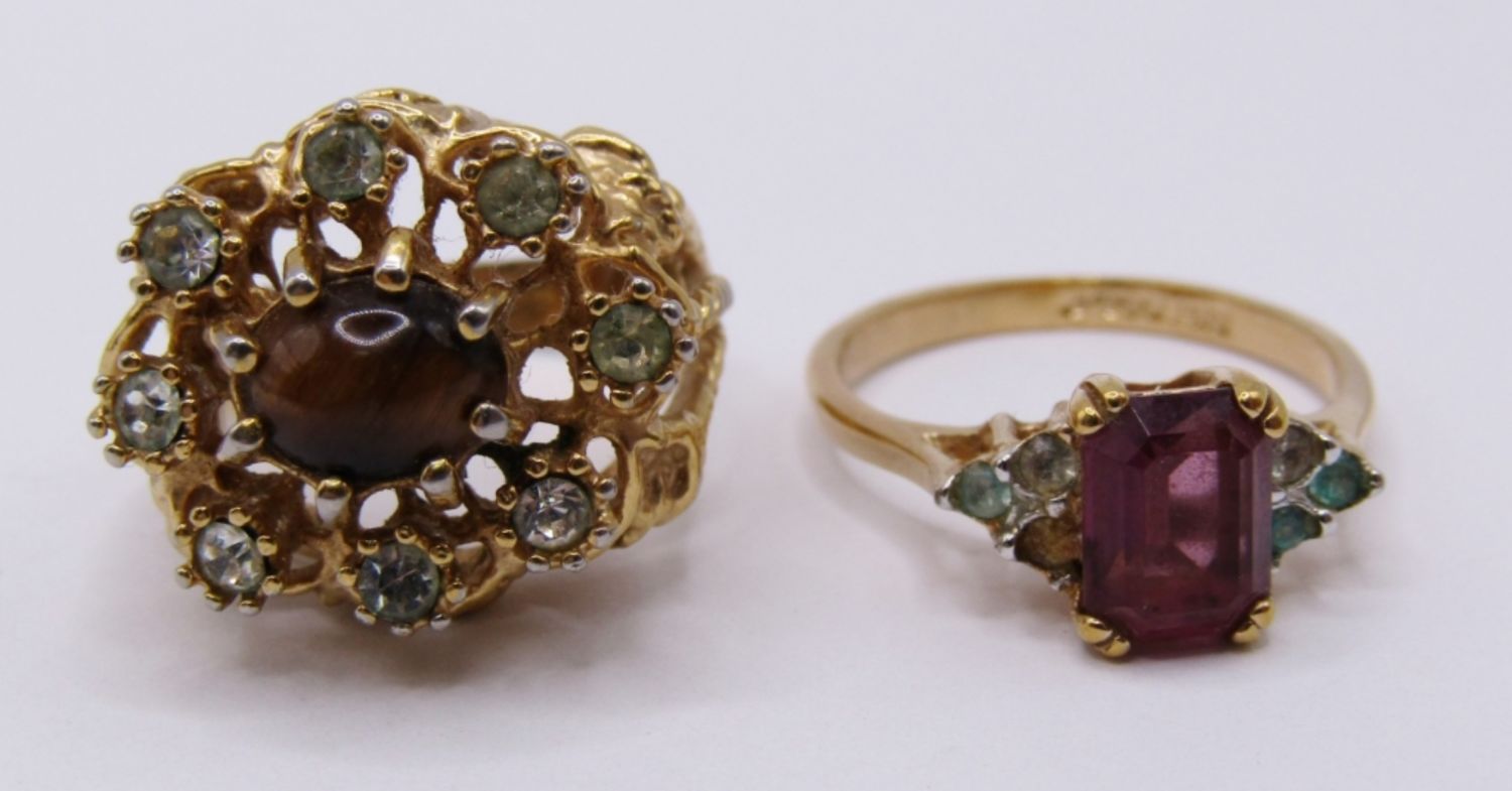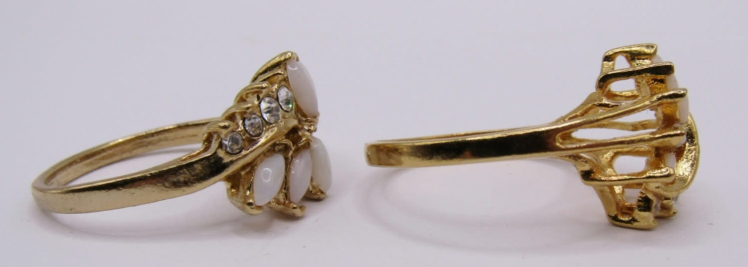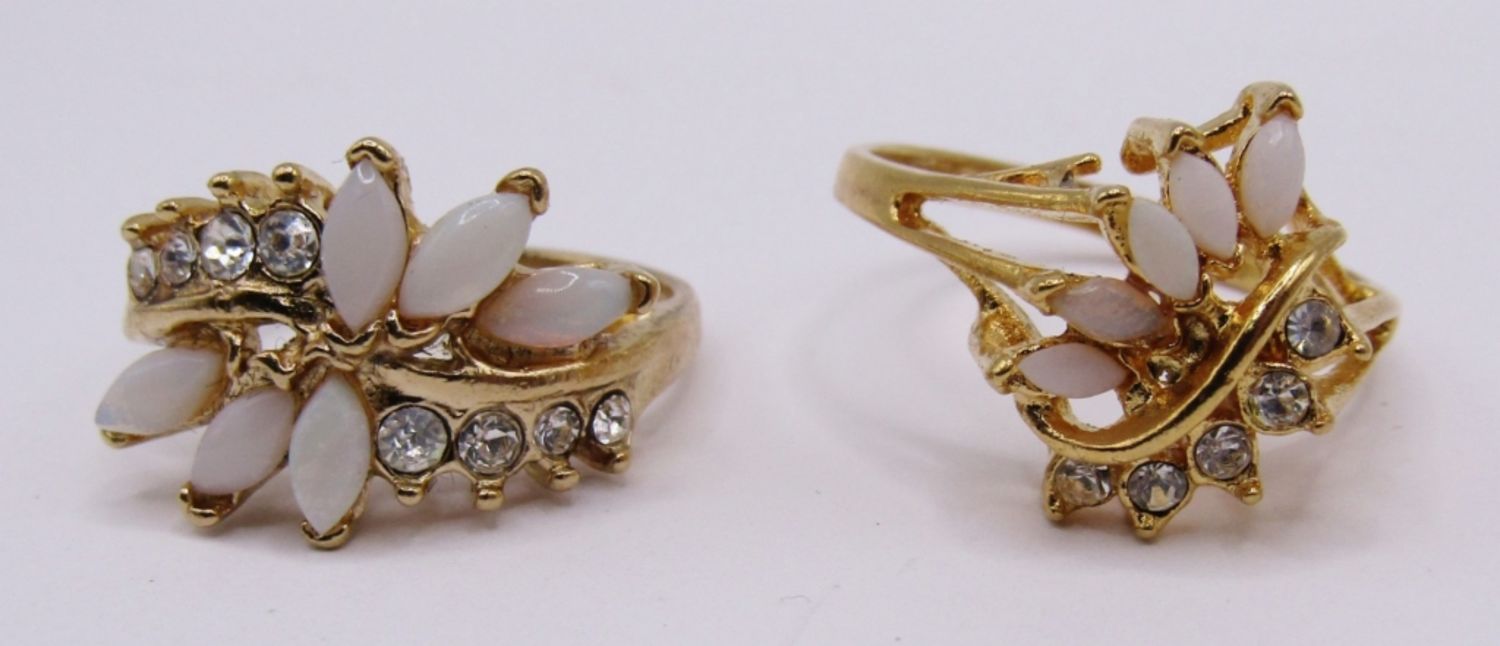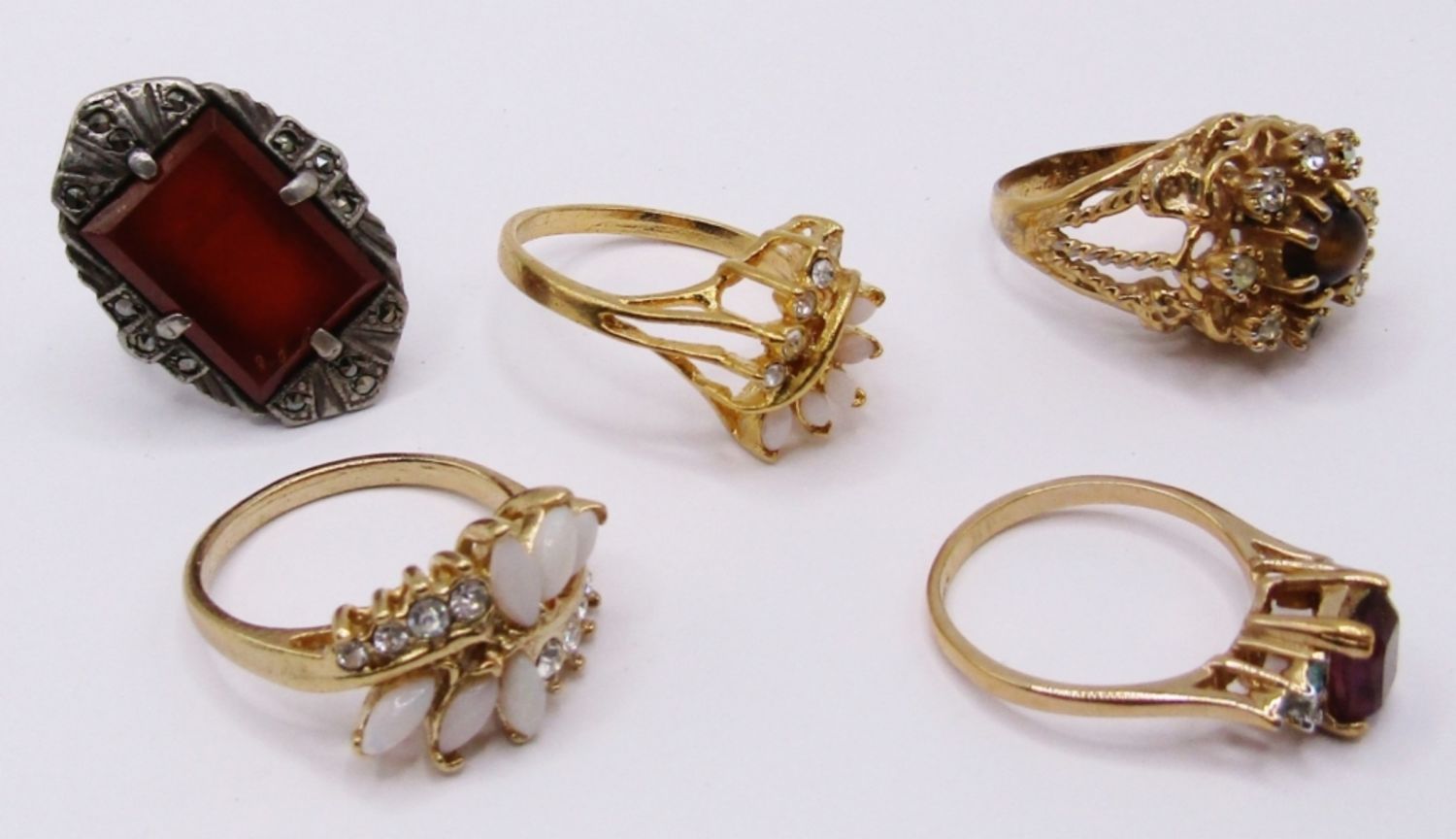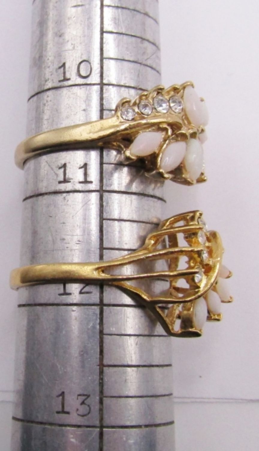 LOT OF 5 SILVER AND GOLD TONE FASHION COSTUME COCKTAIL RINGS, FAUX PEARL DIAMOND CATS EYE VARIOUS GEMS, SIZES 6-11.
