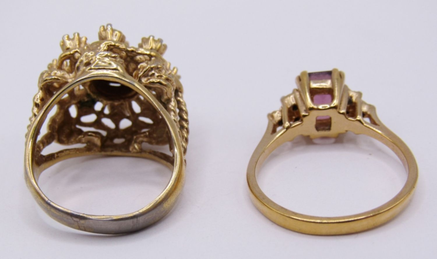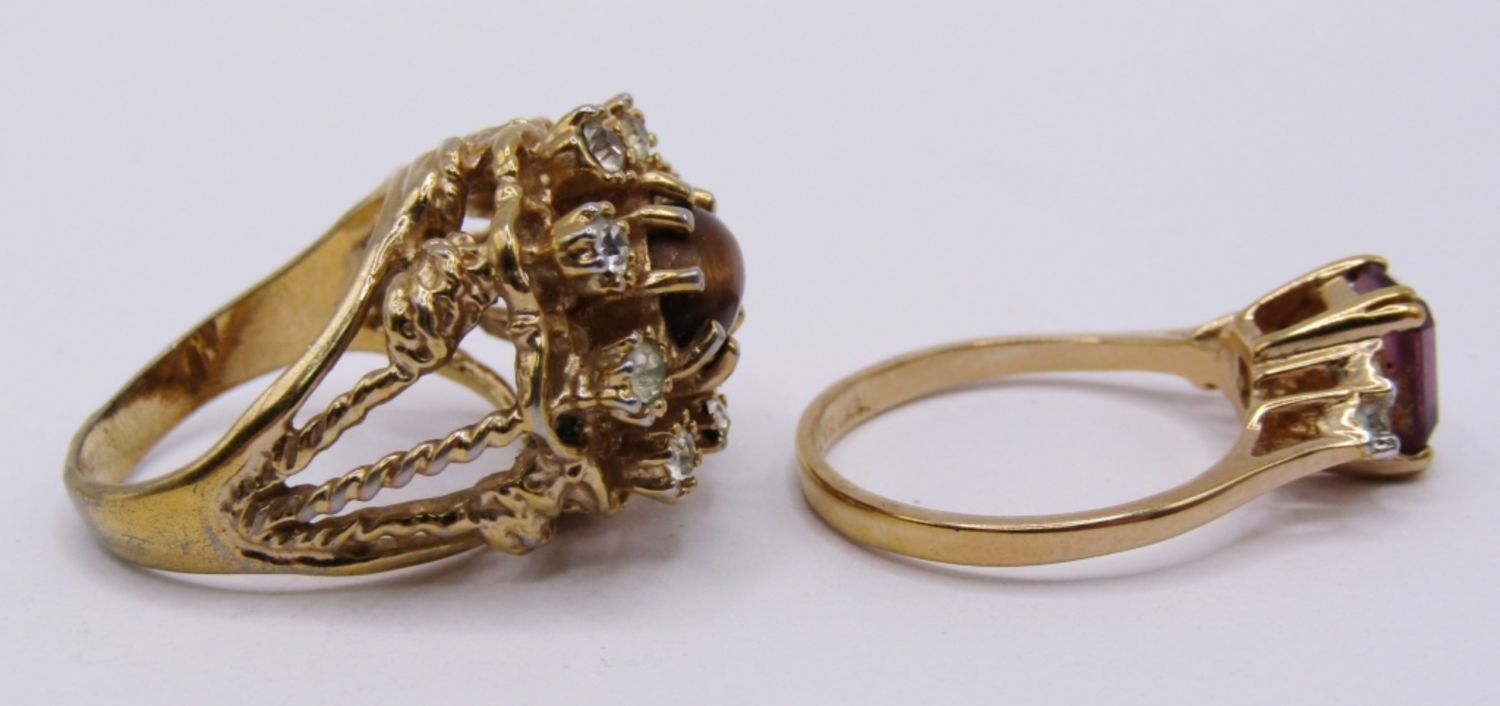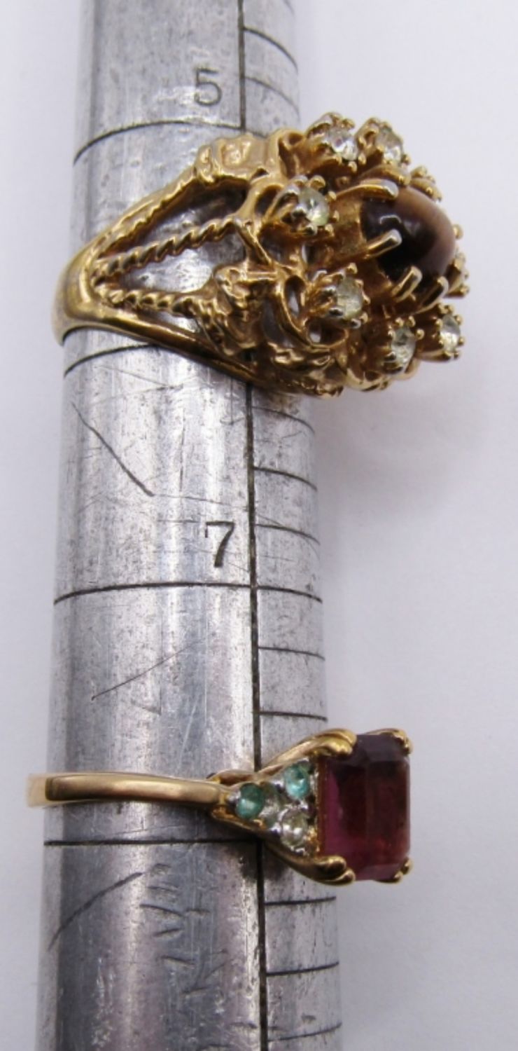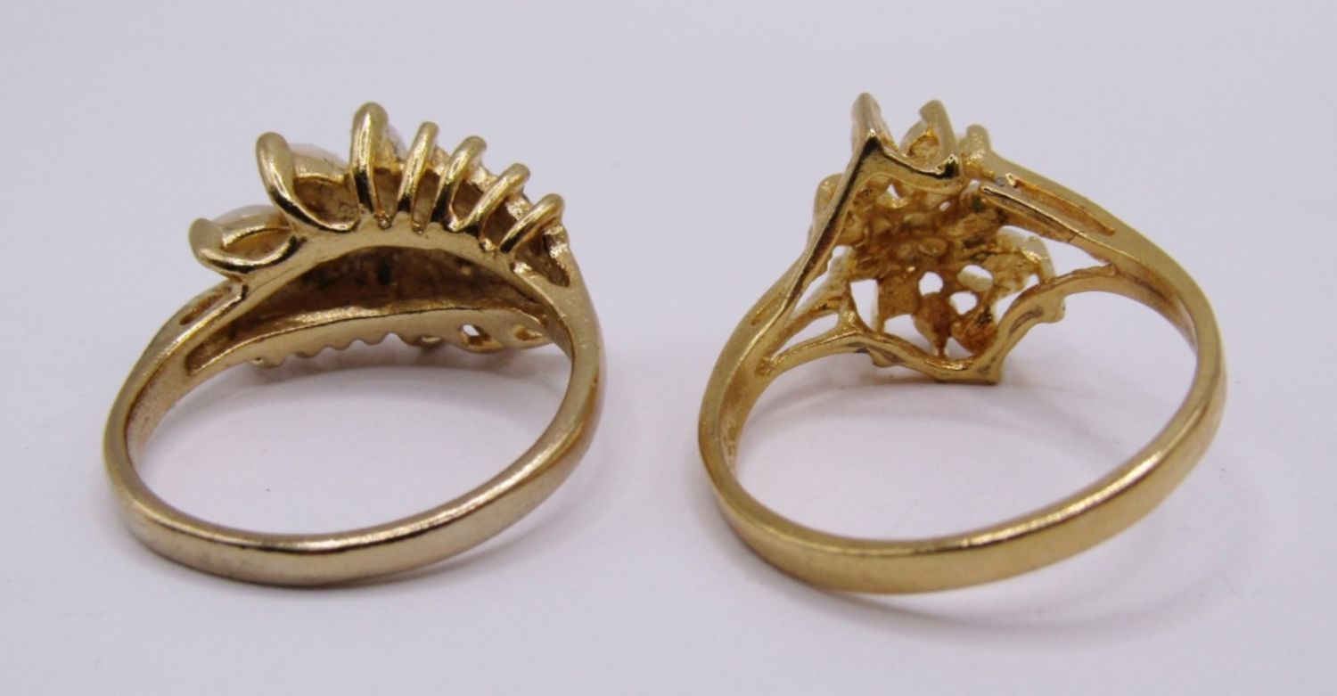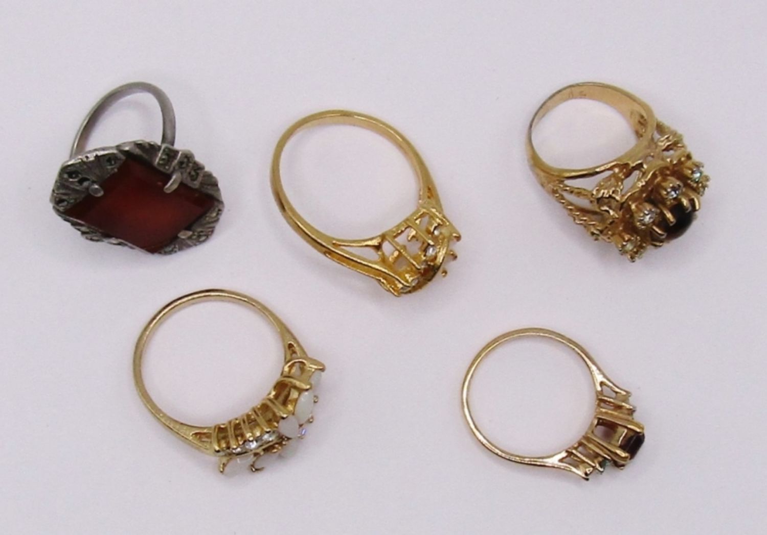 LOT OF 5 SILVER AND GOLD TONE FASHION COSTUME COCKTAIL RINGS, FAUX PEARL DIAMOND CATS EYE VARIOUS GEMS, SIZES 6-11.