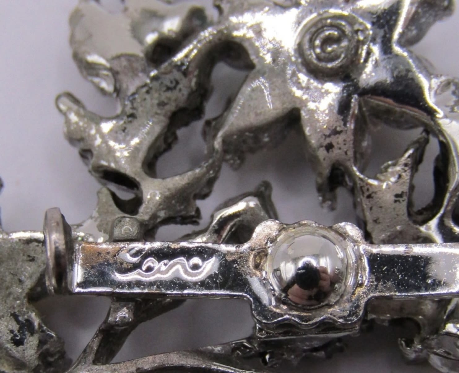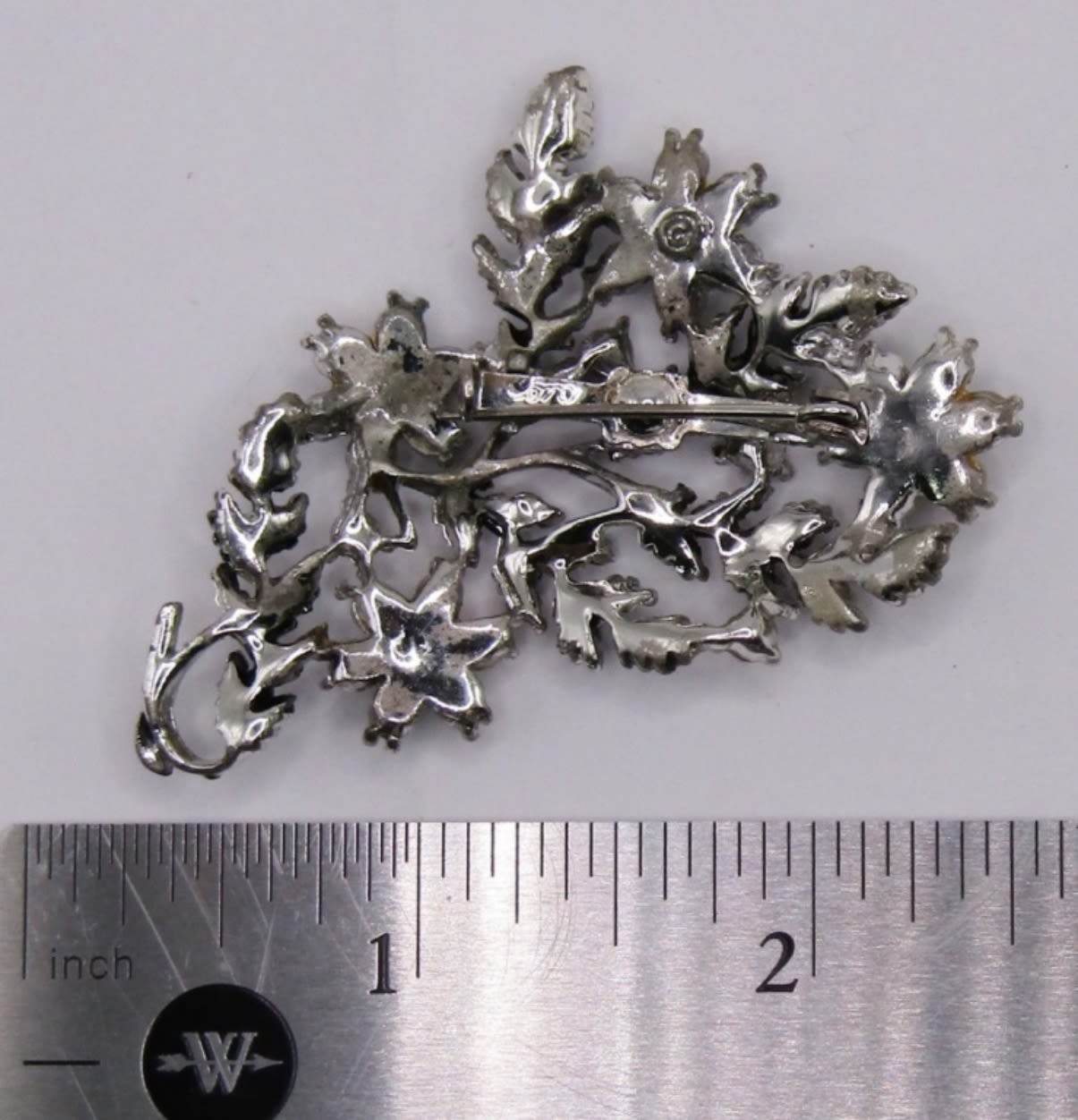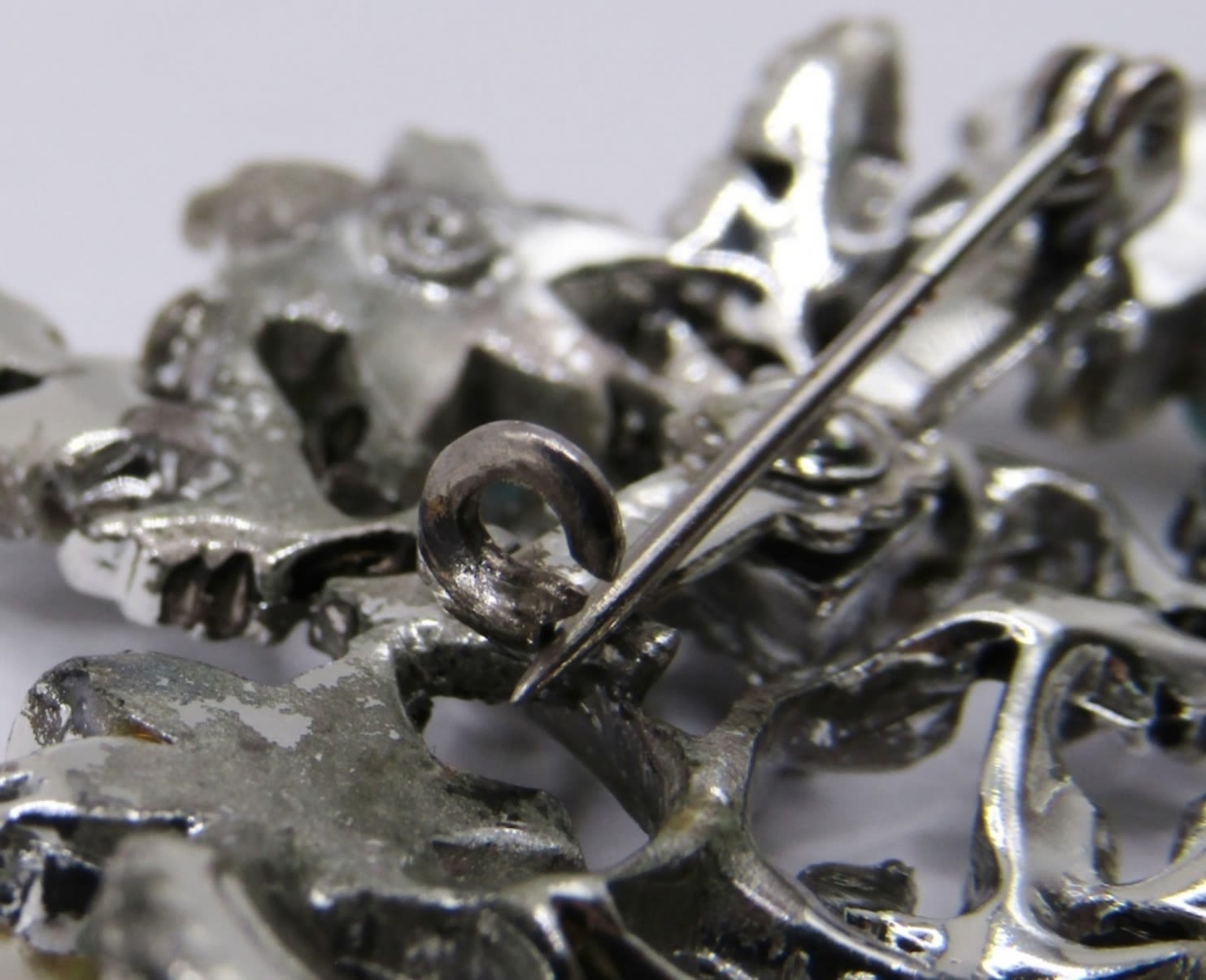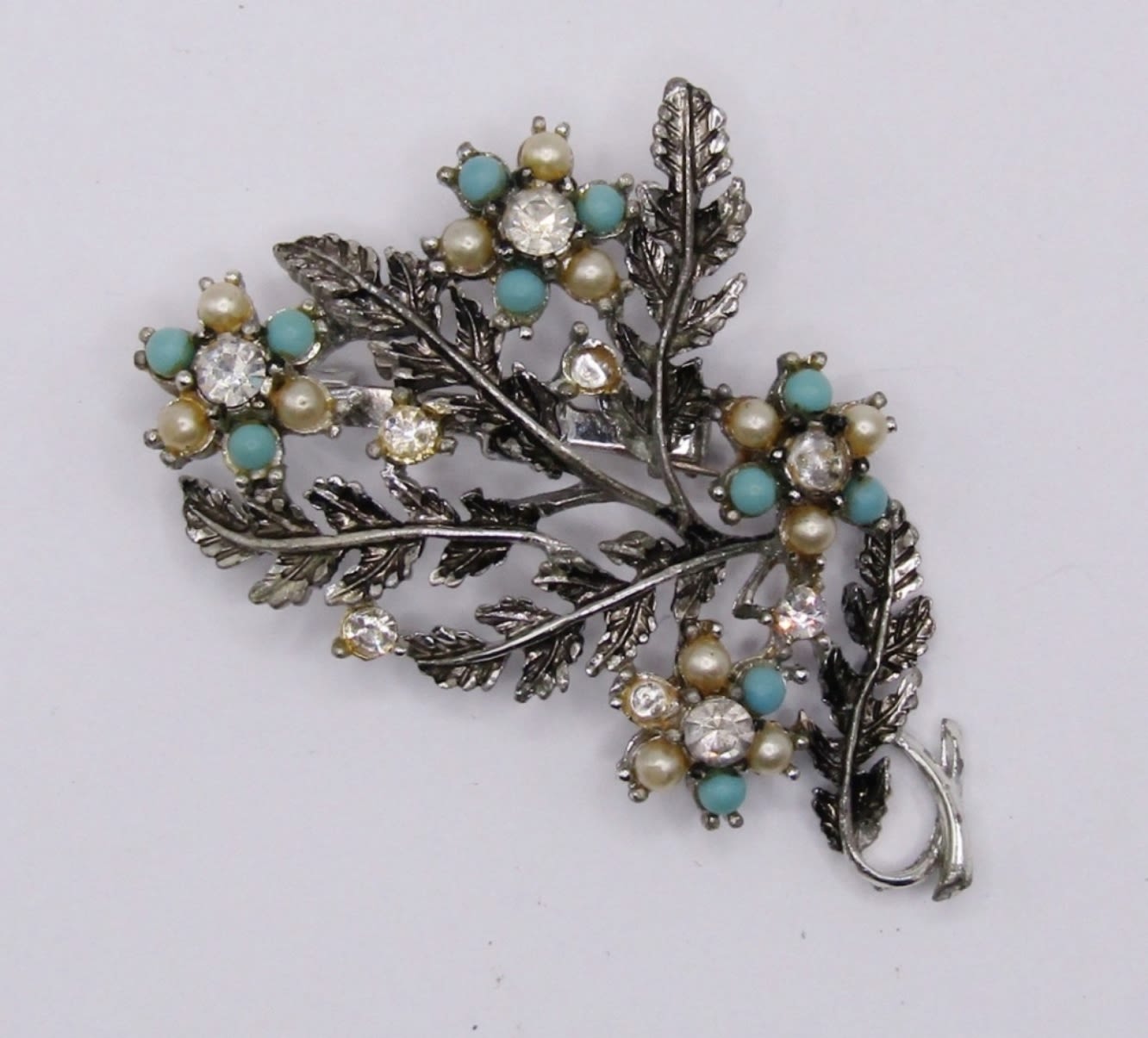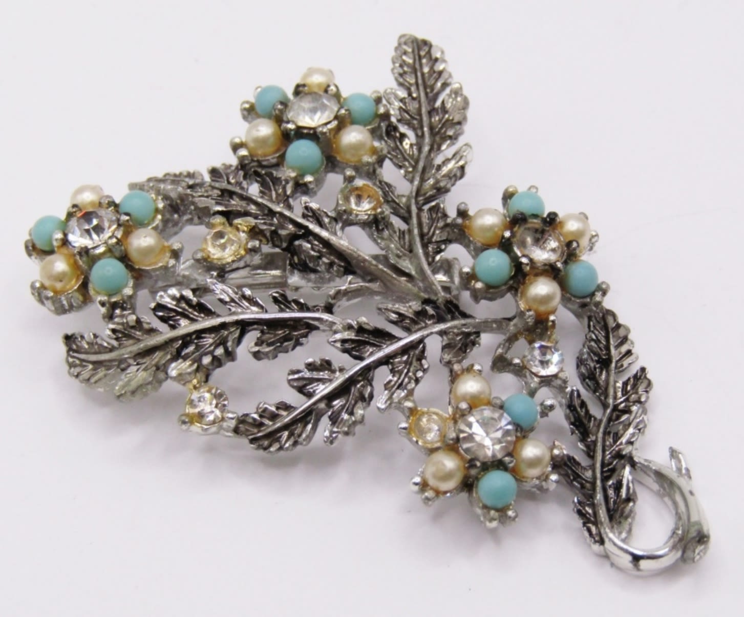 SPARKLY BLINGY BROOCH SILVER TONE LEAF DESIGN FAUX PEARL DIAMOND TURQUOISE STONES. MISSING PART OF CLOSURE.