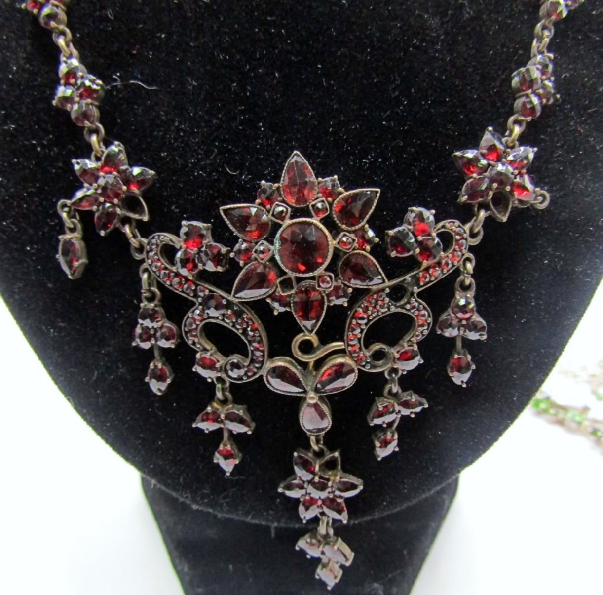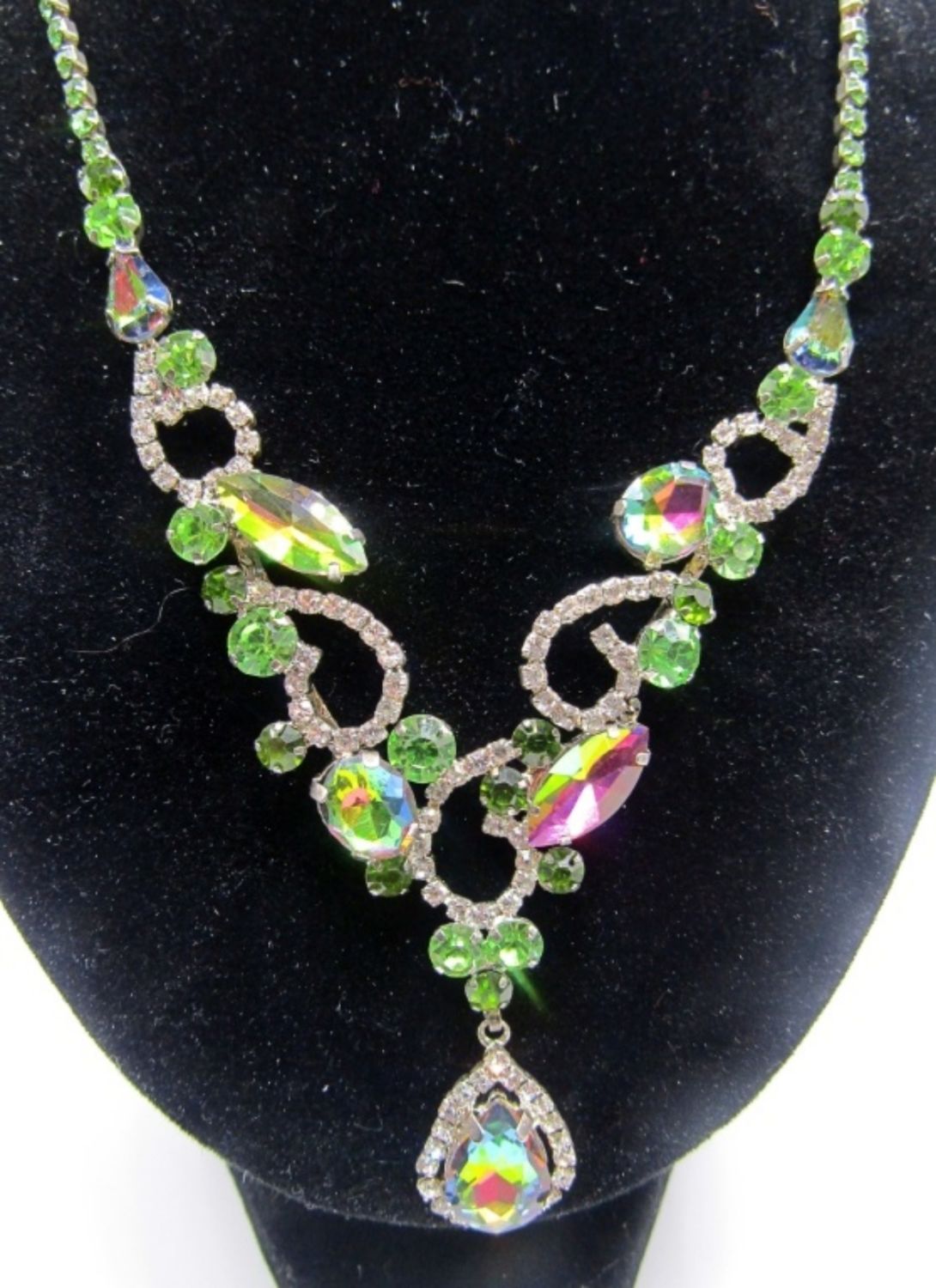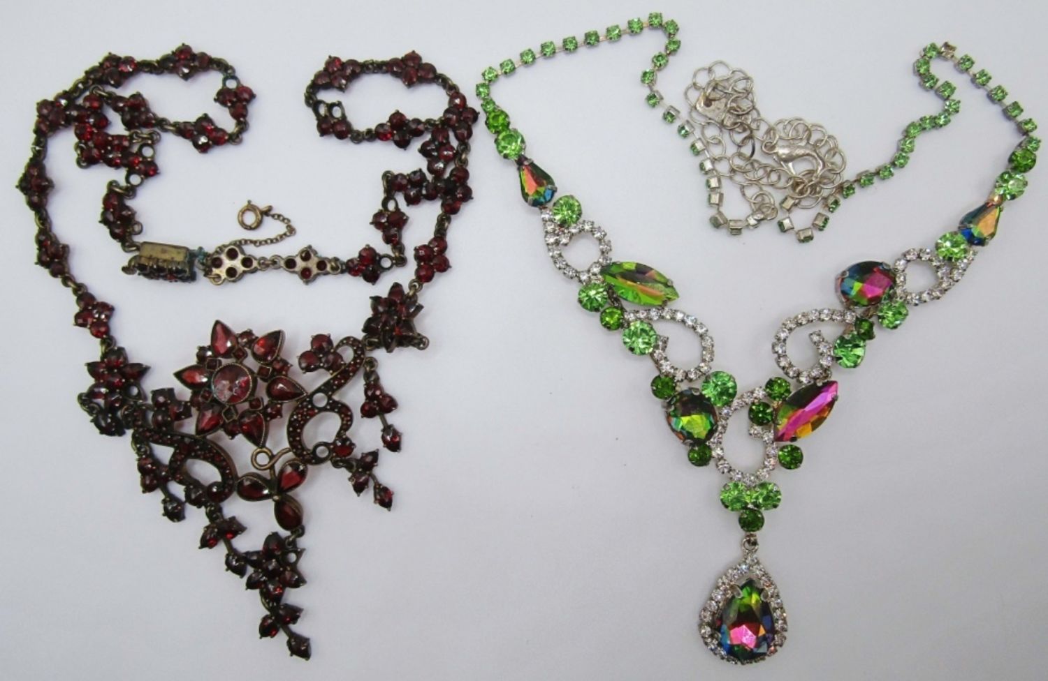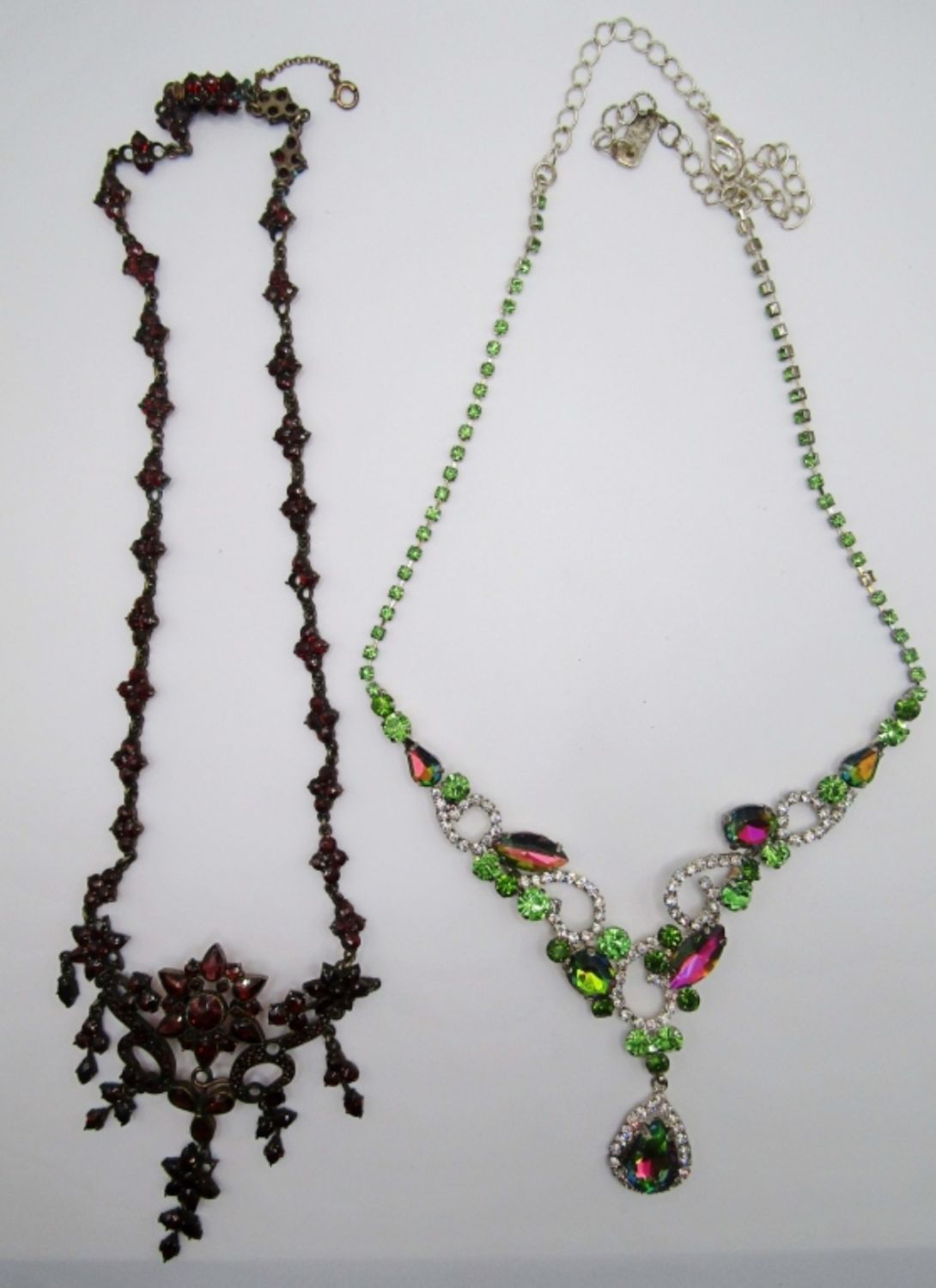 ONE RED STONE NECKLACE 17IN LENGTH, OPEN BOX CLASP, SECOND PINK GREEN CLEAR STONES. ABOUT 22IN IN LENGTH AND ADJUSTABLE