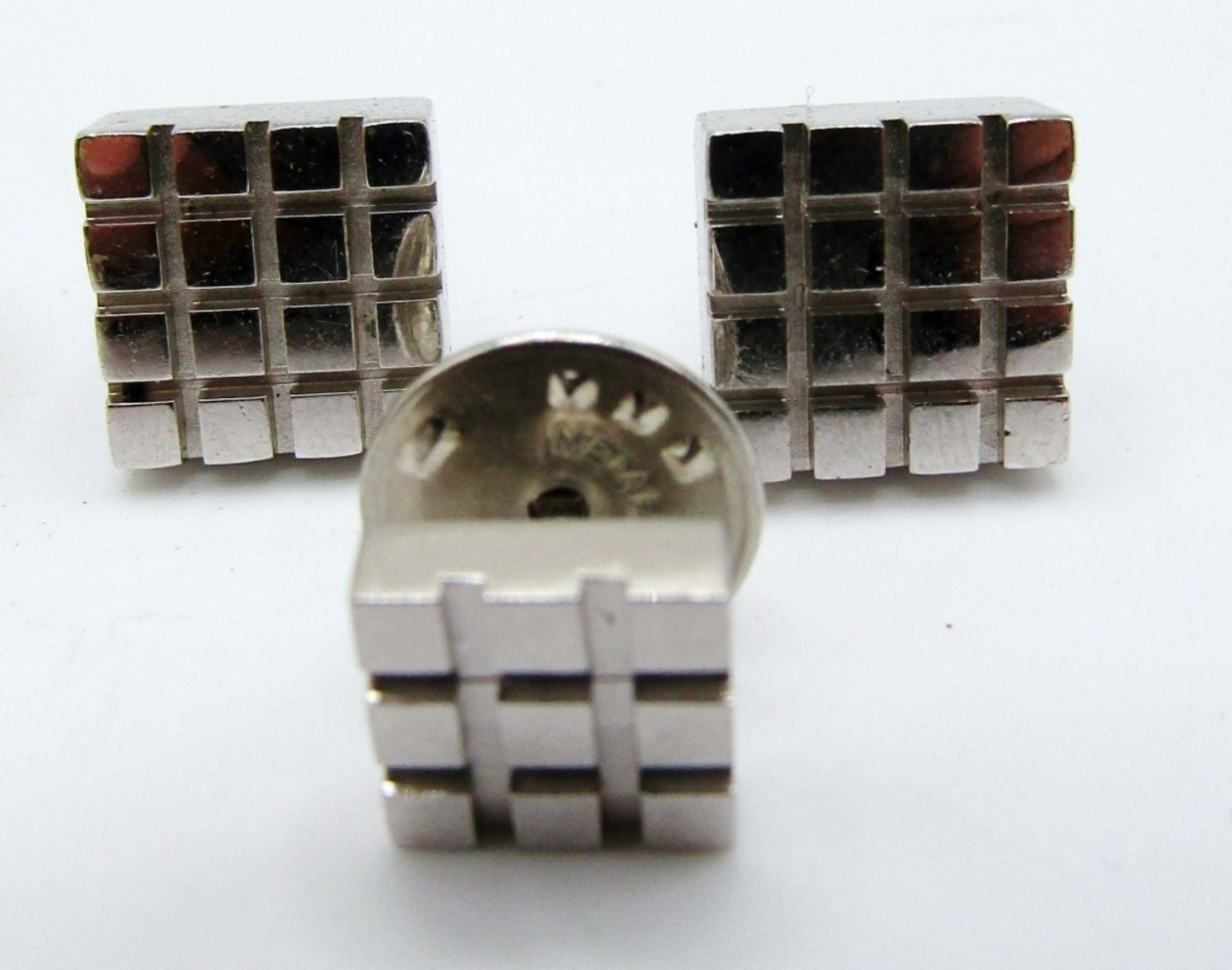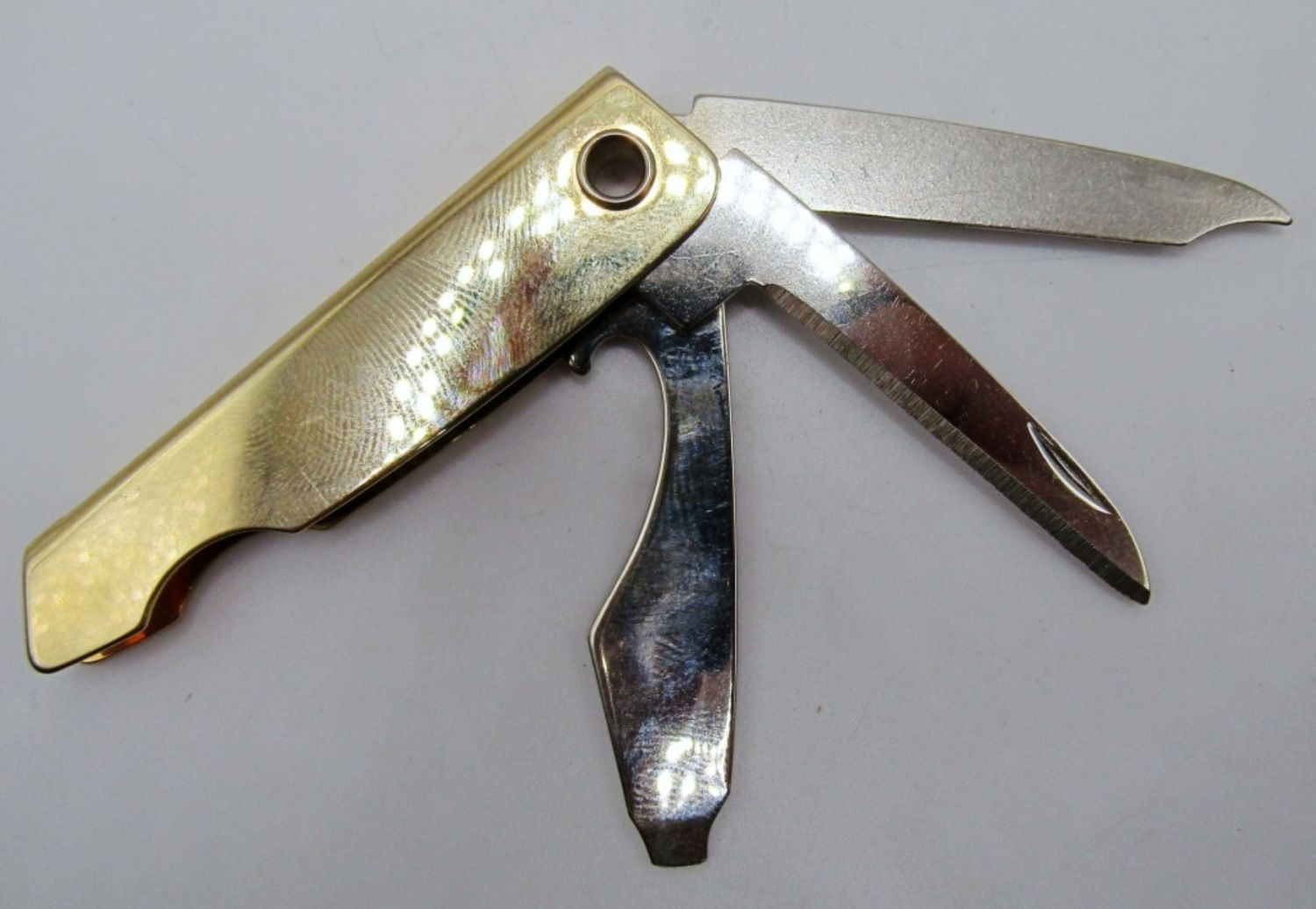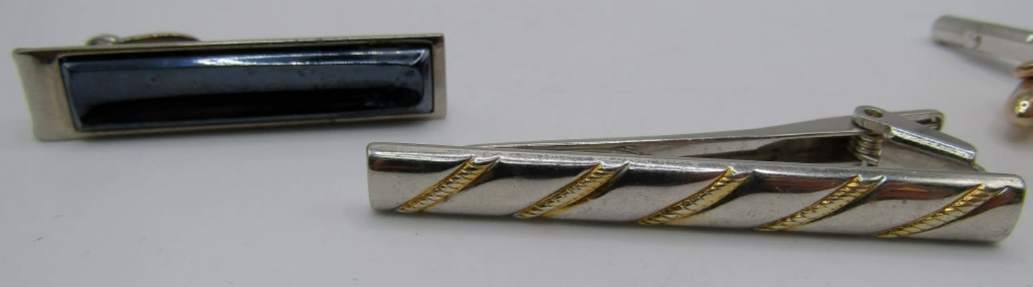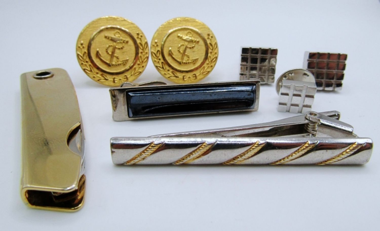 BOTH ARE BULLET BACK STYLE, STAMPED WITH MAKER, MATCHING TIE TAG FOR THE DESTINO CUFFLINKS, A GOLD TONE POCKET KNIFE, 2 TIE CLIP