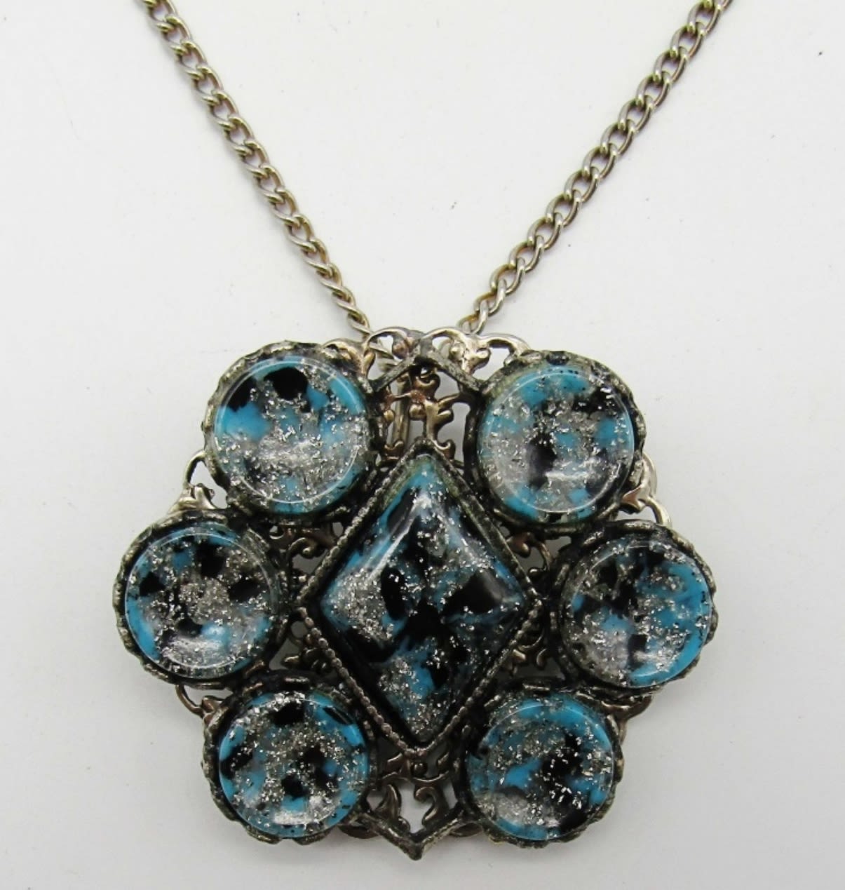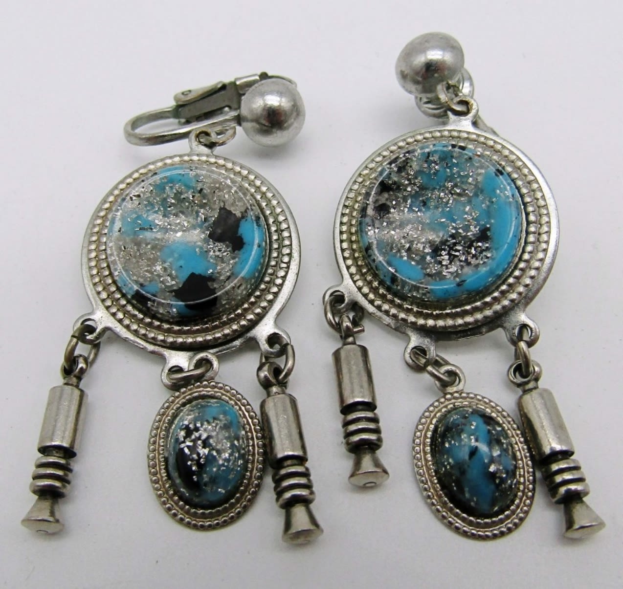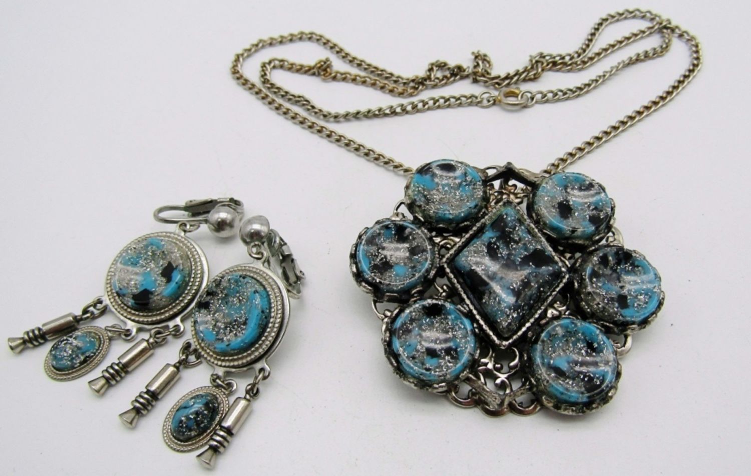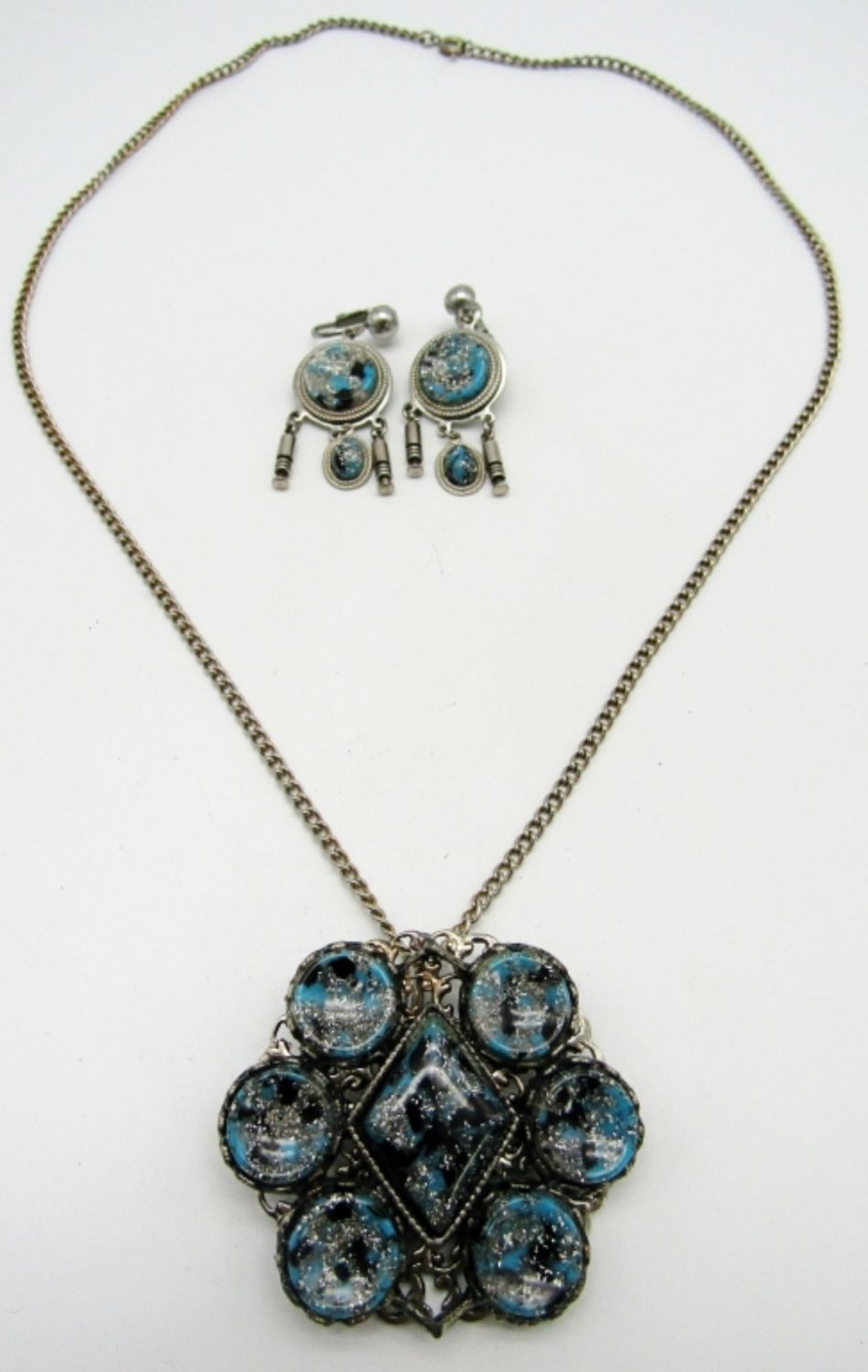 BLUE NATURAL STONE WITH BLACK AND SLIVER SPLATTERED DESIGN ON PENDANT, MATCHING DANGLE CLIP ON EARRINGS