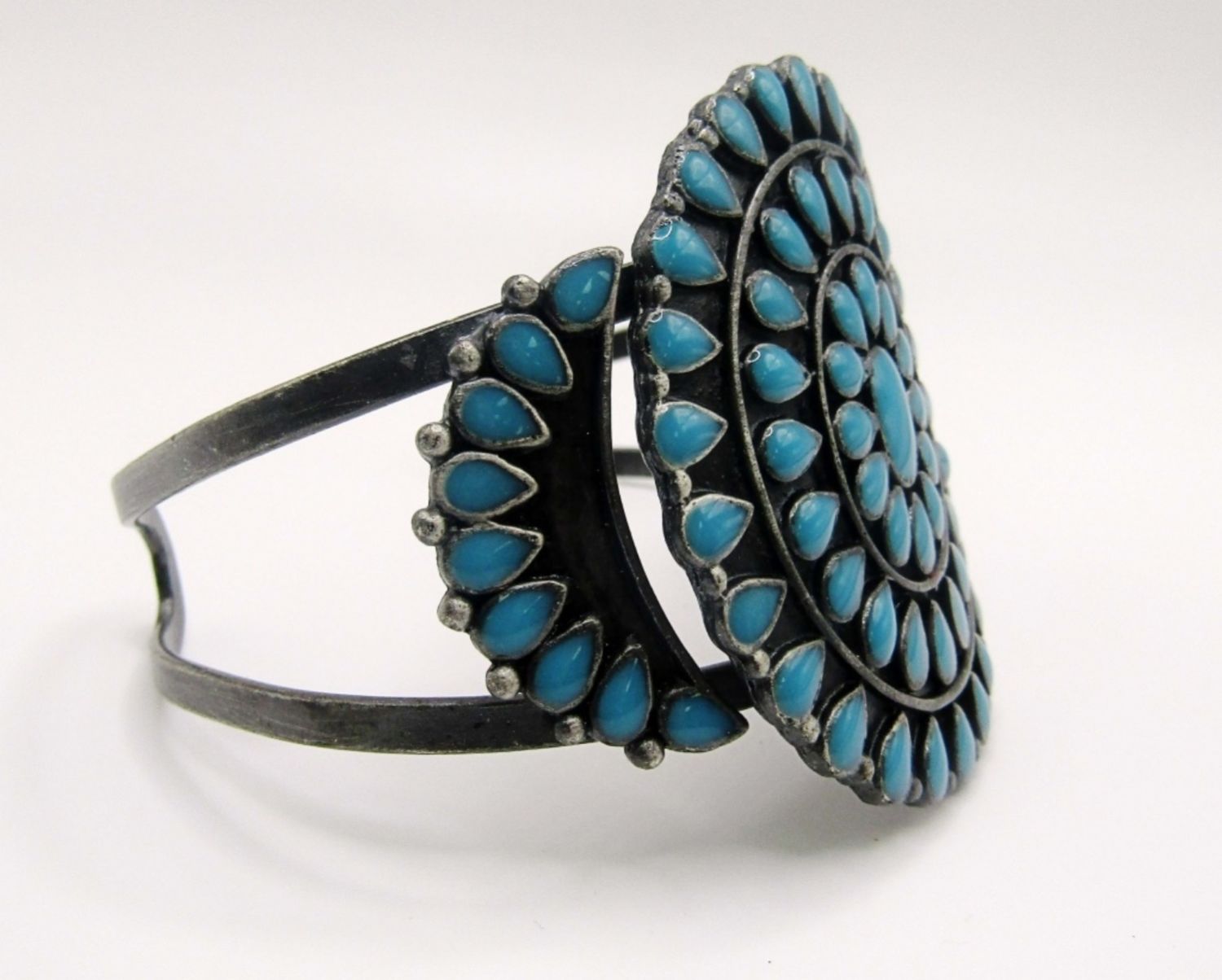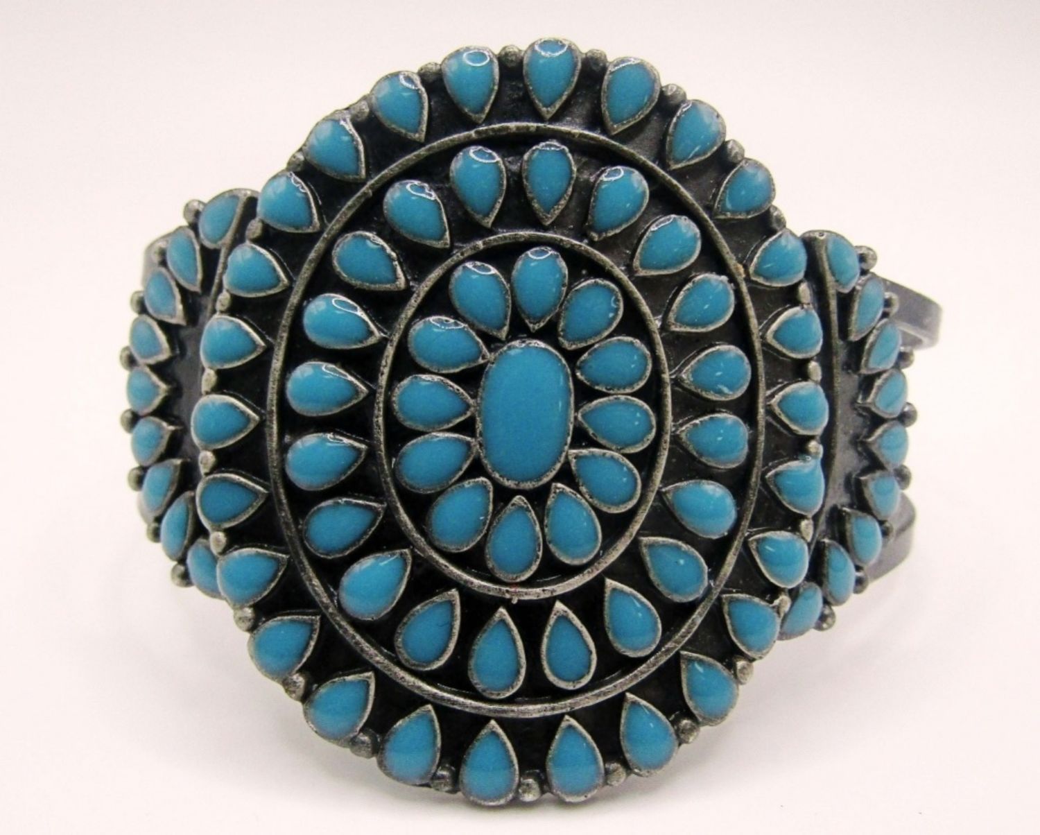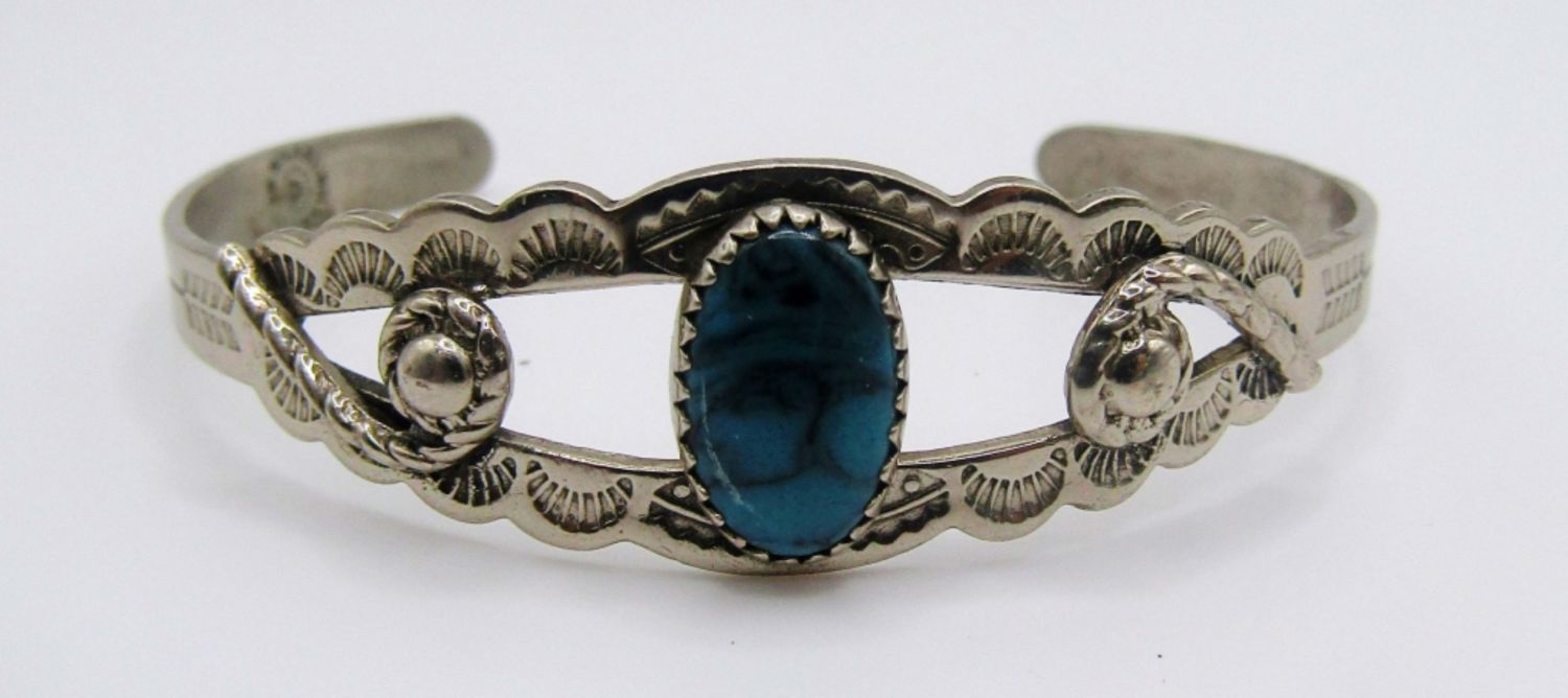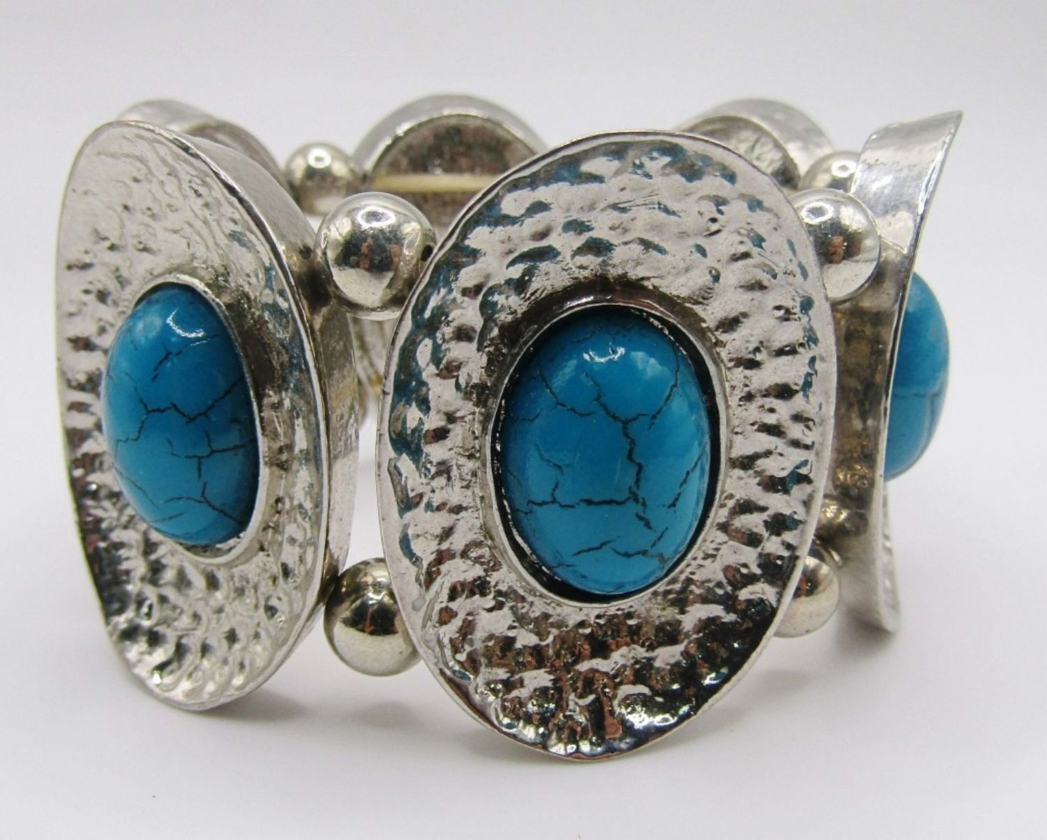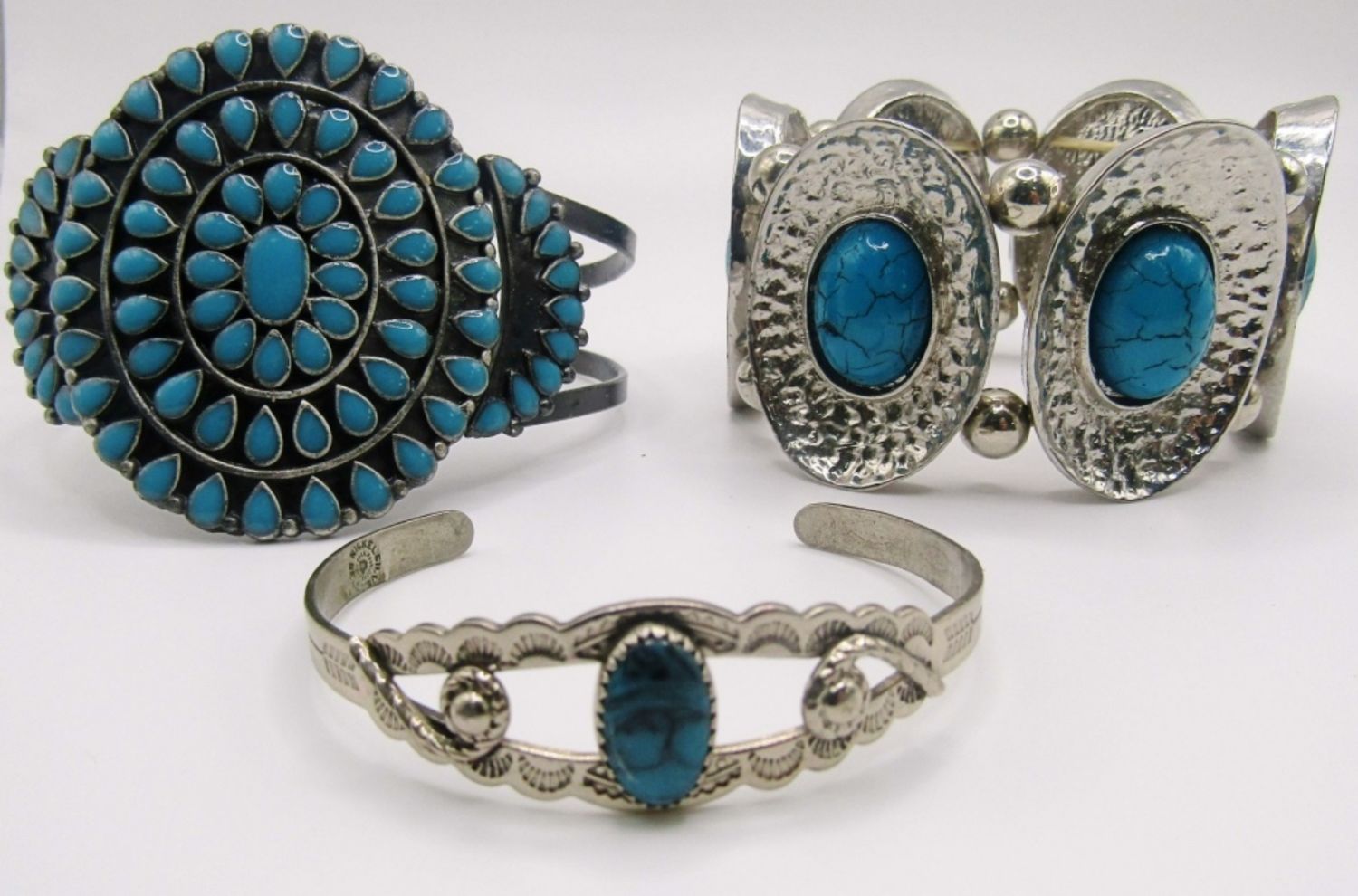 2 CUFFS 6IN WITH GAP, 7IN WITH GAP, 1 STRECHY,BLUE INLAY STONES,