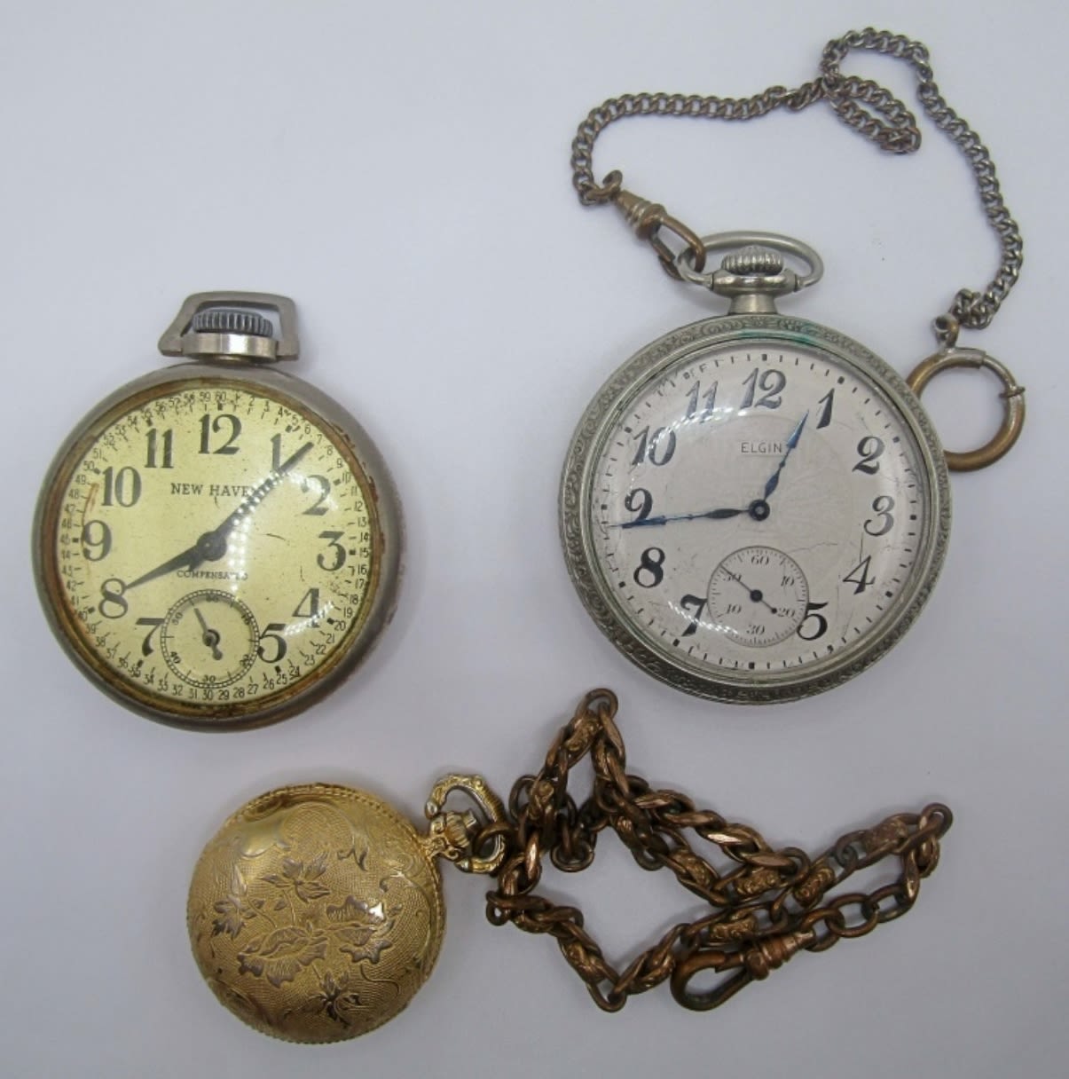2 LARGE ONES BY NEW HAVEN AND ELGIN, ONE SMALL BY WALTHAM, NONE ARE TESTED