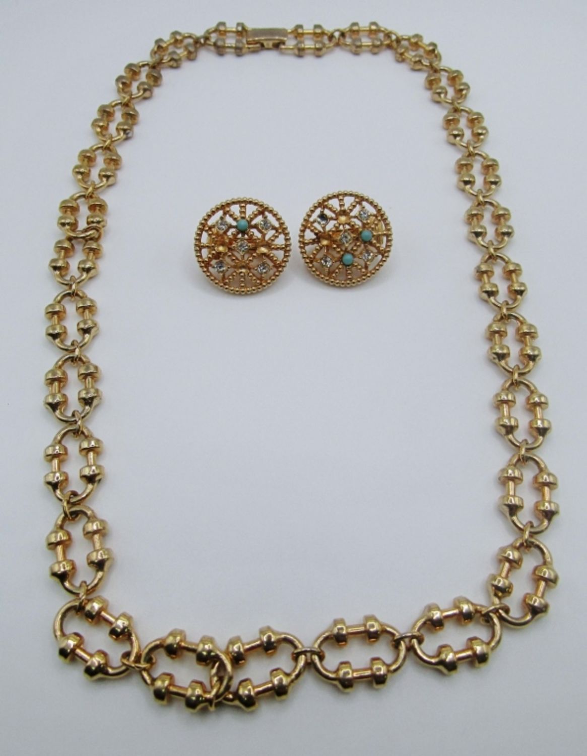 19IN IN LENGTH, STAMPED AVON ON OPEN BOCX CLASP, A PAIR OF STAMPED MARVELLA WITH CLEAR STONE AND A NATURAL STONE BEAD, MISSING SOME BLUE STONES EASY TO REPAIR