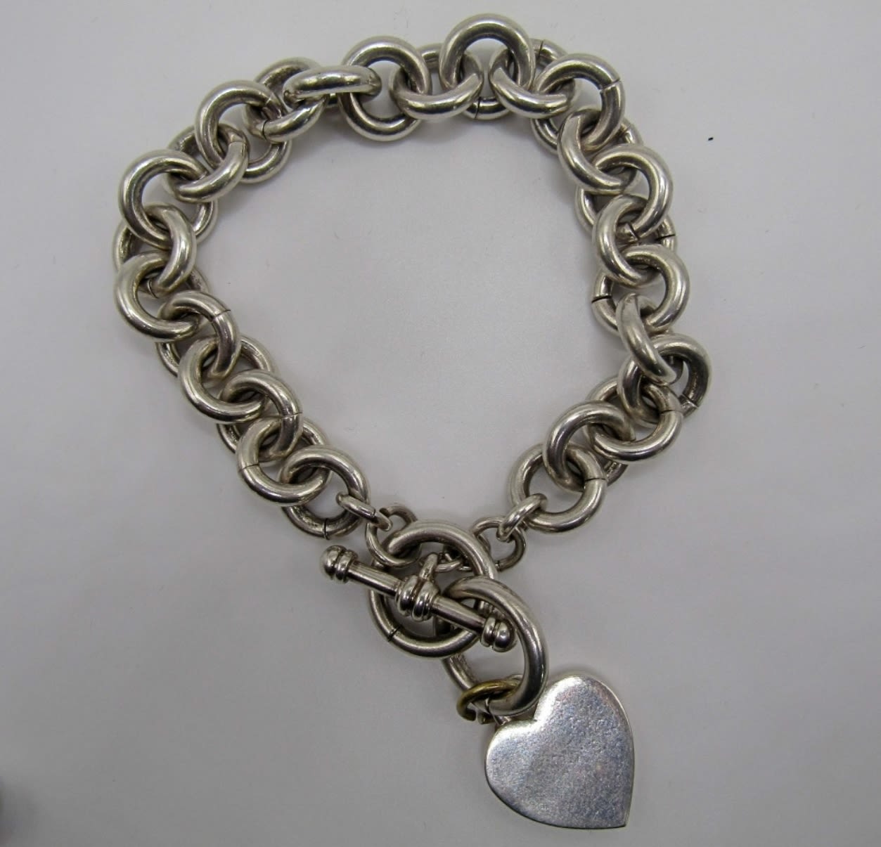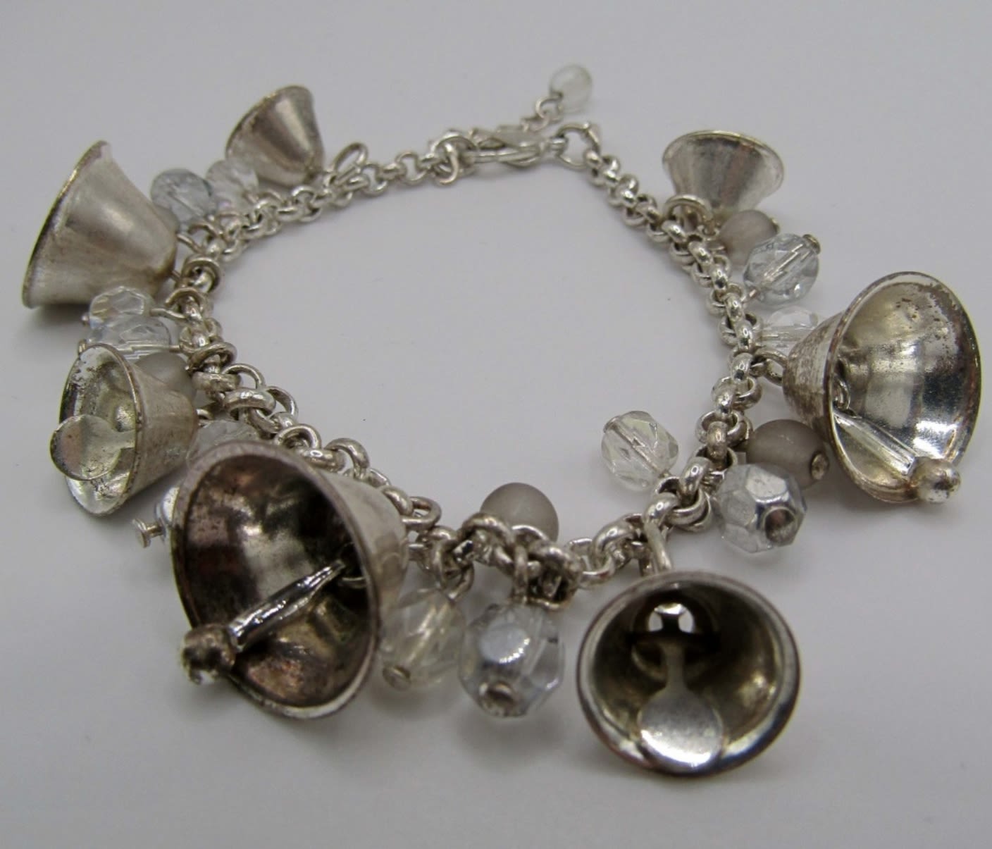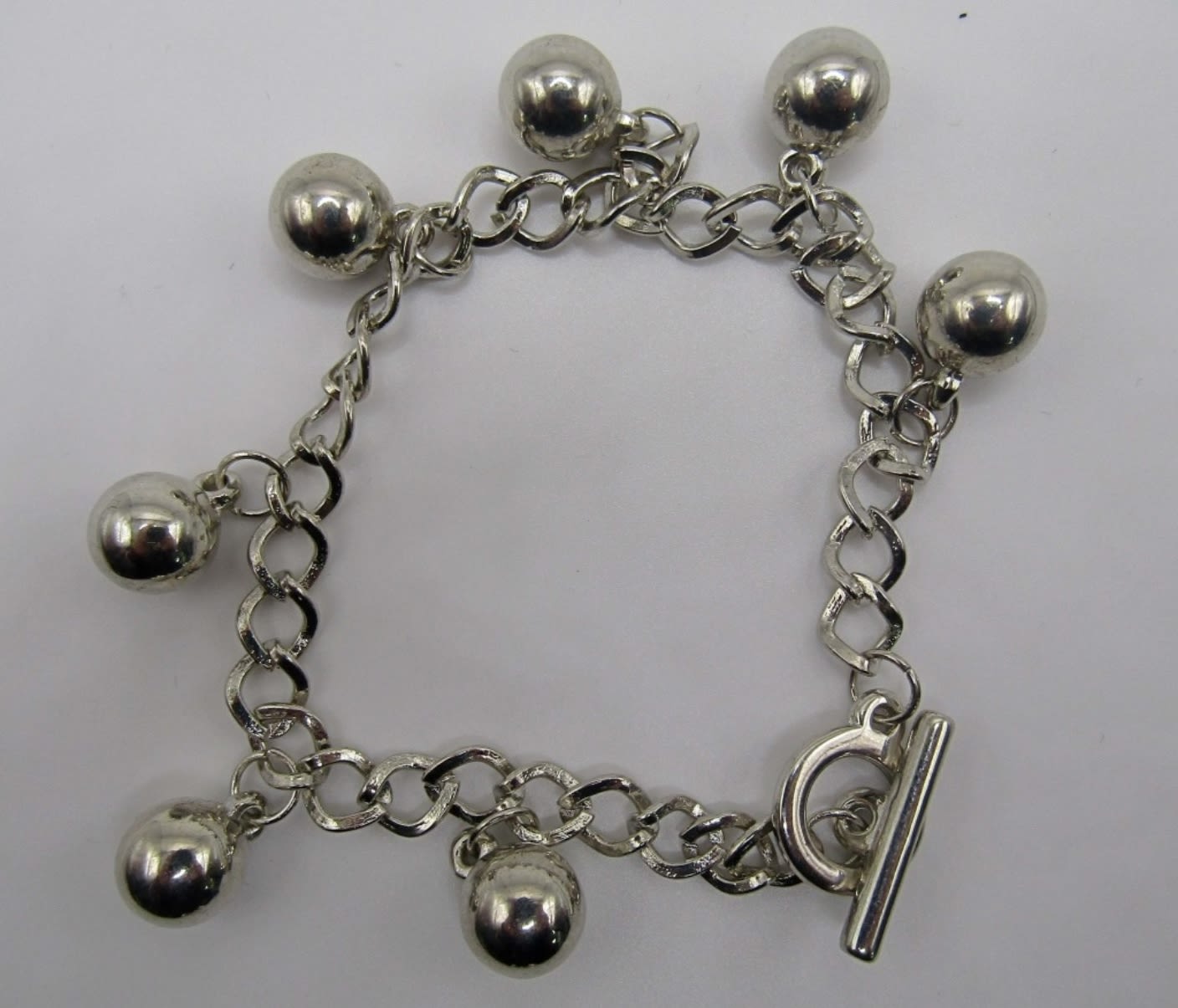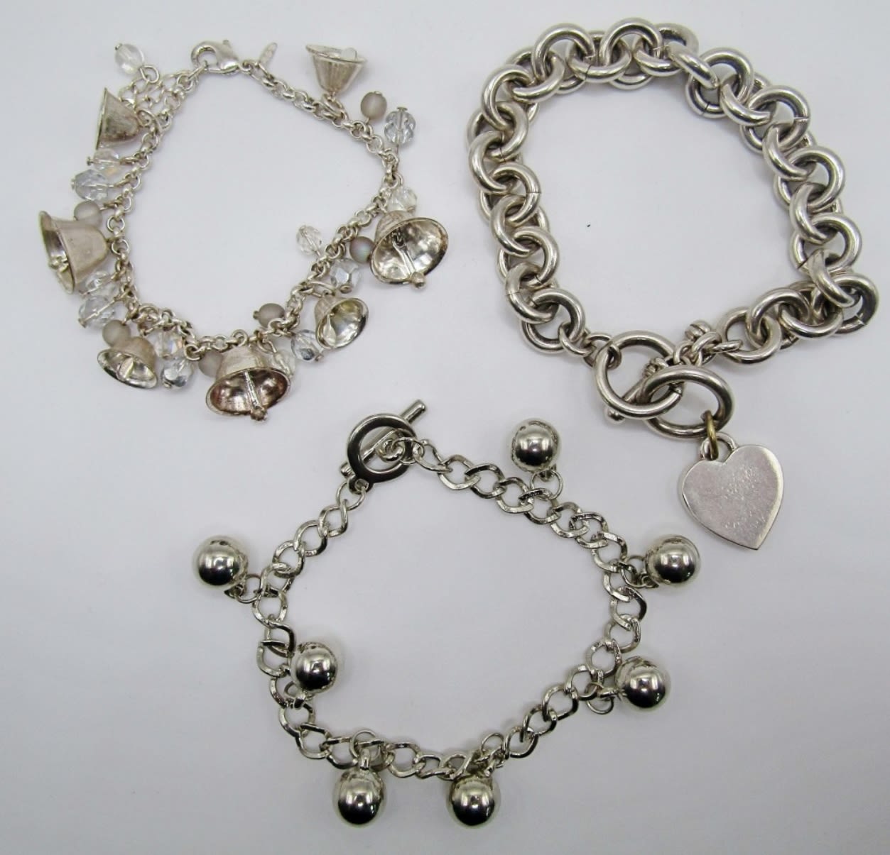 2-8IN IN LENGTH A BELL DANGLE BRACELET, BALL BRACELET, AND A HEART BRACELET THAT IS 8IN IN LENGTH, 3 IN TOTAL