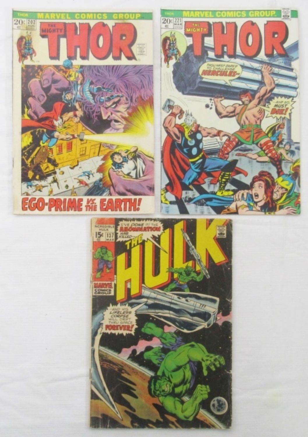 1972 #202 THOR, 1974 #221 THOR & 1971 #137 HULK – GOOD – VERY GOOD+