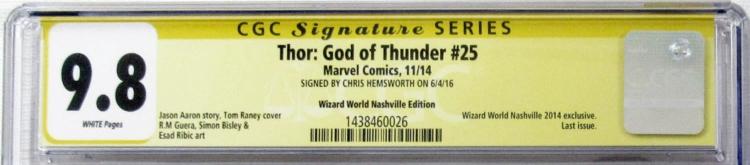 THOR: GOD of THUNDER #25 MARVEL COMIC 2014, SIGNED BY CHRIS HEMSWORTH ON 6/4/16 – CGC 9.8