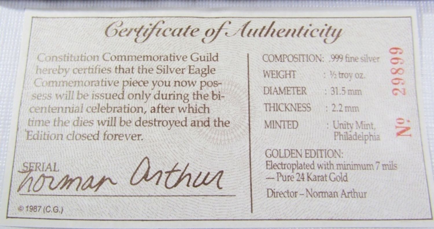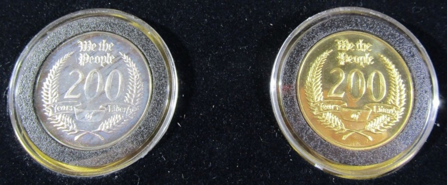 (2) 1/2 oz .999 SILVER CONSTITUTION BICENTENNIAL ROUNDS. ONE ELECTROPLATED WITH 24K GOLD. IN DISPLAY BOX WITH COA. UNITY MINT.