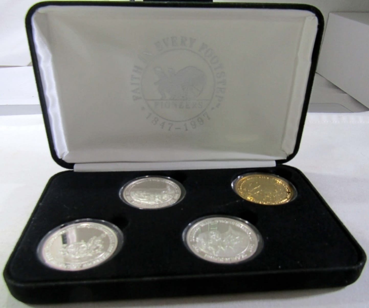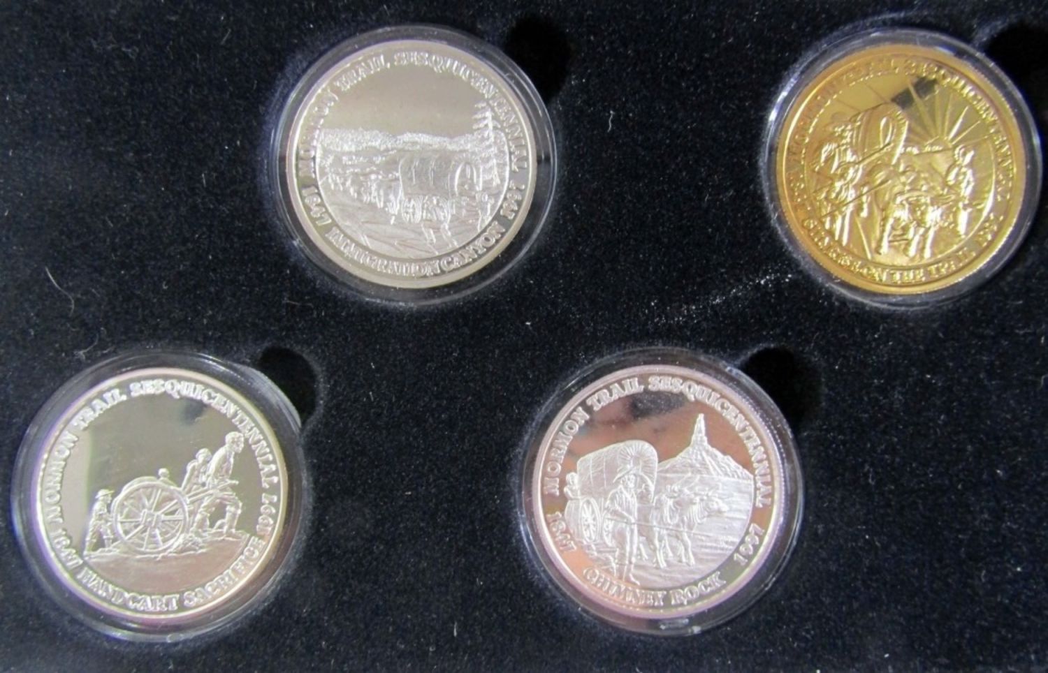 (3) 1oz .999 SILVER & (1) BRONZE. MORMON TRAIL SESQUICENTENNIAL SEREIS, LEGACY MINT. IN DISPLAY CASE W/ COA.