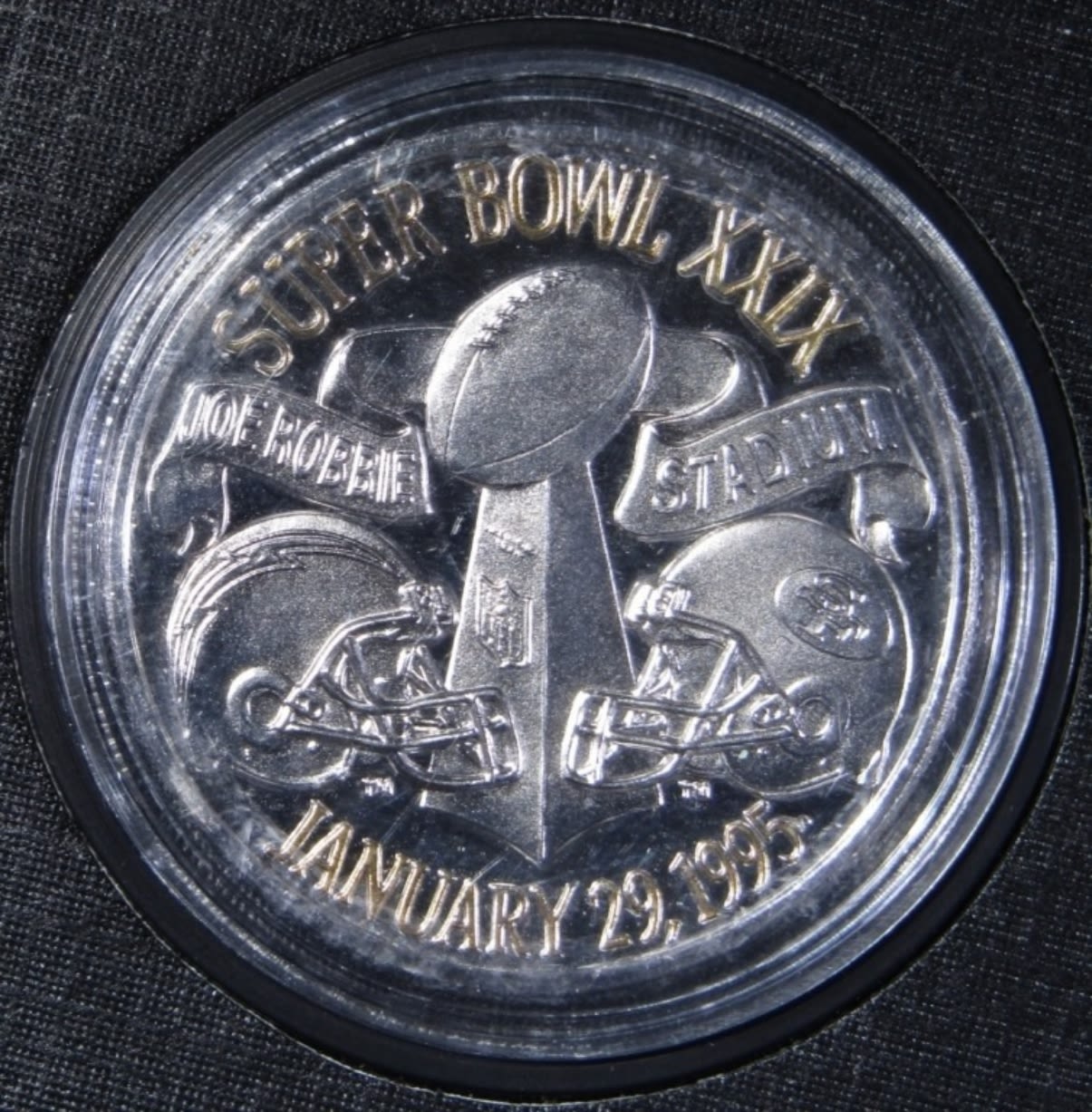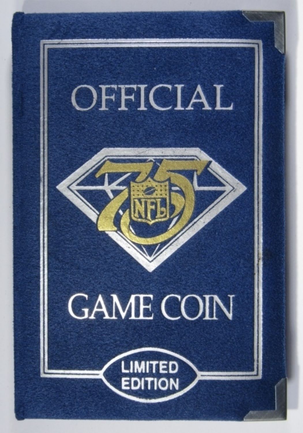 NFL 75TH ANNIVERSARY PROOF STERLING SILVER AND GOLD ENGRAVED OFFICIAL NFL GAME COIN. IN DISPLAY BOOK WITH COA.