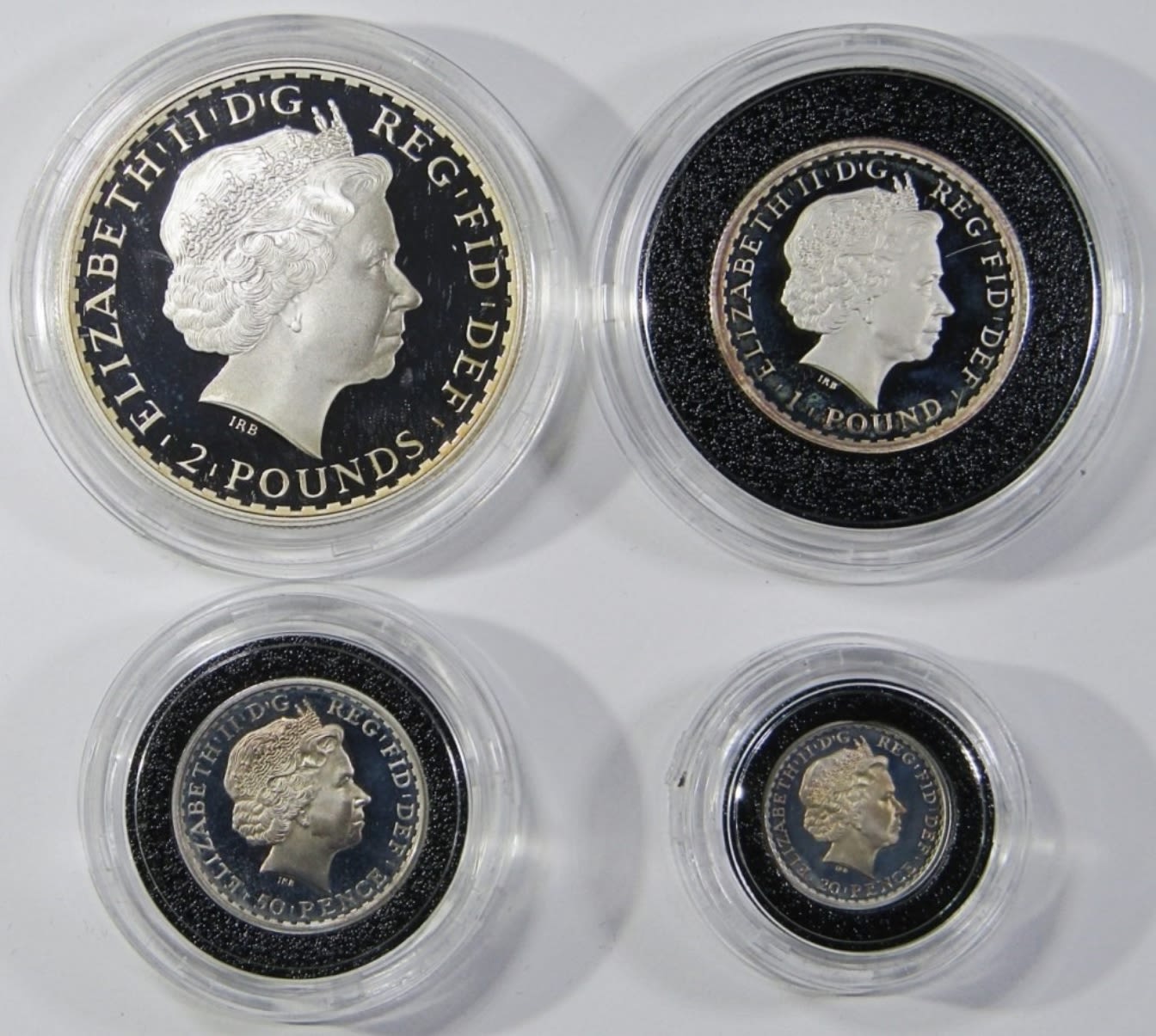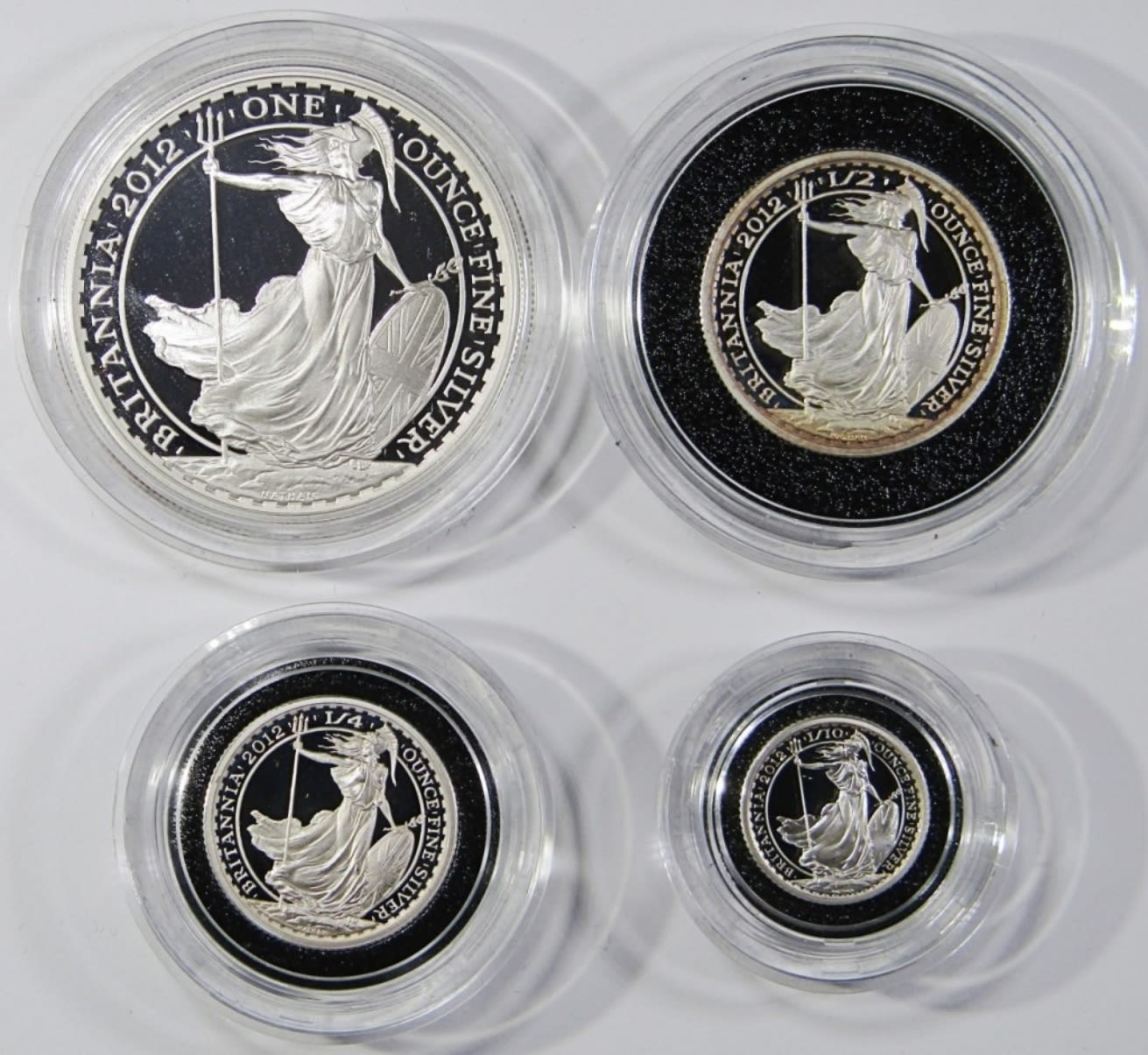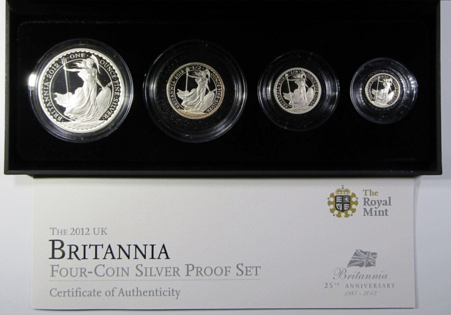 UK BRITANNIA 25TH ANNIVERSARY SET. 1 oz, 1/2 oz, 1/4 oz. & 1/10 oz .958 SILVER COINS. IN OGP WITH COA.