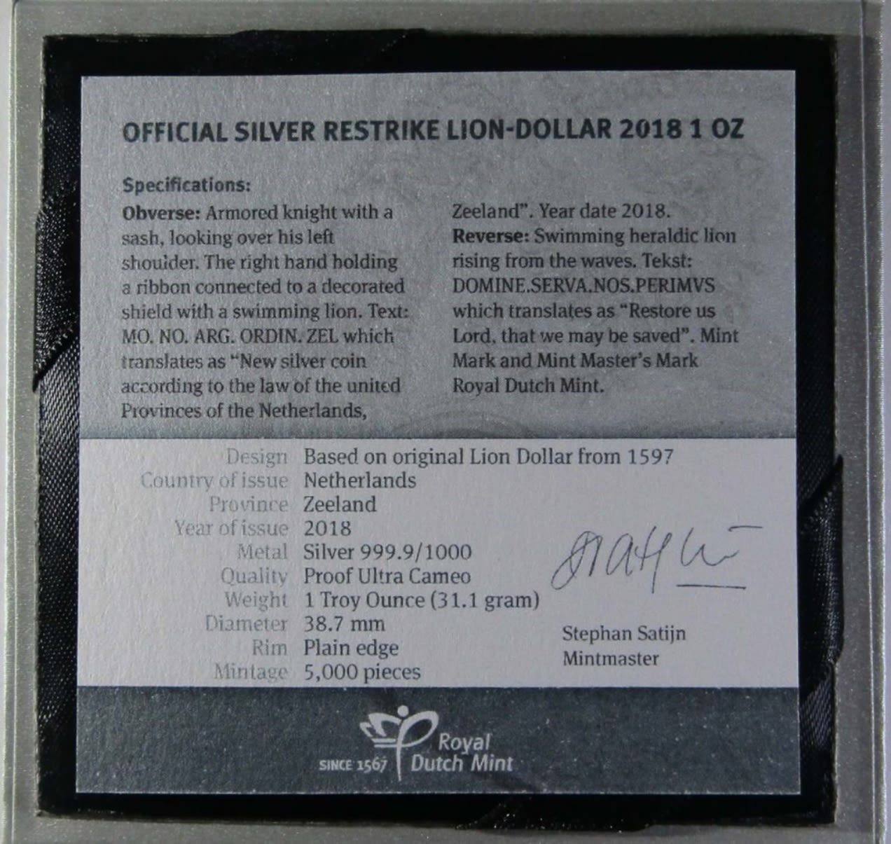 OFFICIAL SILVER RESTRIKE LION DOLLAR. PROOF 1oz .999 SILVER IN OGP WITH COA.
