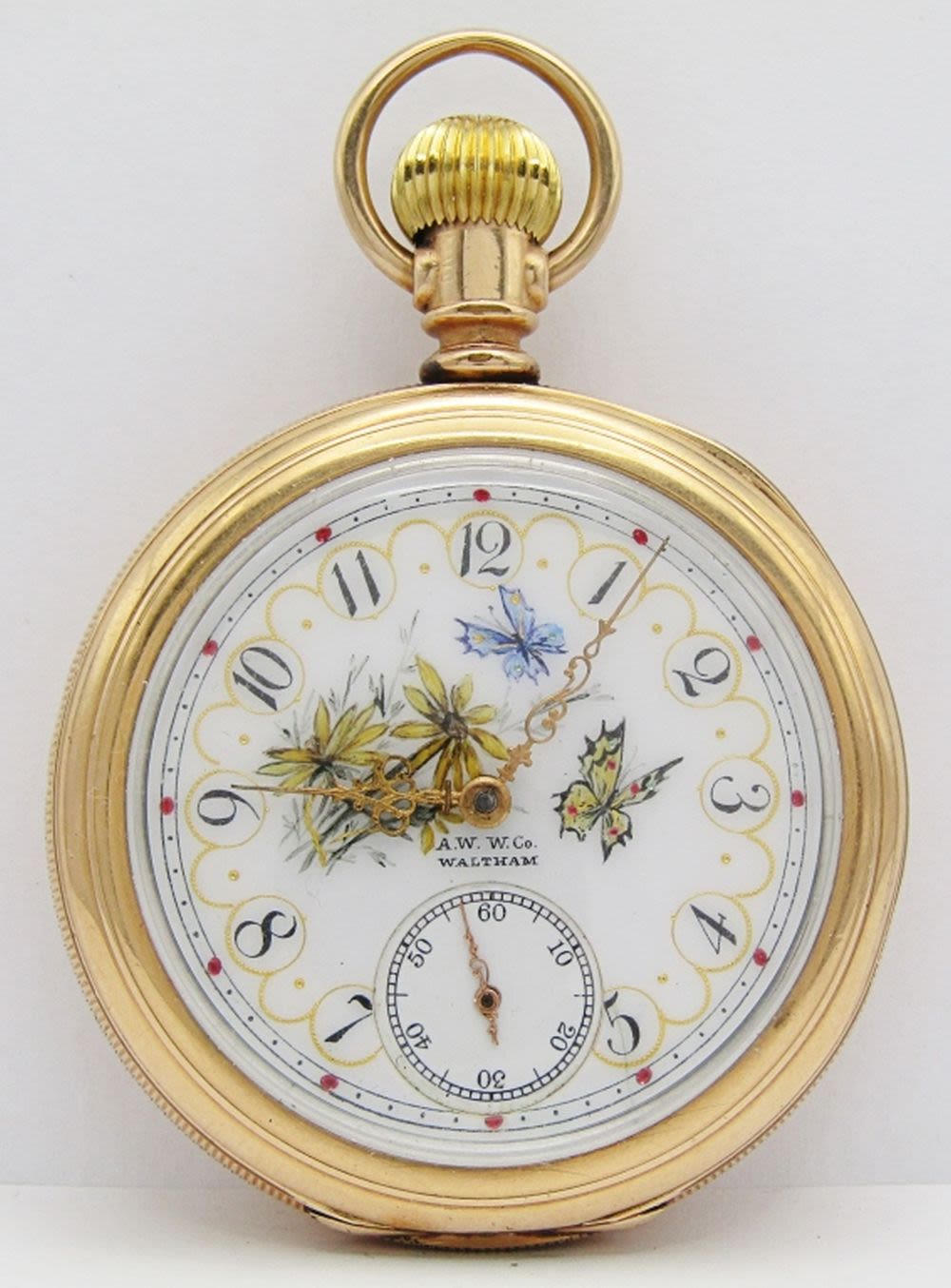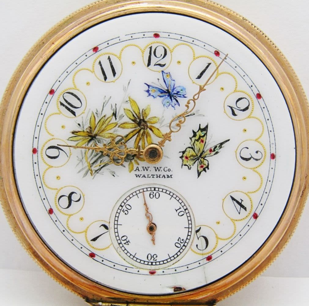 Fancy Factory Porcelain Dial With Butterflies; Yellow Gold Filled Hinged Case
