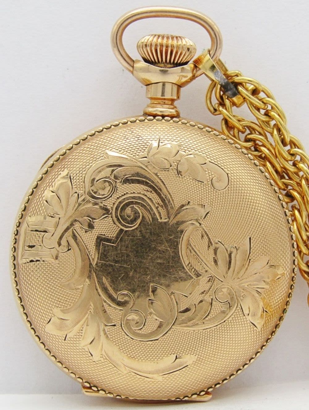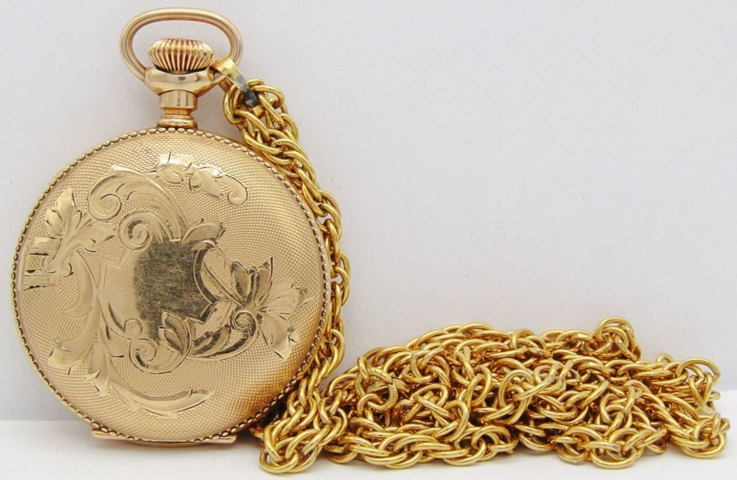 Roman Numeral Porcelain Dial; Fancy Hinged Yellow Gold Filled Case; Complete With A 24 Inch Yellow Gold Filled Chain