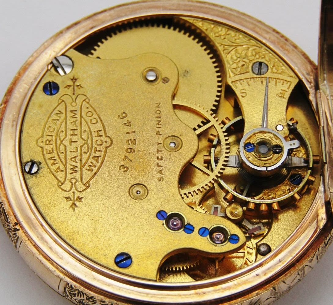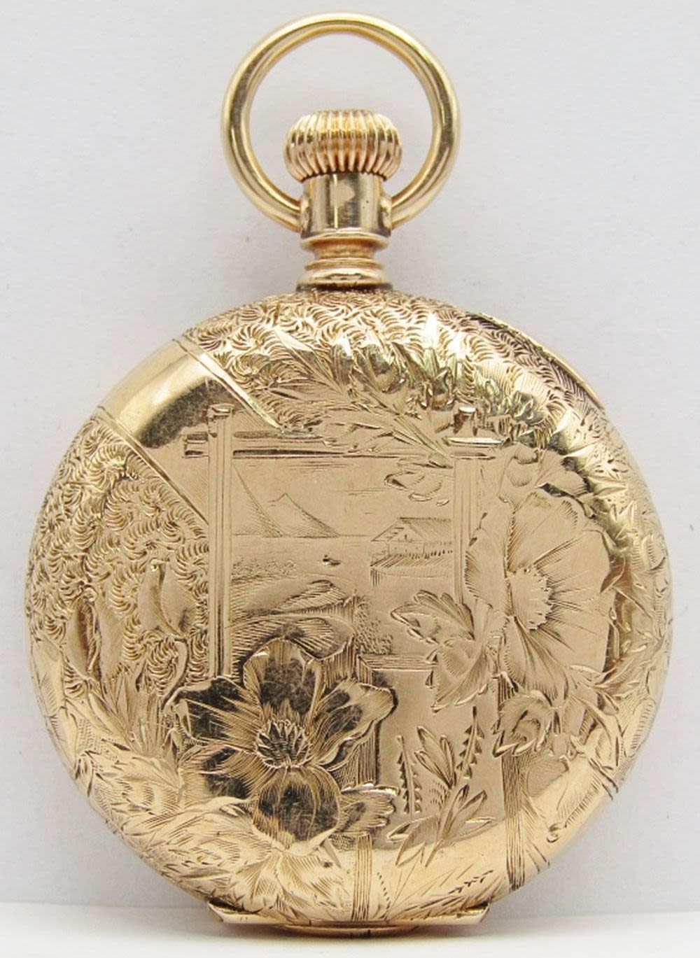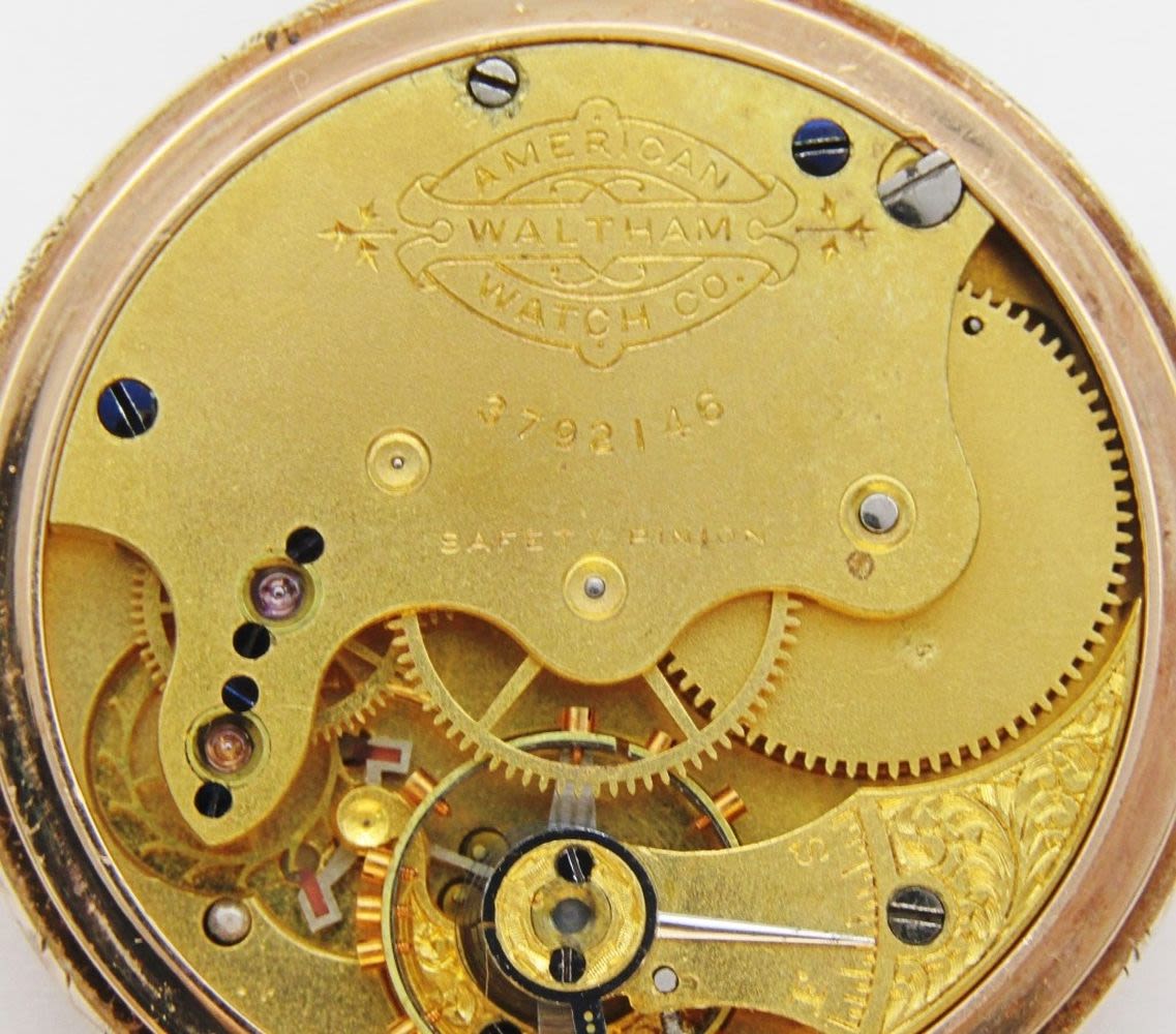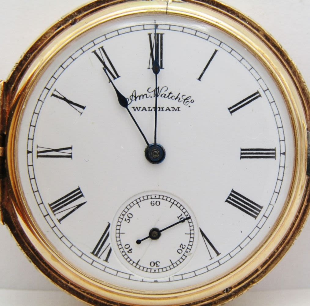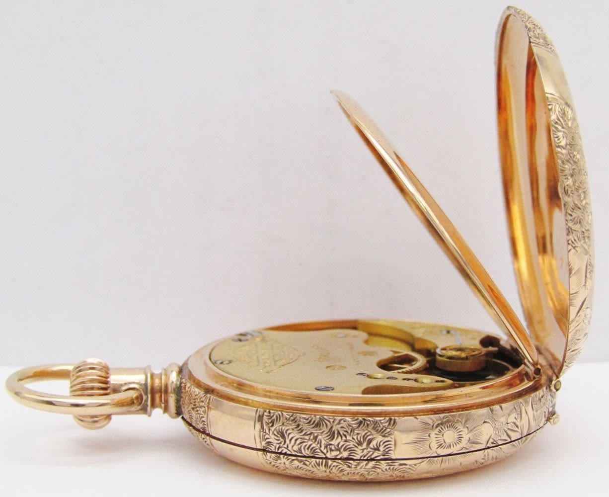 Porcelain Romain Dial; 9 Jewel Movement; 14KT Gold Hunting Case; Total Weight 41.6 grams