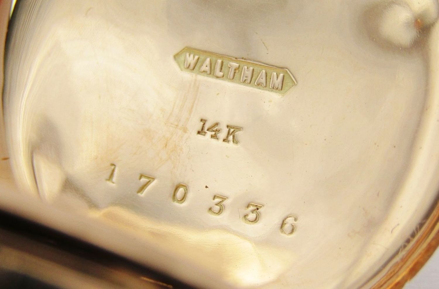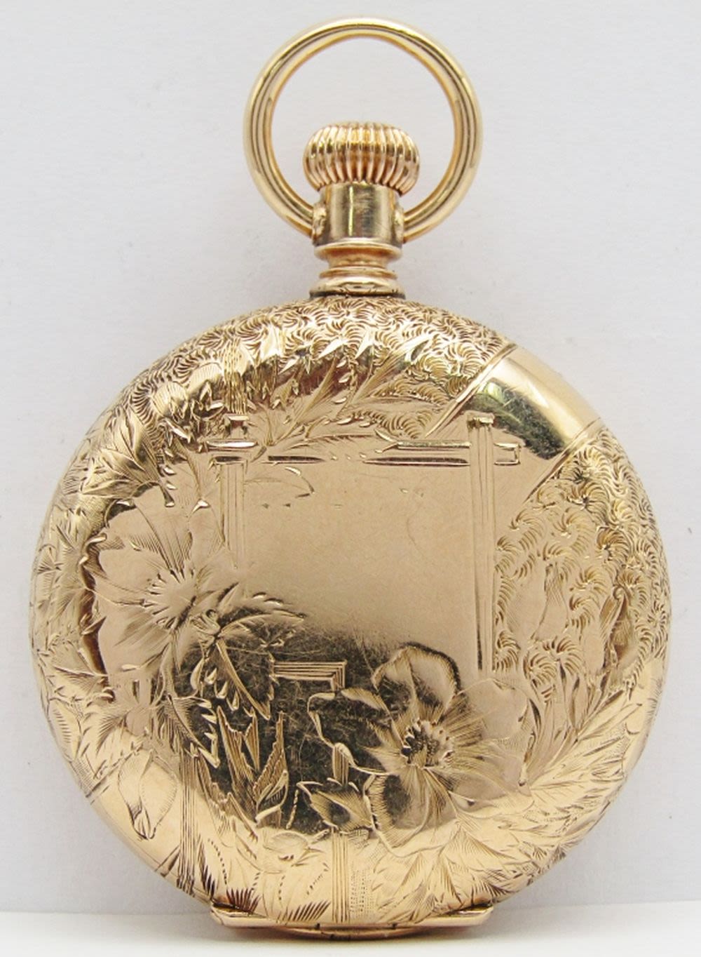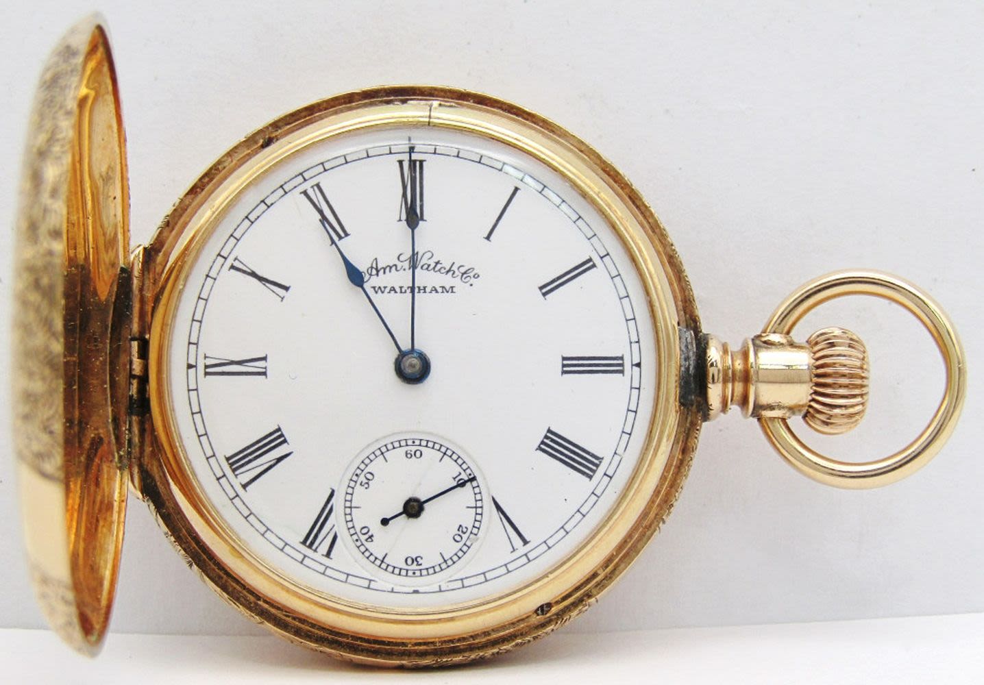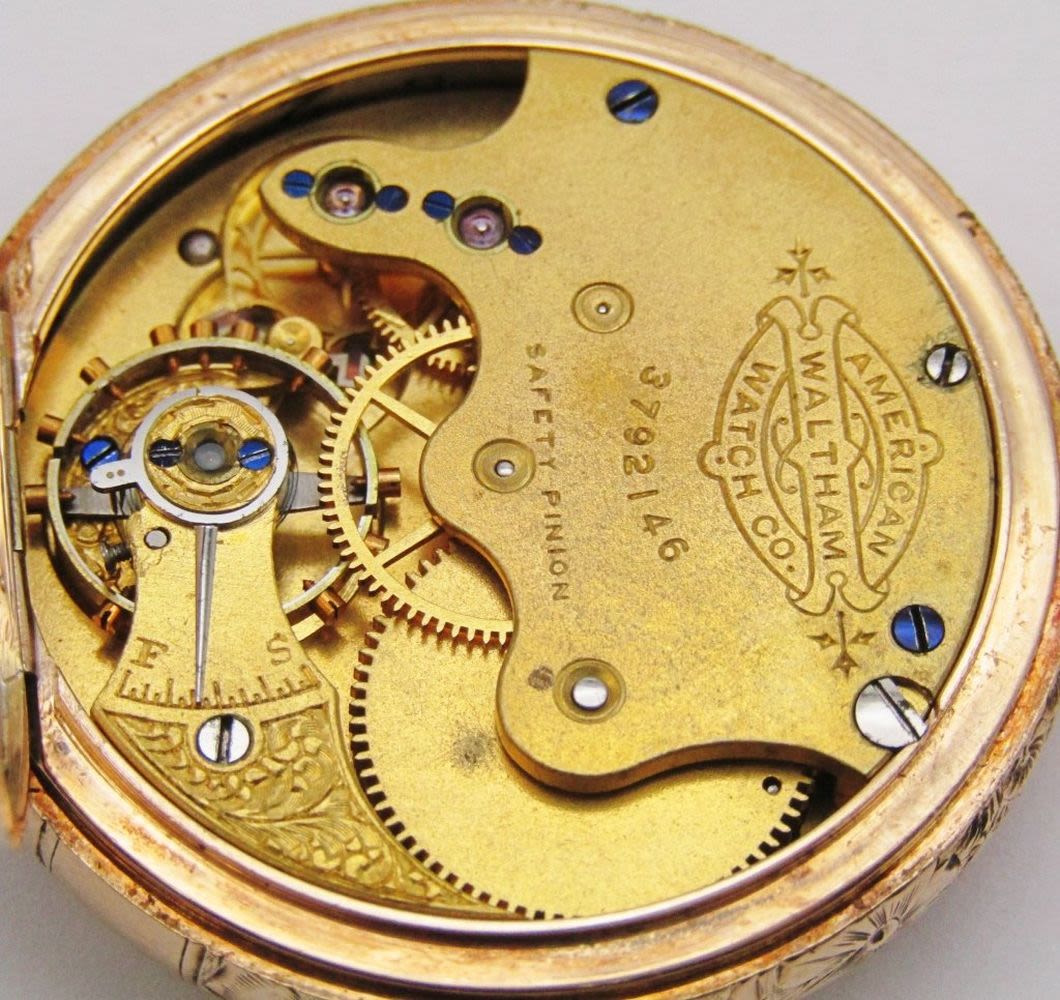 Porcelain Romain Dial; 9 Jewel Movement; 14KT Gold Hunting Case; Total Weight 41.6 grams