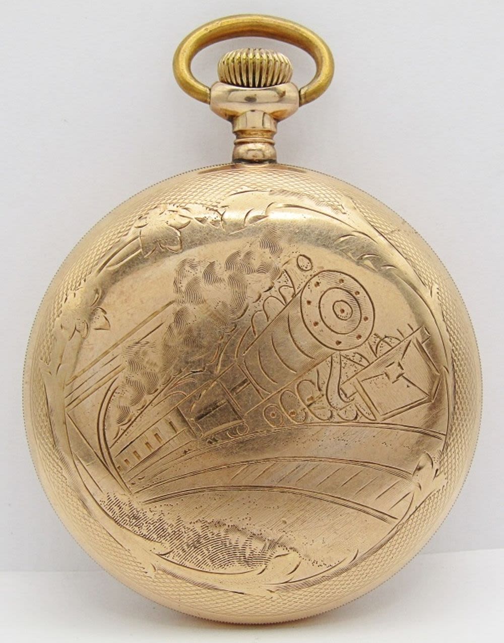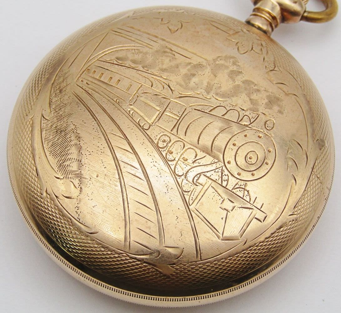 Double Sunk Montgomery Porcelain Dial; Yellow Gold Filled Screwback Case With Locomotive Engraving