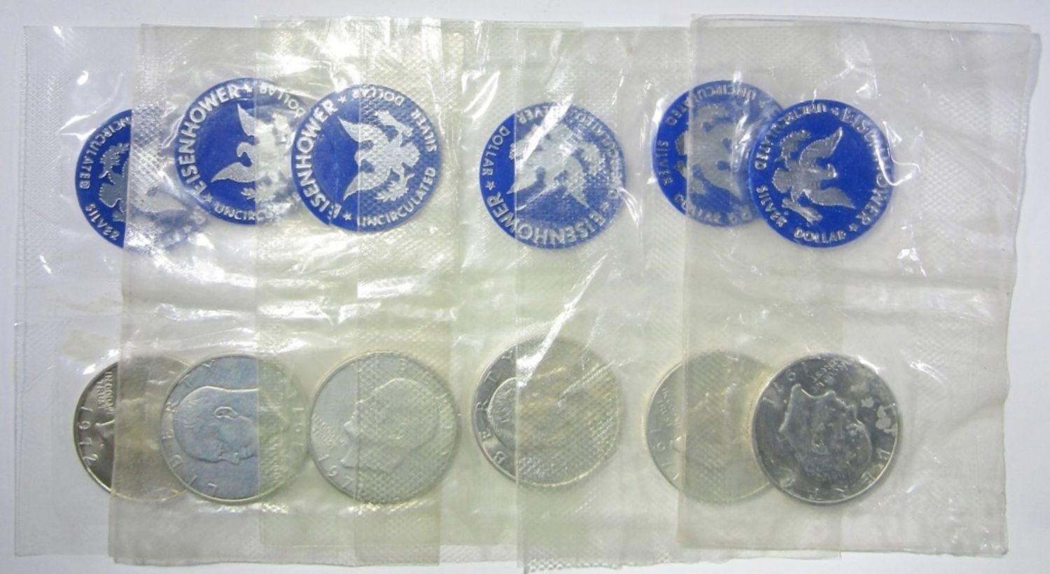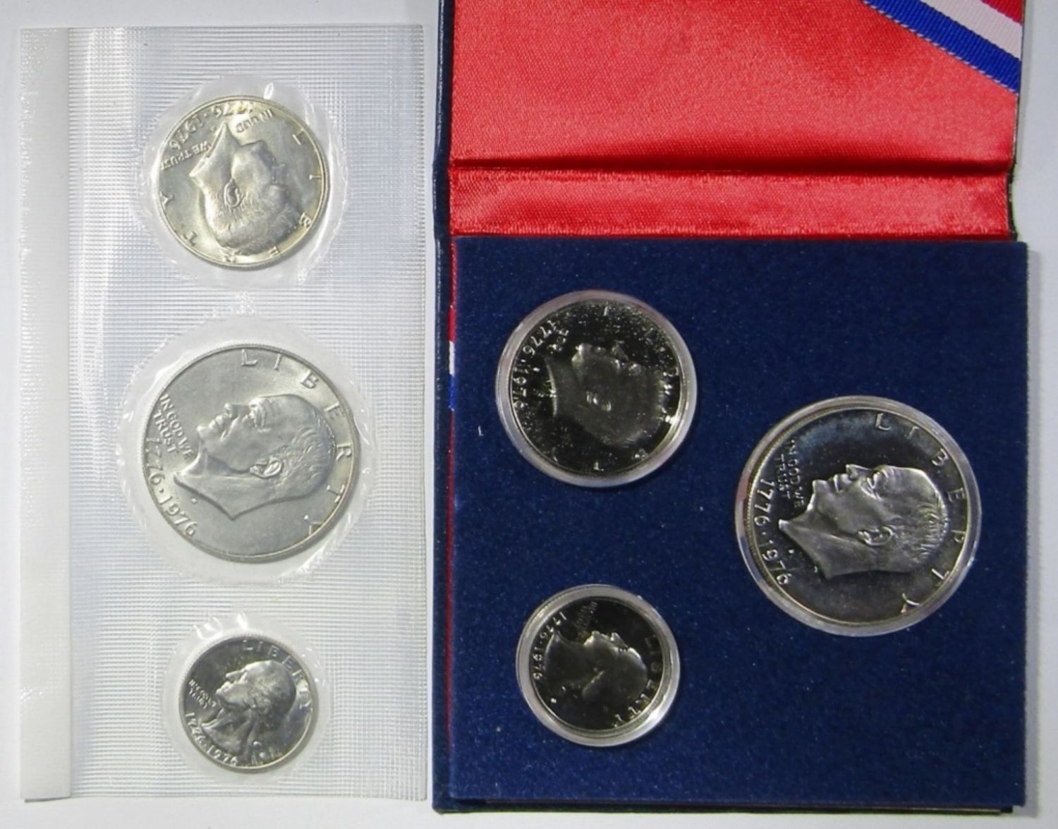 (5) 1971-S & (1) 72-S BLUE IKE MINT SETS MISSING ENVELOPES, 1976 BICENTENNIAL UNC & PROOF SETS: UNC SET MISSING CARDBOARD HOLDER & COA, PROOF SET MISSING TOP OF CAPSULE FOR DOLLAR.