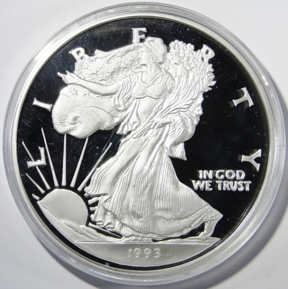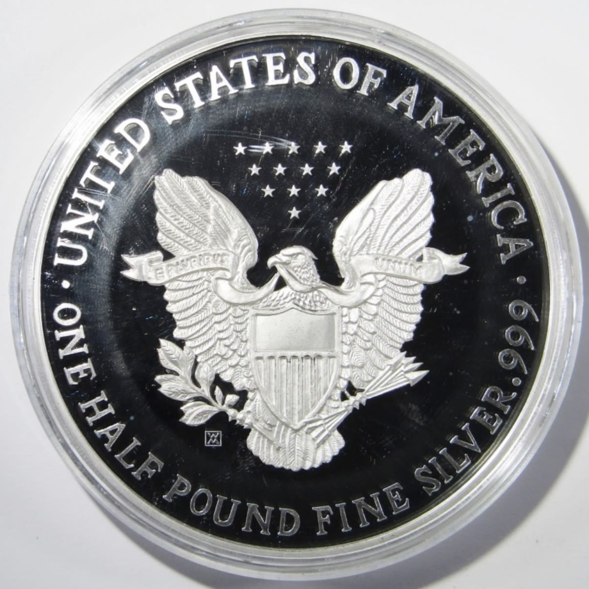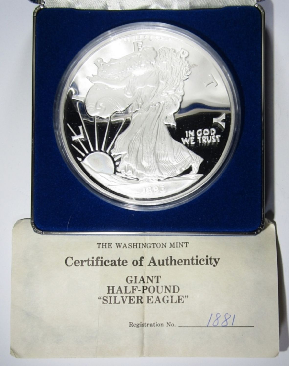 8 TROY OZ SILVER PROOF REPLICA OF 1993 SILVER EAGLE, IN VELVET BOX WITH COA. WASHINGTON MINT.