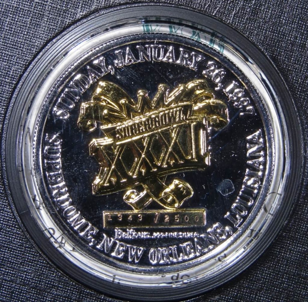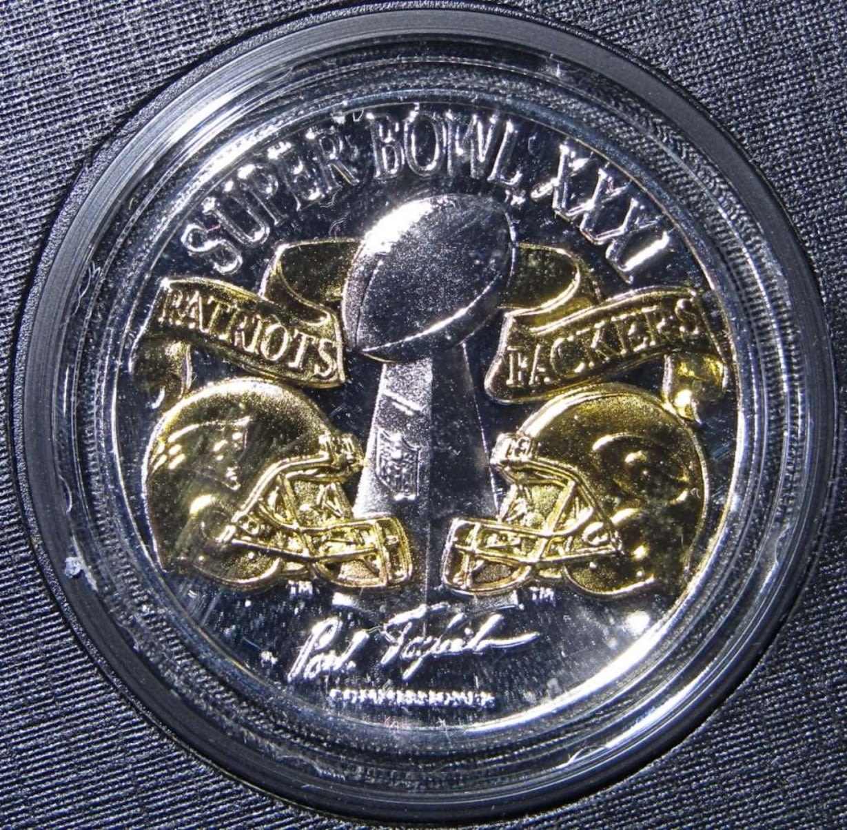 1oz .999 SILVER W/ 24K GOLD ACCENTS. PATRIOTS vs. PACKERS LIMITED EDITION OFFICIAL GAME COIN. IN DISPLAY BOOK WITH COA.