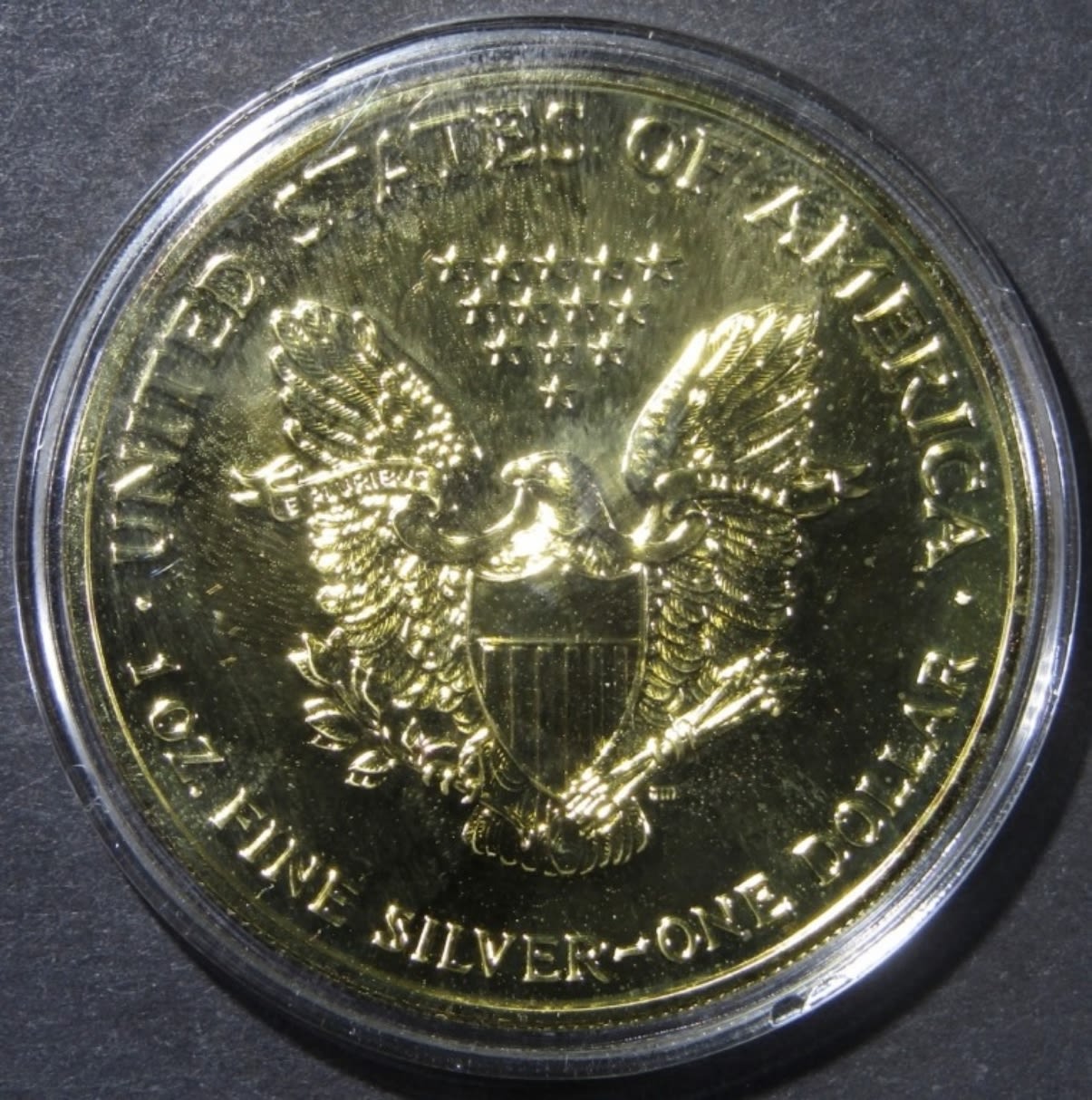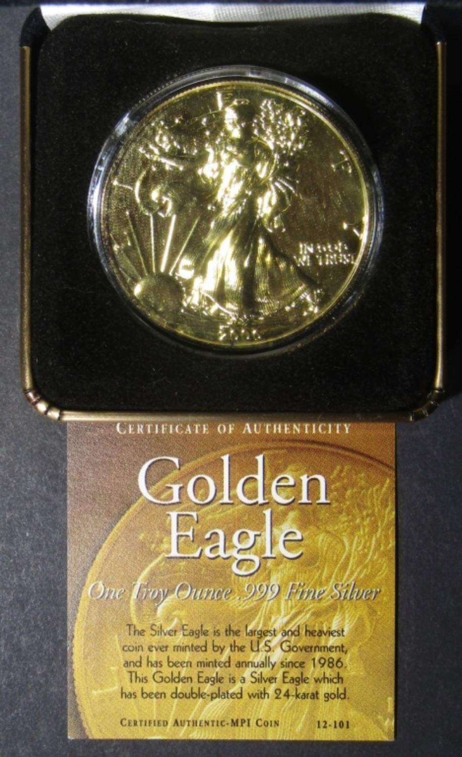 “GOLDEN EAGLE” 1oz .999 SILVER DOUBLE-PLATED WITH 24K GOLD. IN VELVET DISPLAY BOX W/ COA