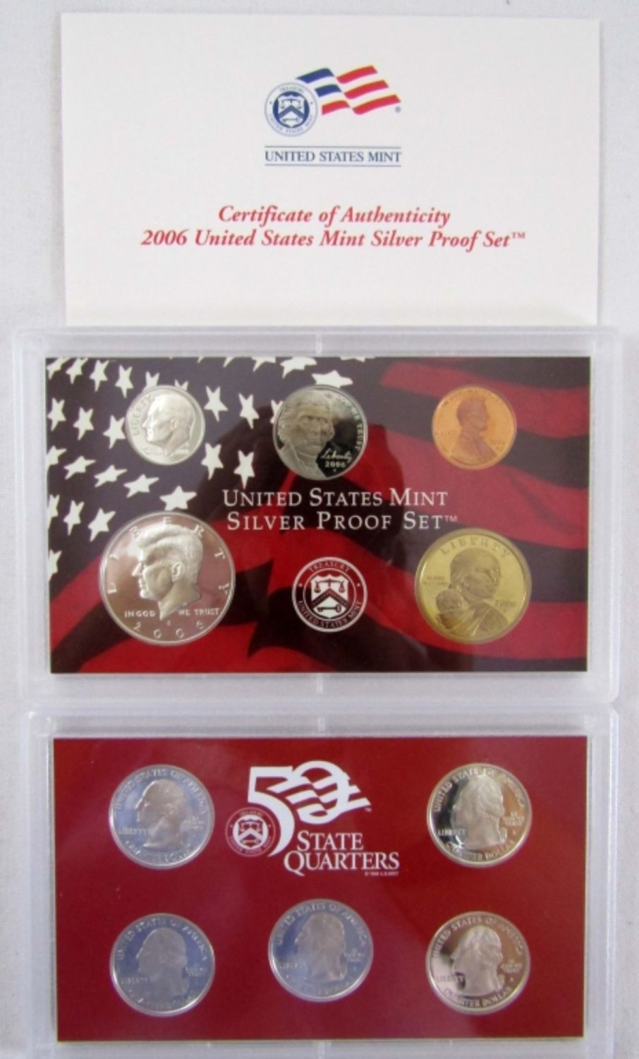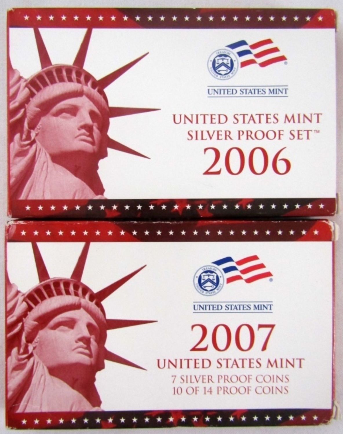 BOTH IN ORIG PACKAGE. THE 2007 IS 7 SILVER PROOF COINS, 10 OF 14 PROOF COINS.