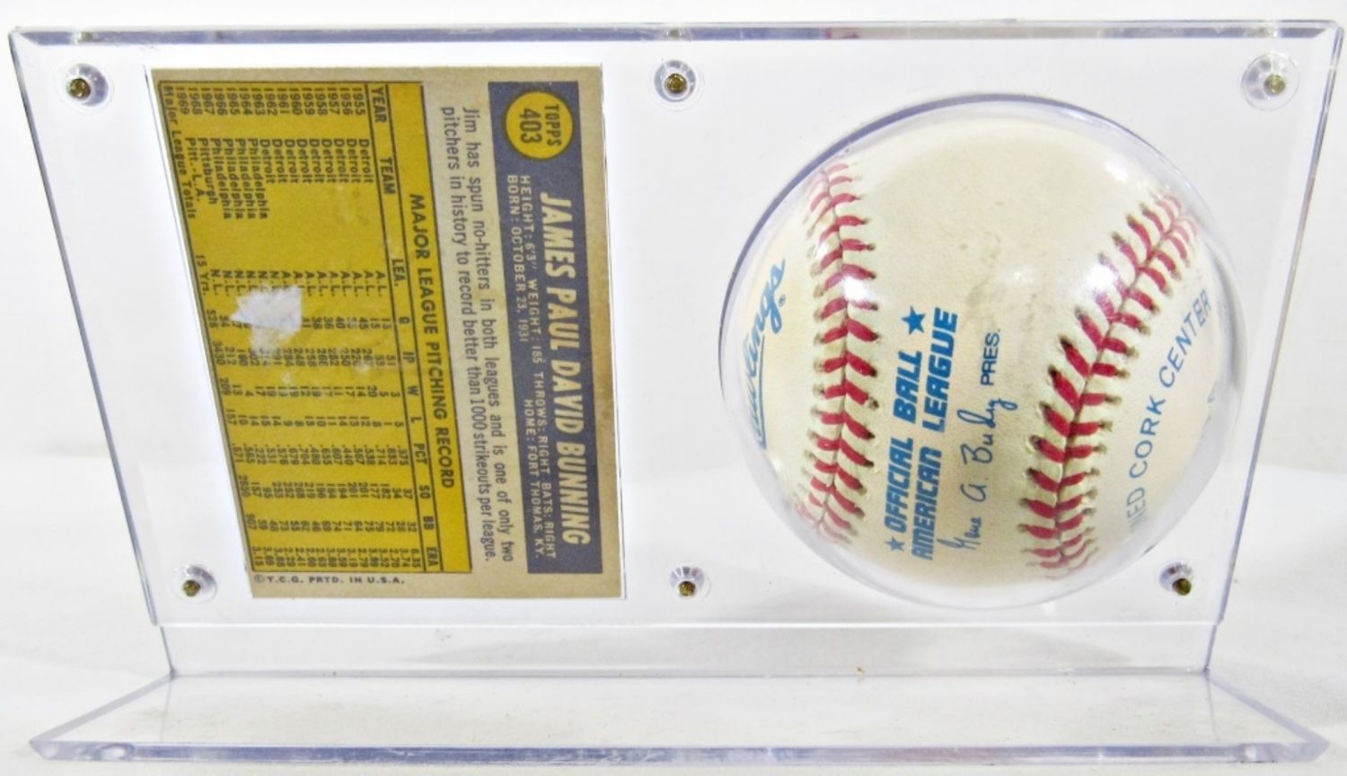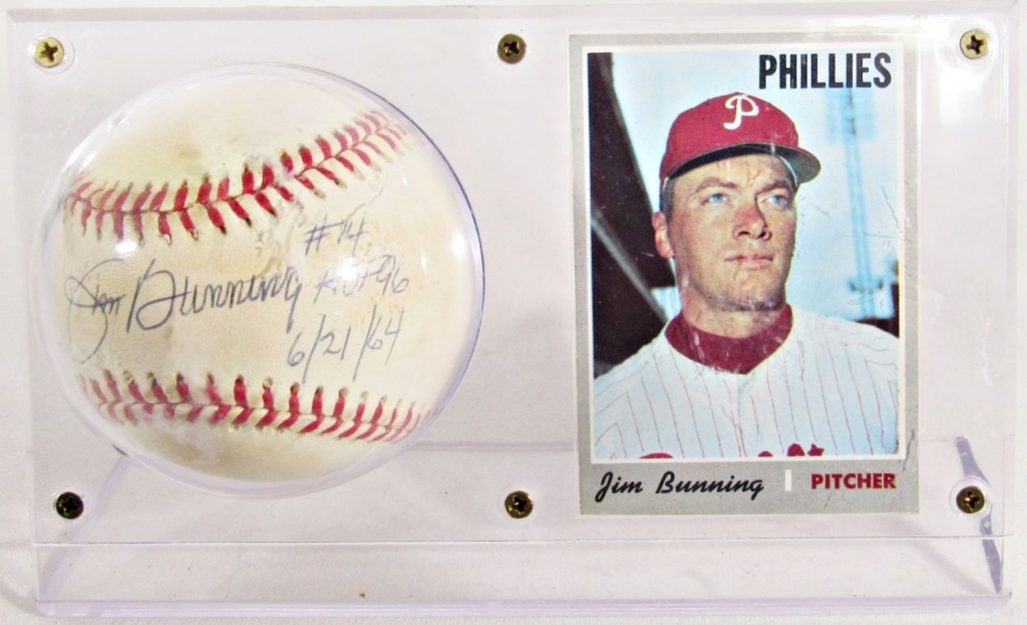 HOF 96 AUTOGRAPHED BASEBALL, 1970 TOPPS AUTOGRAPHED CARD, IN SCREW DOWN HOLDER, NO COA