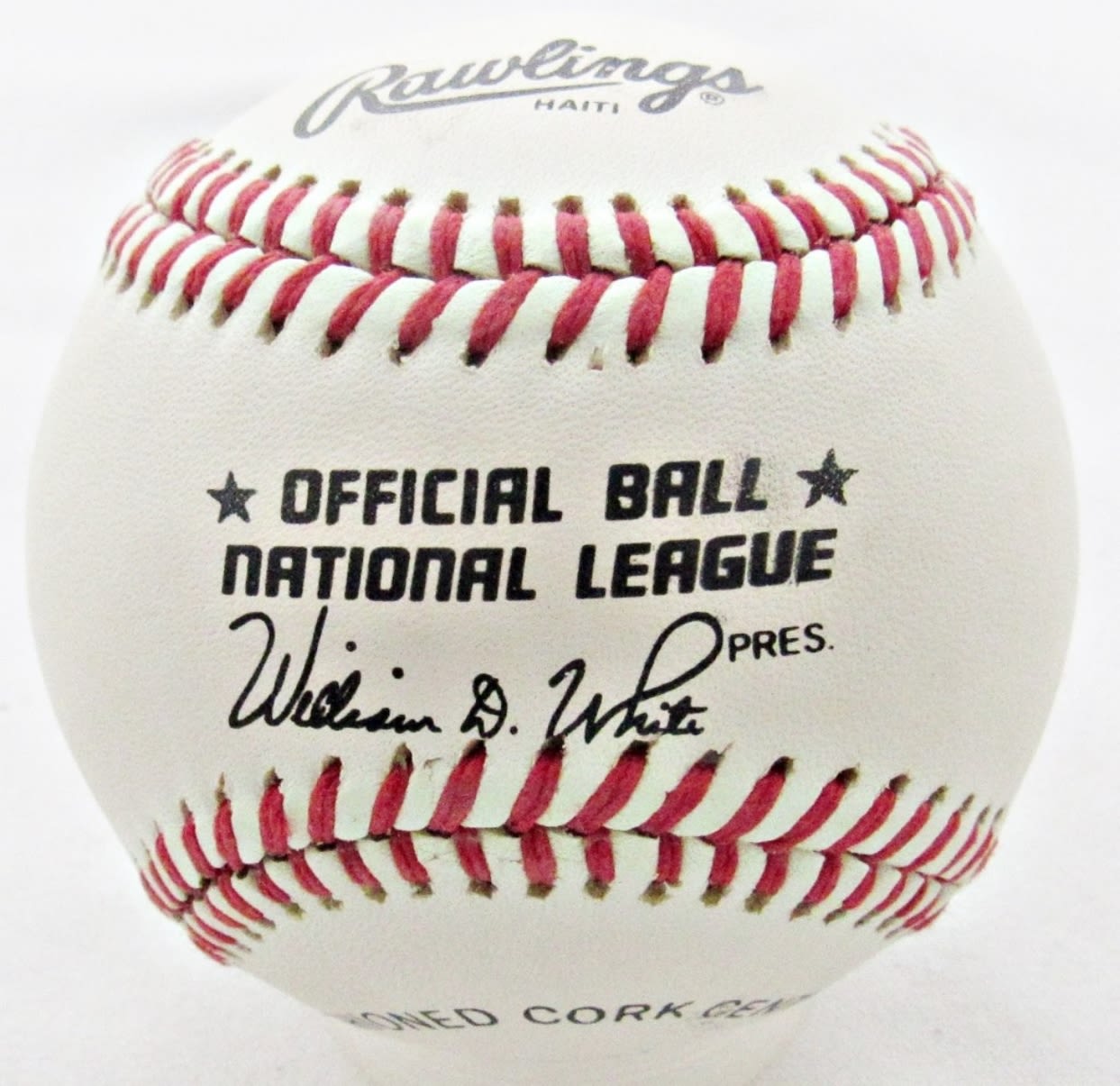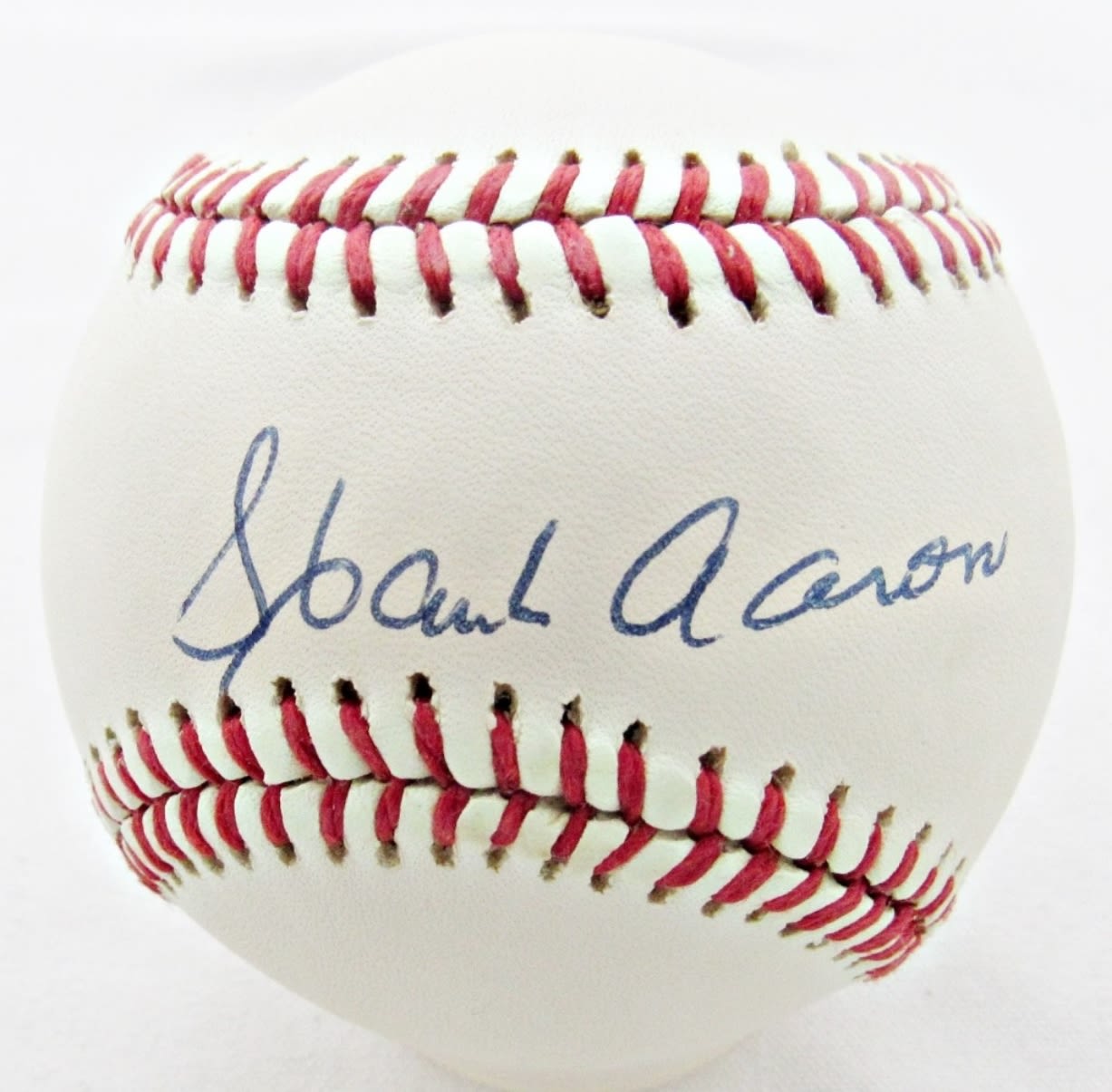 HANK AARON AUTOGRAPHED OFFICIAL NATIONAL LEAGUE BASEBALL IN CUBE HOLDER, NO COA
