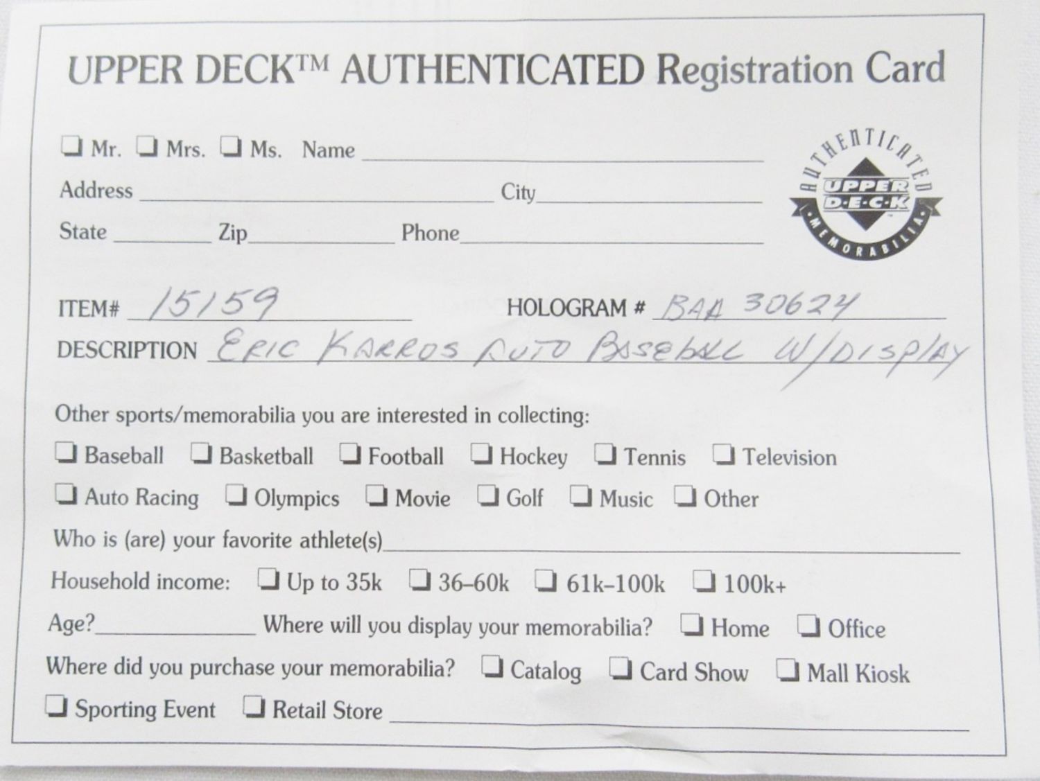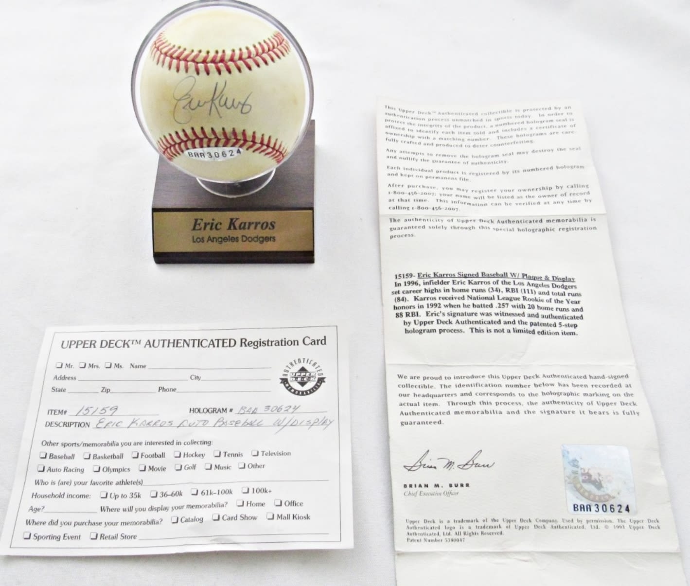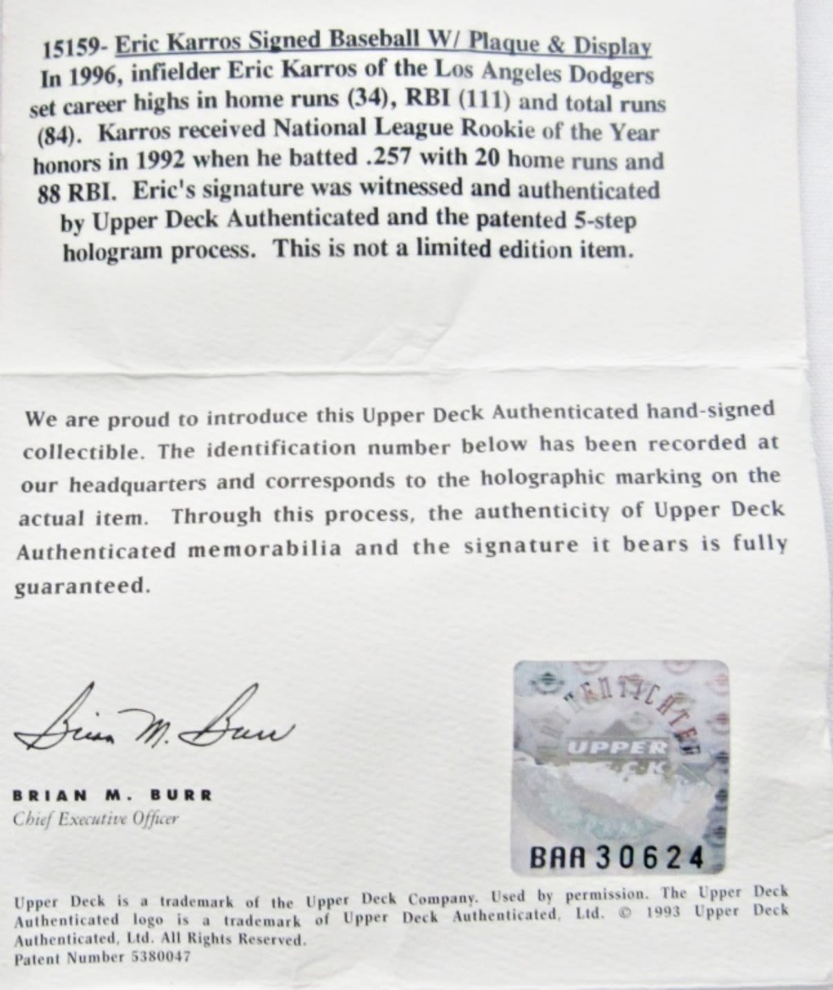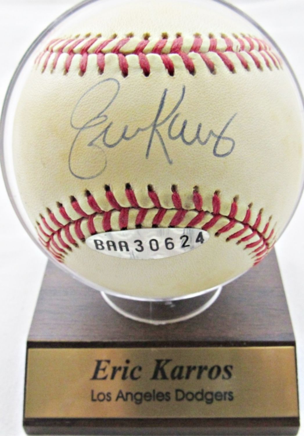 ERIC KARROS AUTOGRAPHED OFFICIAL NATIONAL LEAGUE BASEBALL WITH PLAQUE AND DISPLAY, WITH COA FROM UPPER DECK