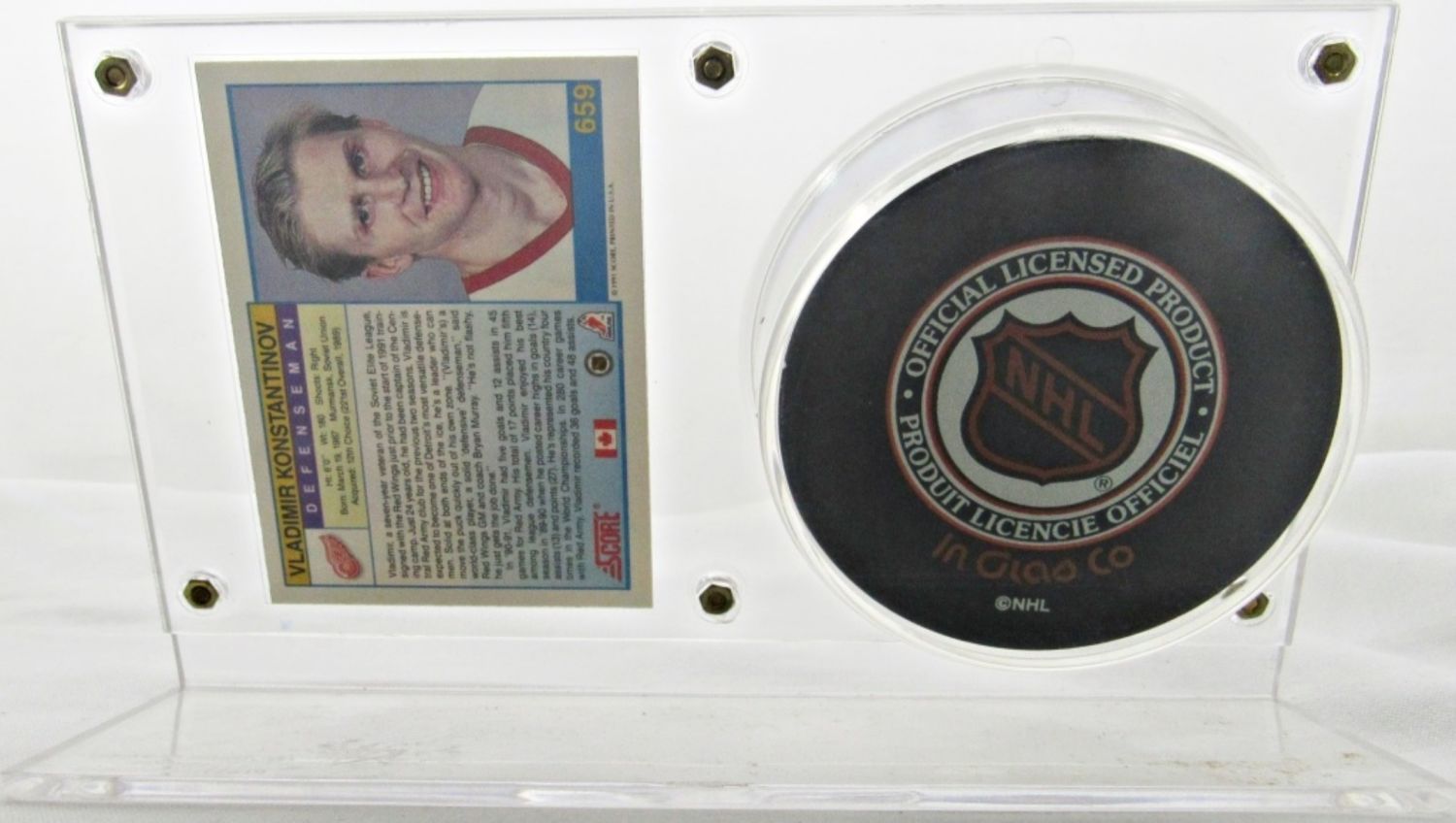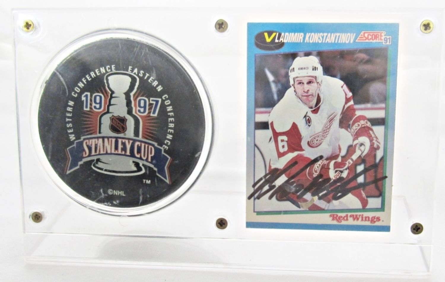 VLADIMIR KONSTANTINOV SIGNED CARD AND PUCK WITH SCREW DOWN HOLDER DISPLAY CASE, NO COA