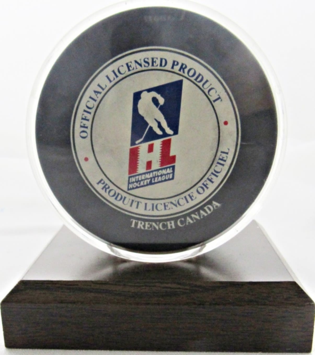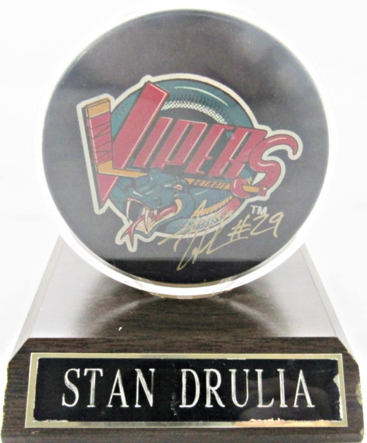 STAN DRULIA AUTOGRAPHED OFFICIAL VINTAGE HOCKEY PUCK IN DISPLAY, NO COA