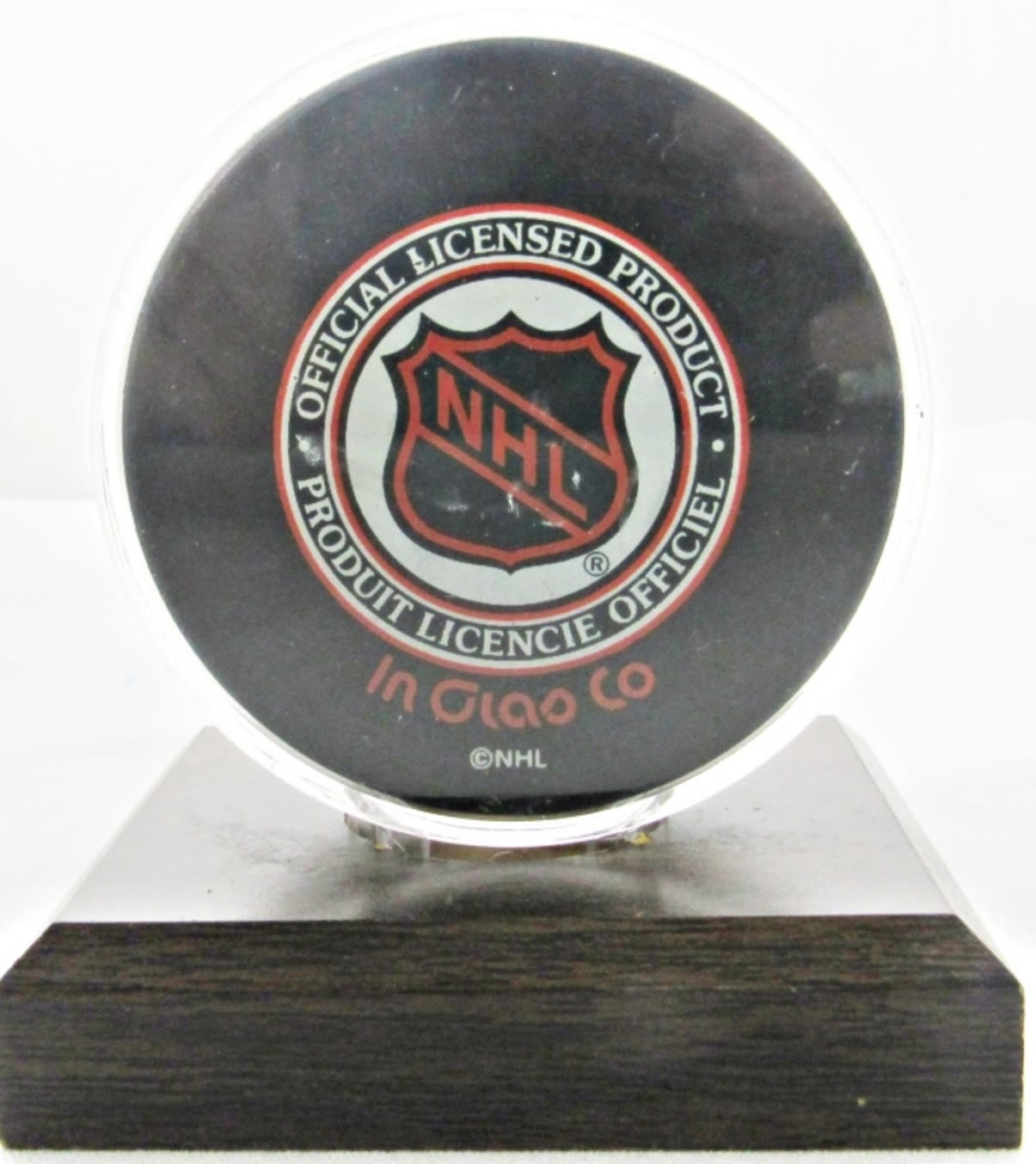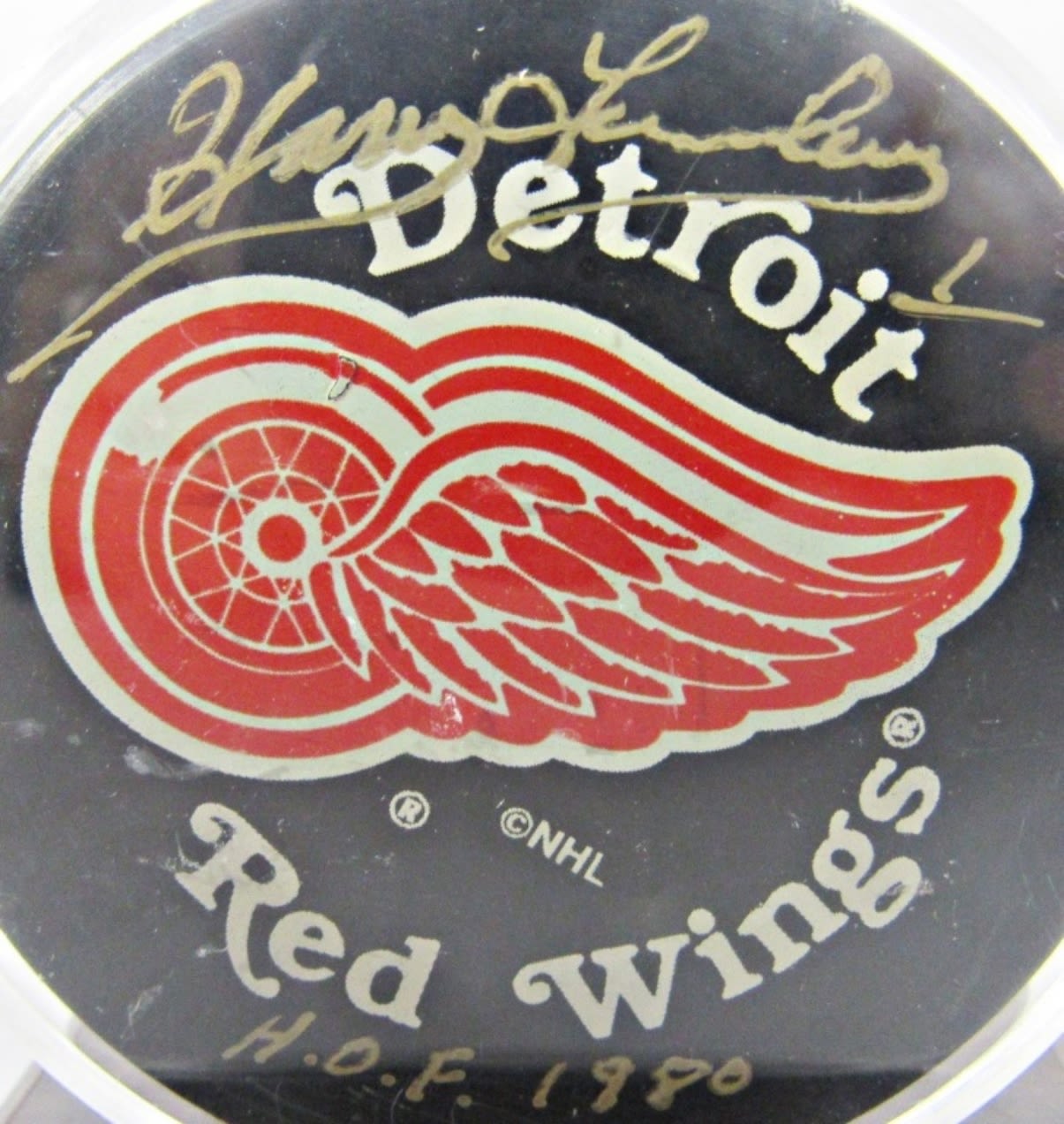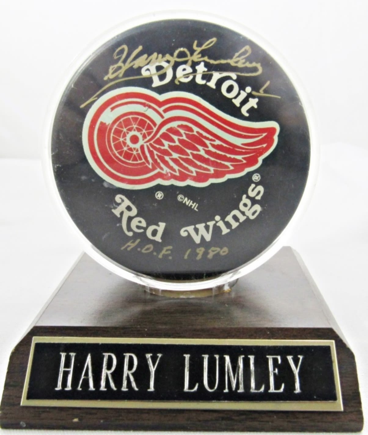 HARRY LUMLEY HOF 1980 AUTOGRAPHED OFFICIAL VINTAGE HOCKEY PUCK IN DISPLAY, NO COA