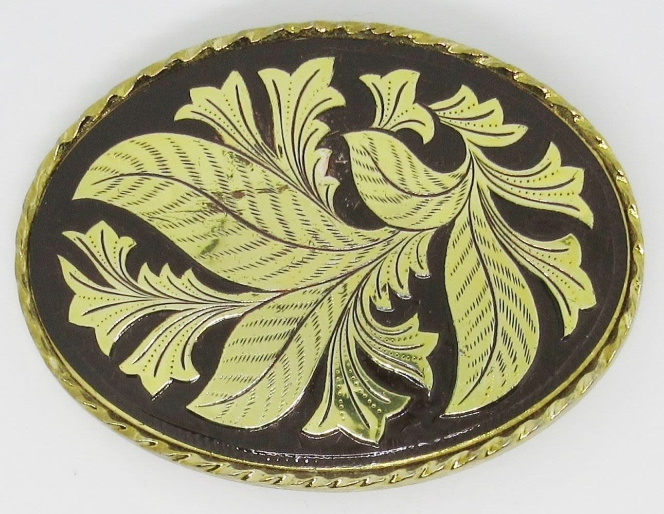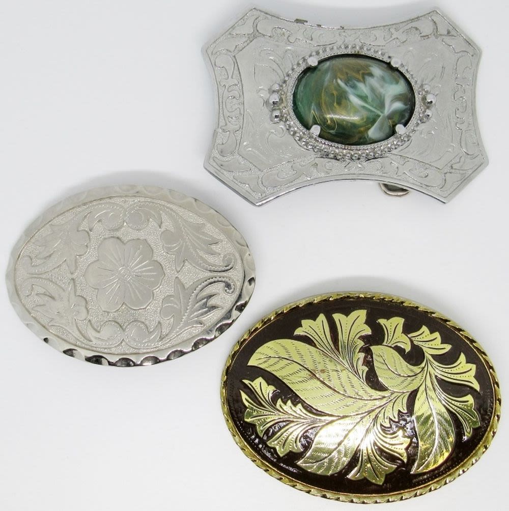 Set of 3 Vintage Belt Buckles, Silver Tone w/ Green Gold Center Marble Stone, Silver Flower Design, Brown Gold Leaf