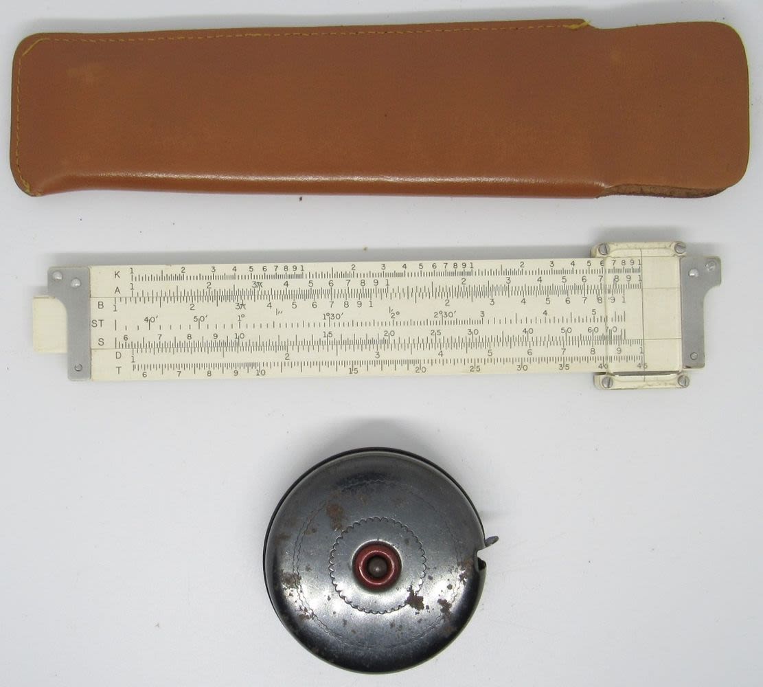 6 Feet Metal Pushbutton Retractable Tape Measure Steel; Bruning Pocket Slide Rule USA, Model #2398 With Leather Pouch!