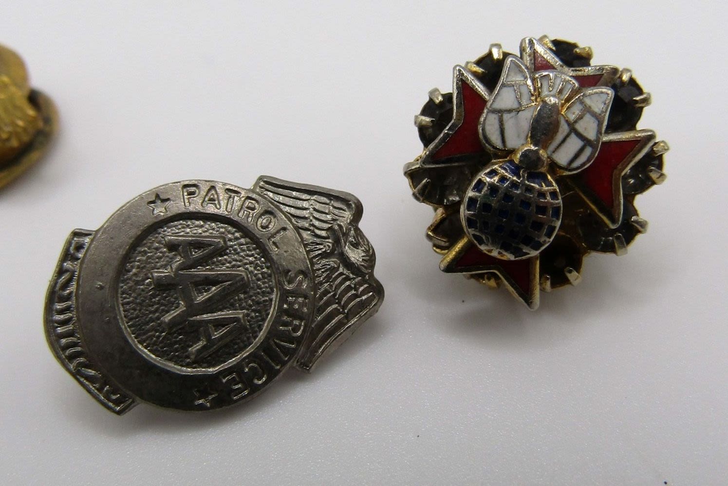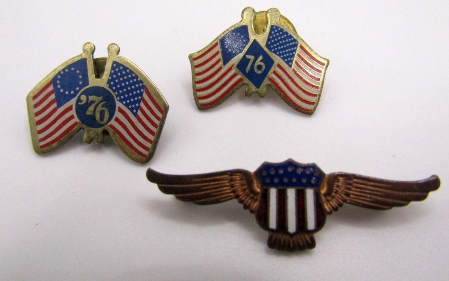 (2) DIFFERENT ’76 FLAGS, SHIELD & WINGS, EAGLE, PEACE DOVE, & AAA PATROL SERVICE.