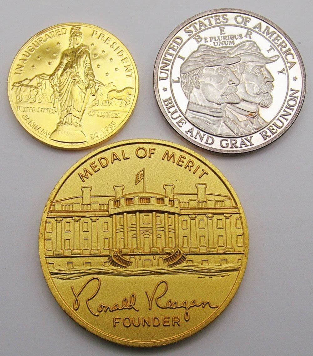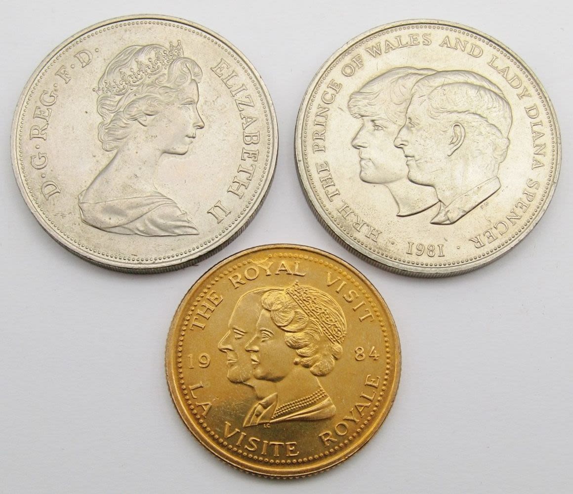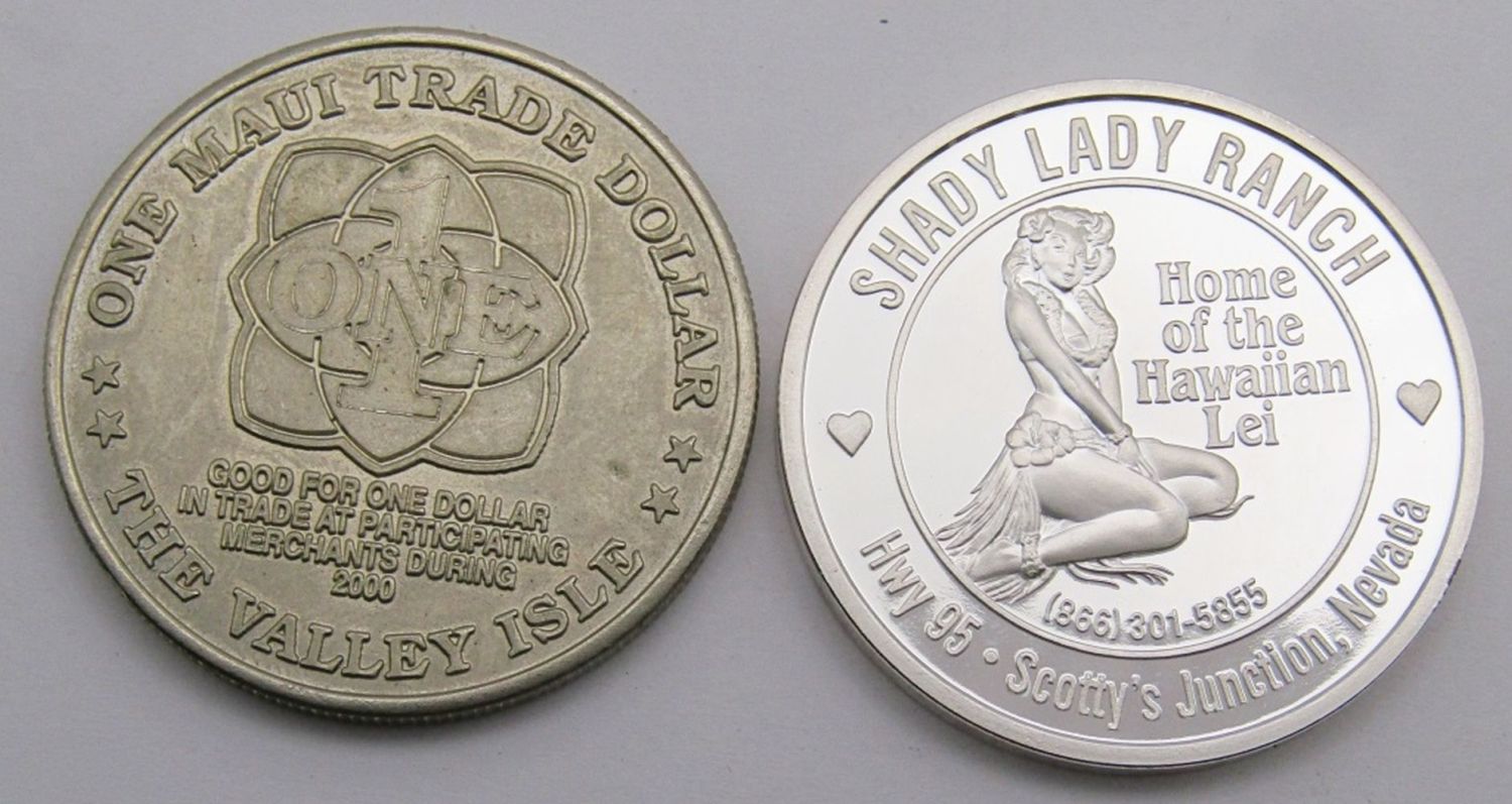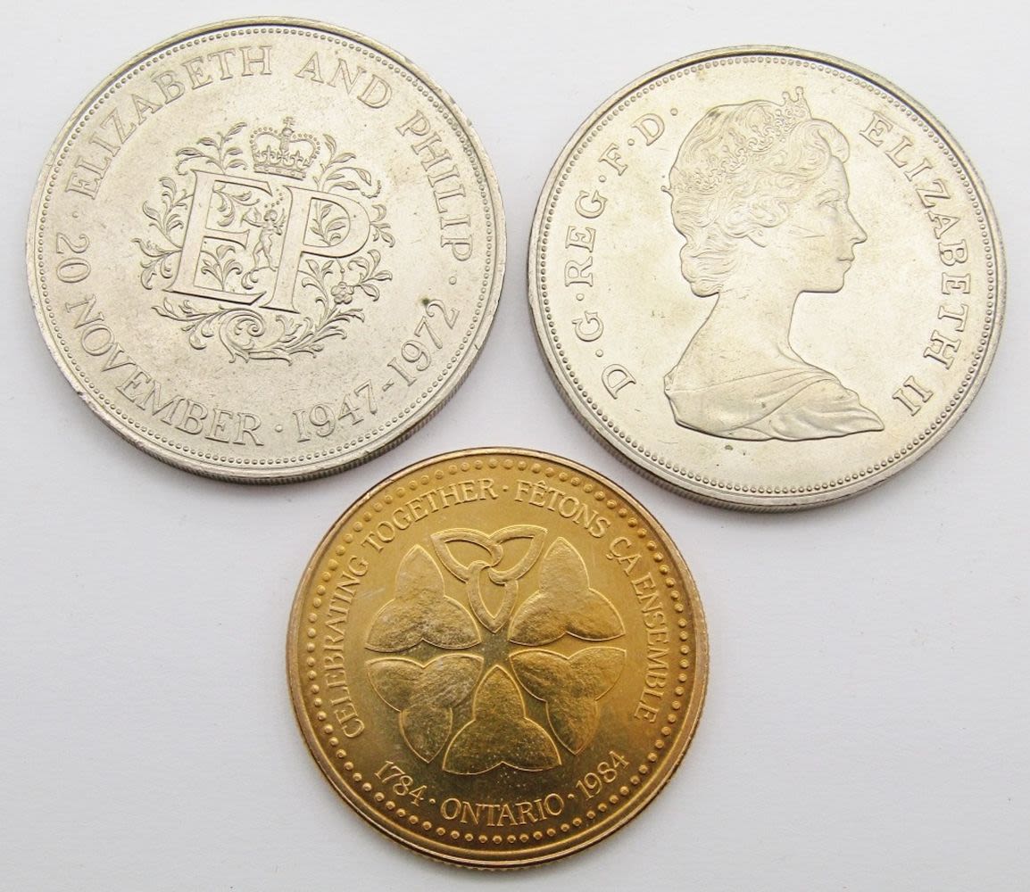 1984 Ontario; Elizabeth & Philip; HRH The Prince of Wales & Lady Diana Spencer 1981; (3) Kennedy Fallen Heroes; Medal of Merit Ronald Reagan; Shady Lady Ranch $5 Trade Token; Maui No Ka Oi 2000 Trade Dollar; 125th