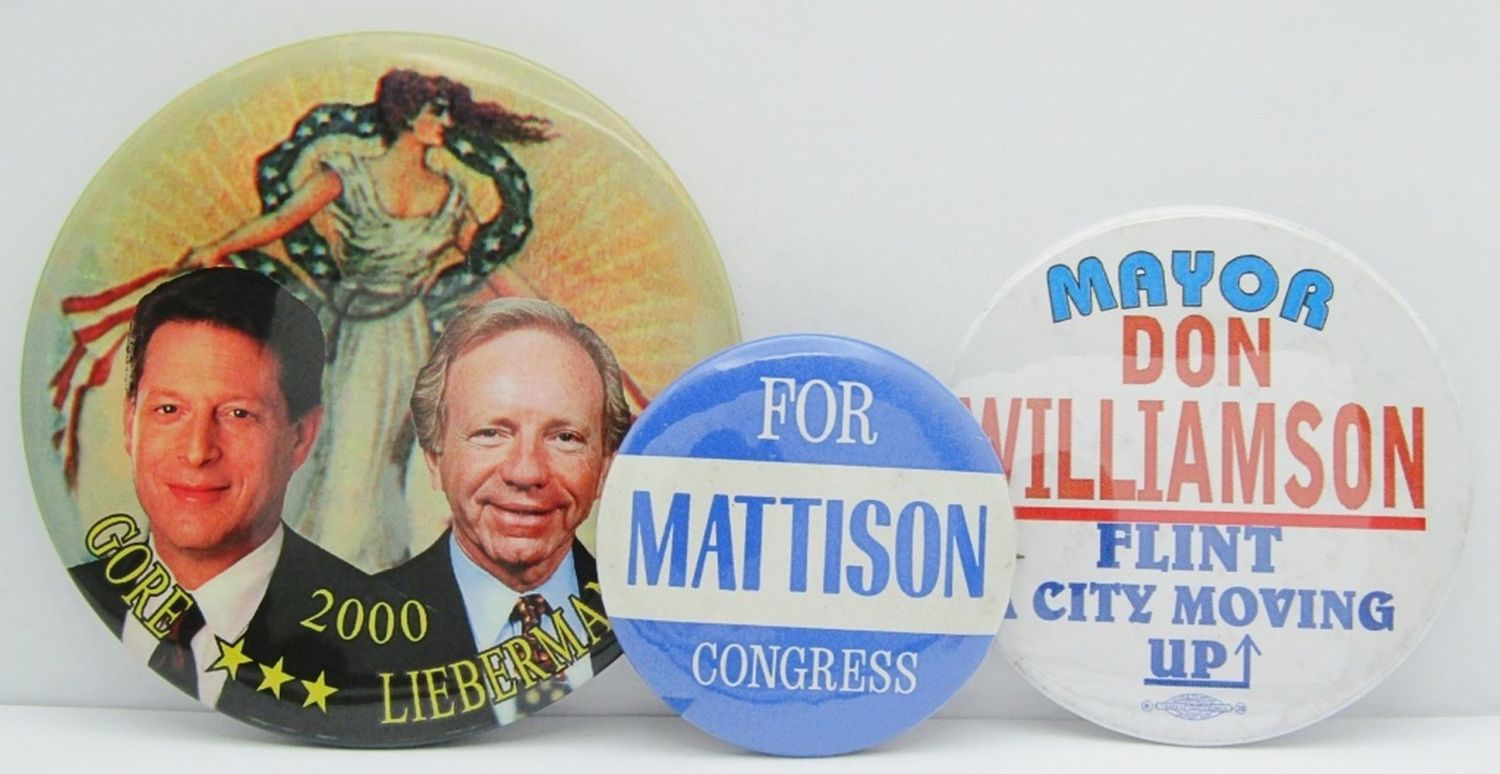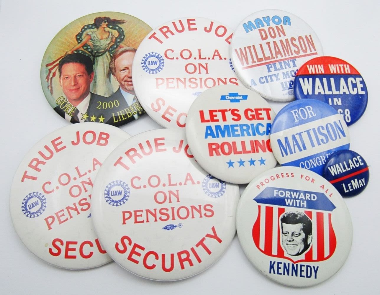 11 Total Button Pins! Kennedy, Gore/Lieberman, Wallace for President, Mattison For Congress, Chevrolet, C.O.L.A. On Pensions, Don Williamson Mayor; See Photos for Details!