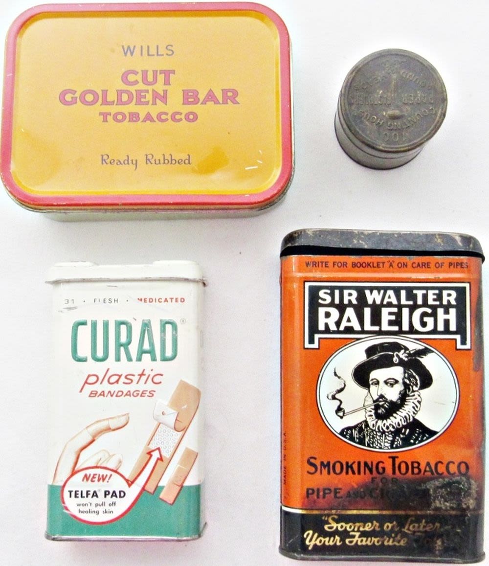 Curad Plastic Bandages Advertising Tin; Wills Cut Golden Bar Tobacco Tin; Sir Walter Raleigh Smoking Tobacco Tin Can; Counting House Round Heads Paper Fasteners Small Brass Embossed Tin;