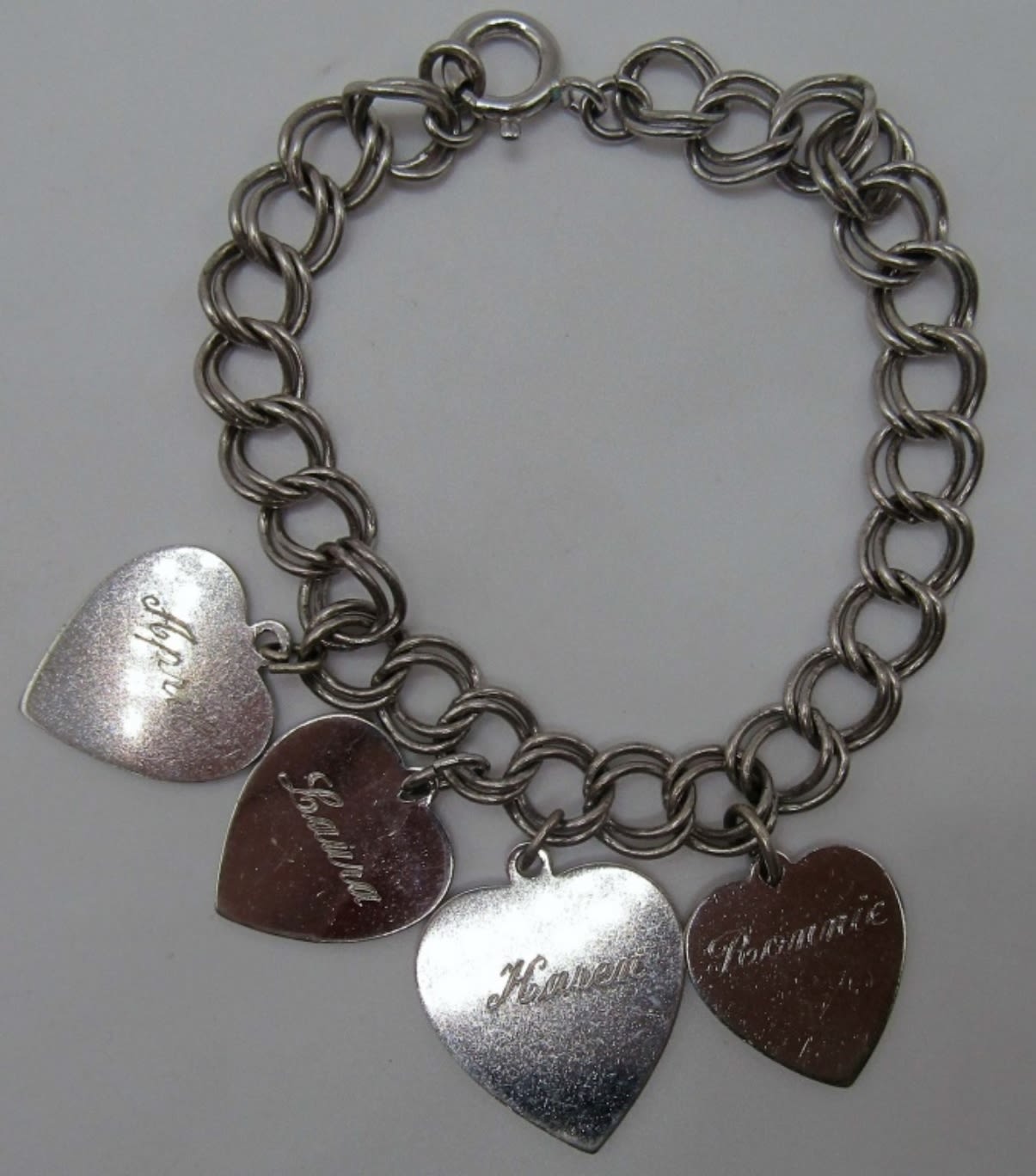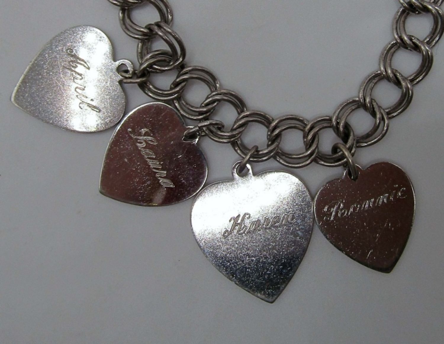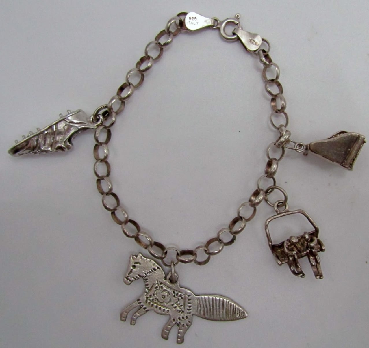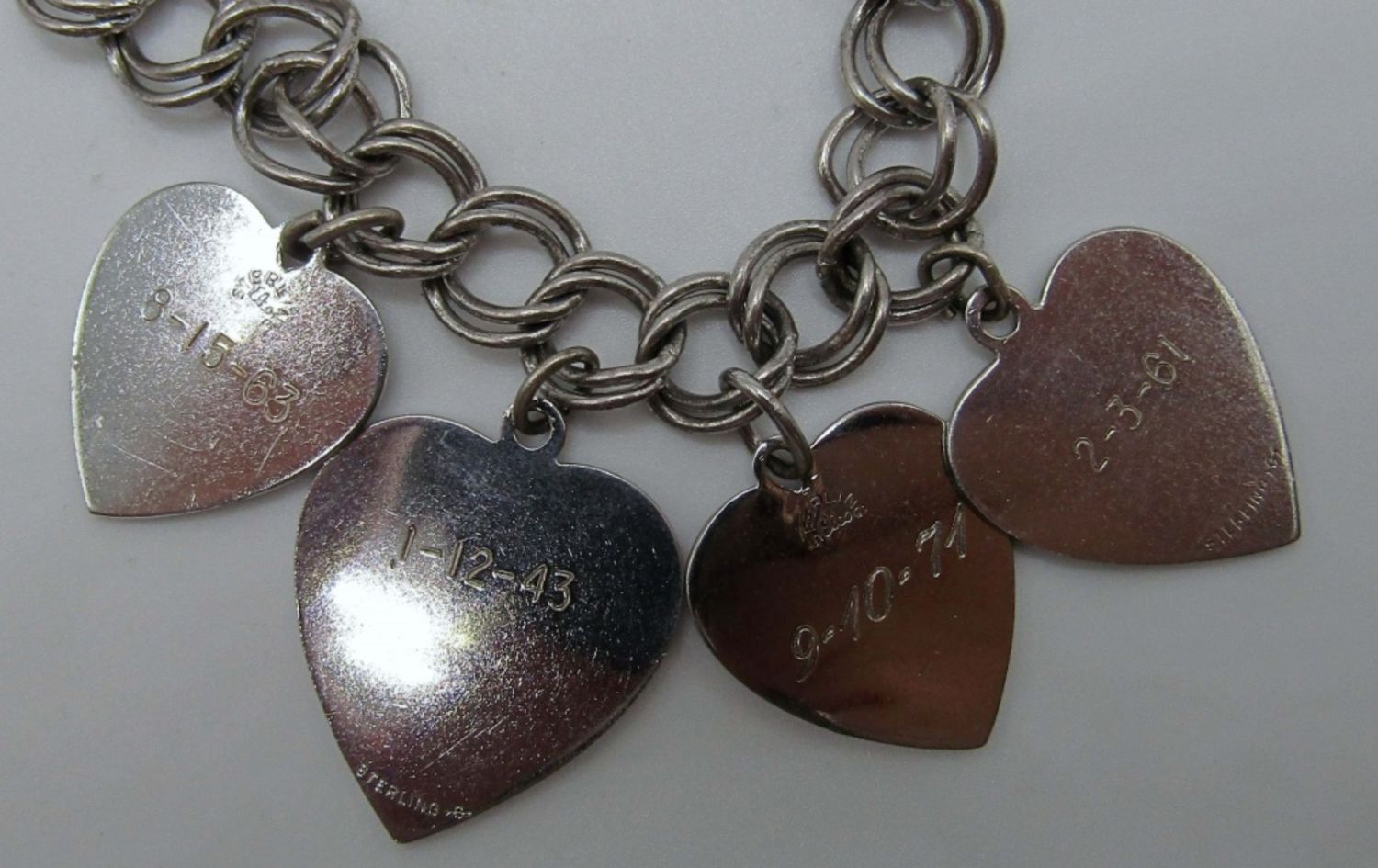 both are 7in in length, one has 4 heart charms with names on front and dates on the back all charms are marked sterling and bracelets as well, second charms are a cleat, a donkey, ski lift and a piano, 21.5 dwt