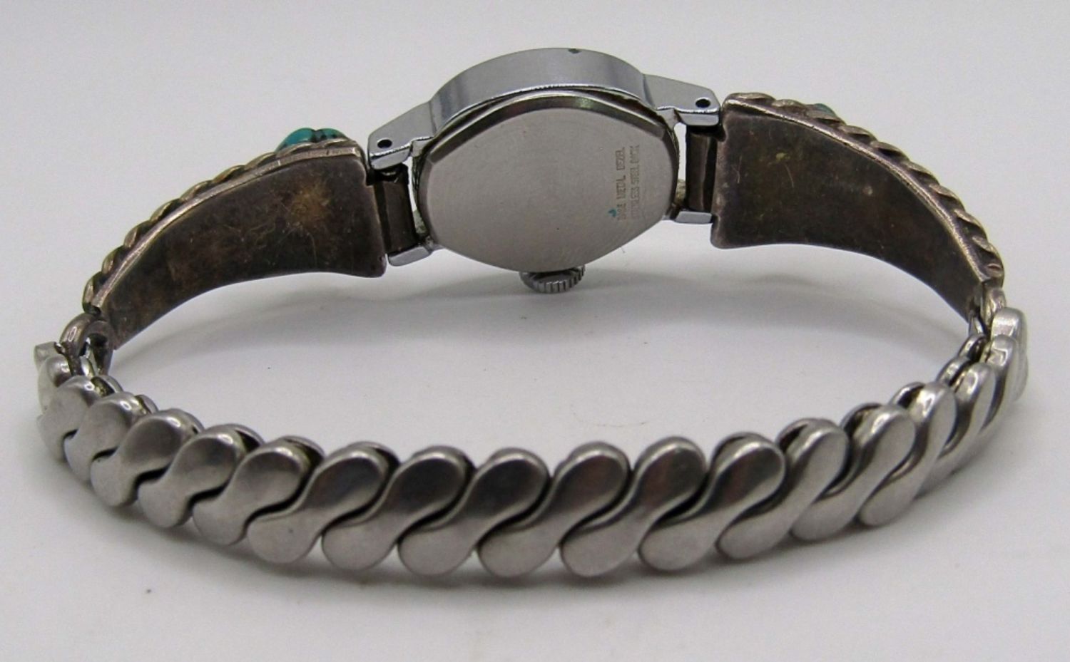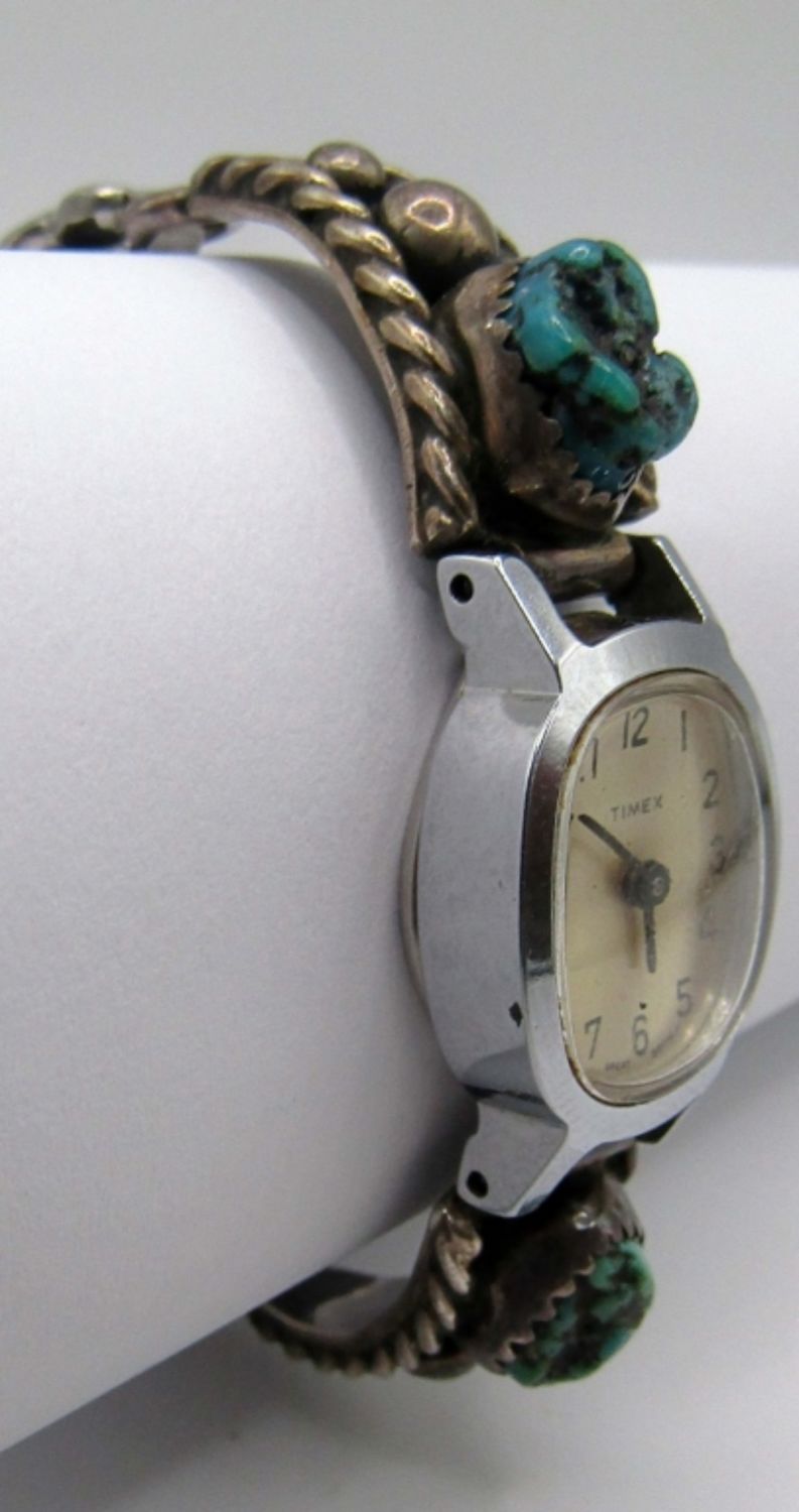 Stretched band, marked sterling, has turquoise stones on each side, watch needs a new battery, untested. 22dwt