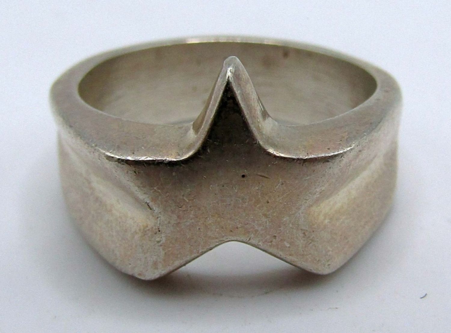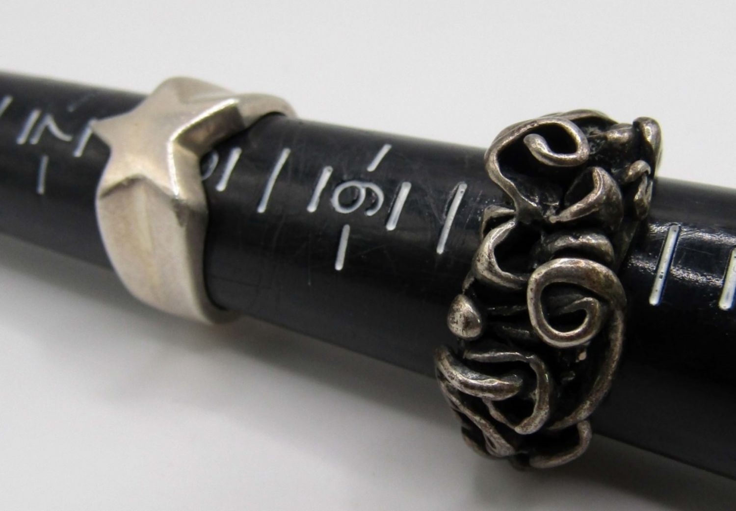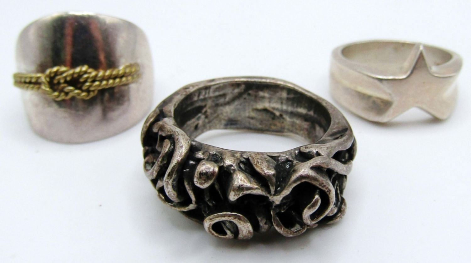 size 8-10, 27dwt, First a star in the center marked Mexico along with unknown markings, Second ring two tone a rope knotted in the middle of ring, marked Mexico and 925, Third unique design all around the ring marked