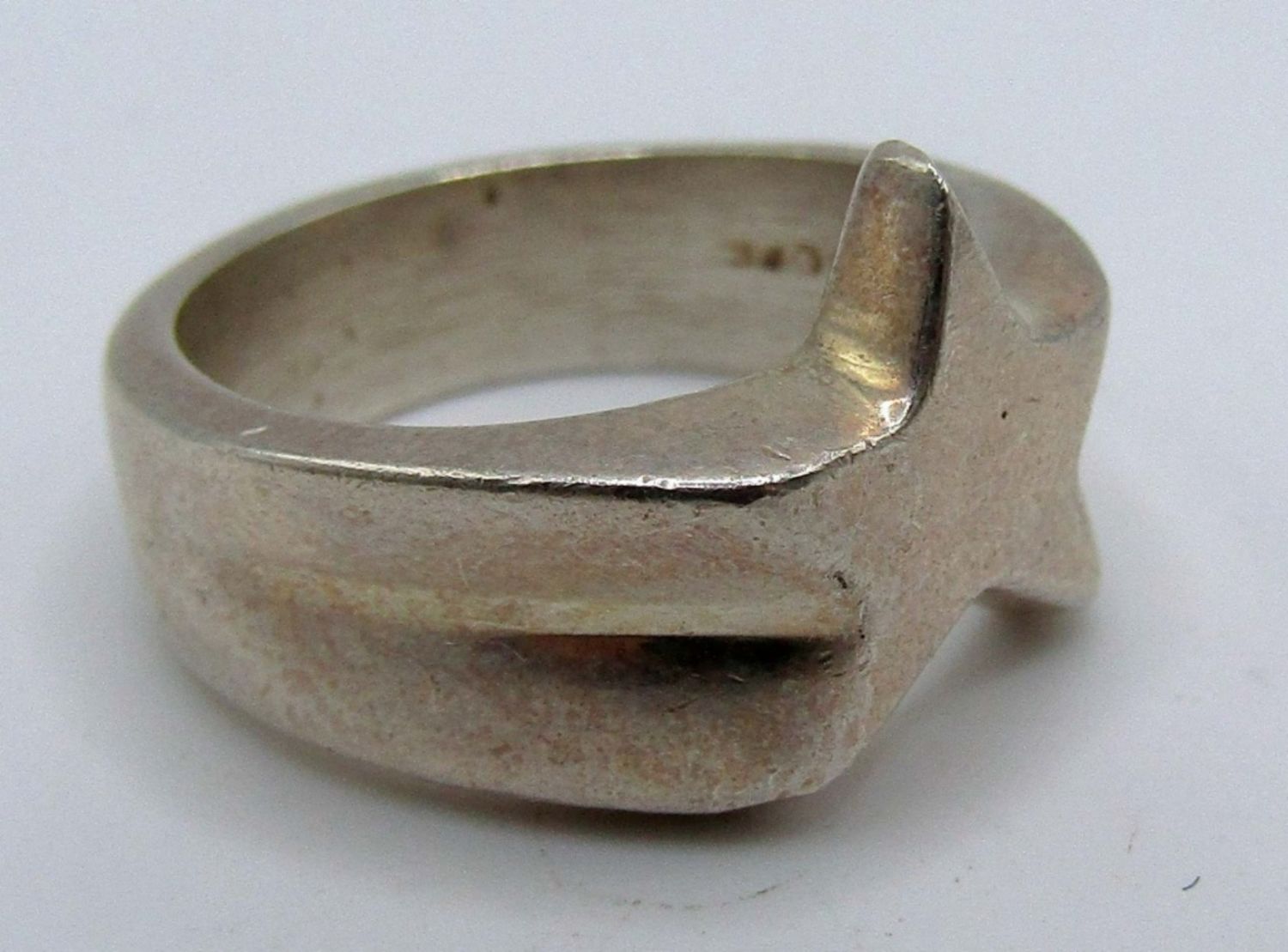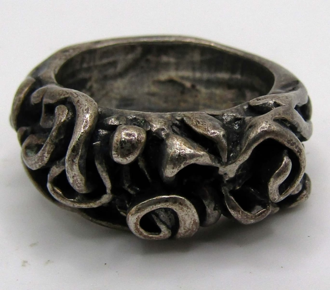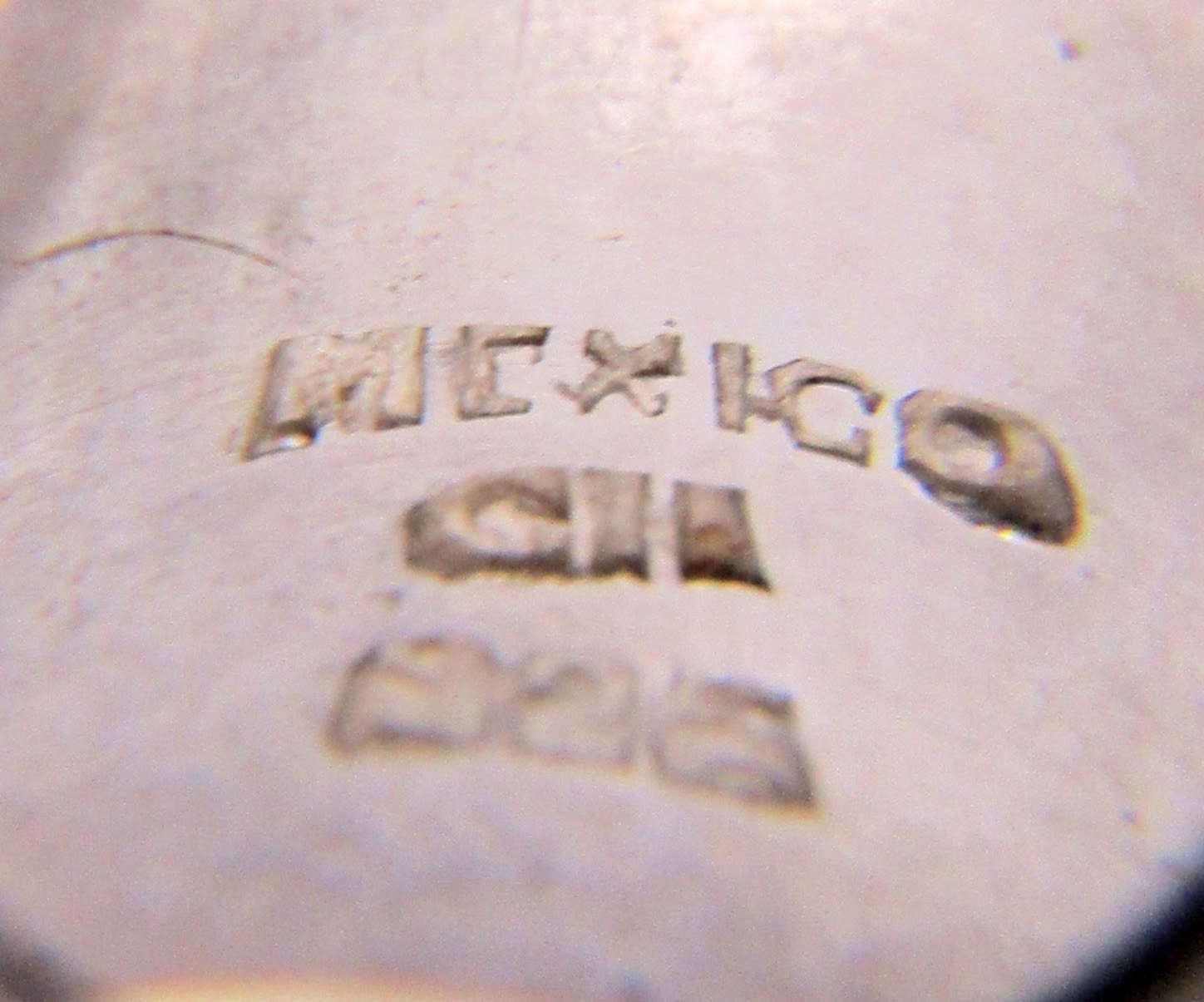 size 8-10, 27dwt, First a star in the center marked Mexico along with unknown markings, Second ring two tone a rope knotted in the middle of ring, marked Mexico and 925, Third unique design all around the ring marked