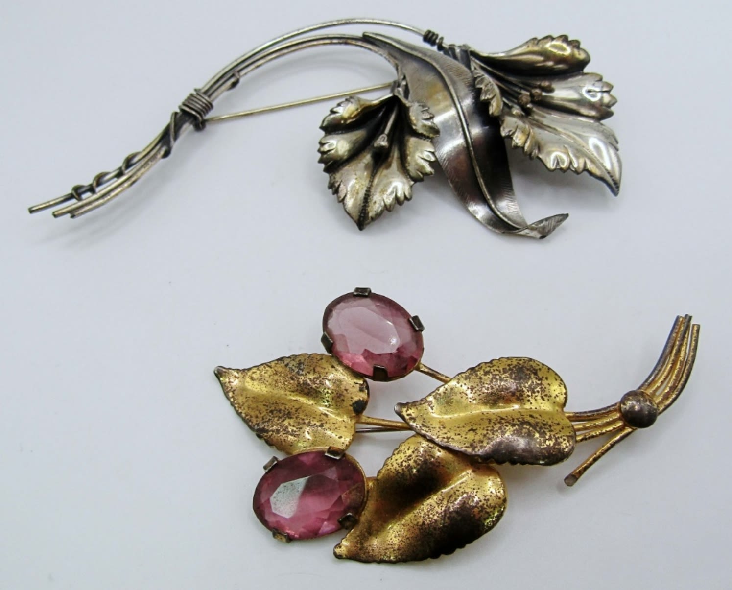 24.7dwt, one gold tone marked sterling with purple clear stones, second marked sterling