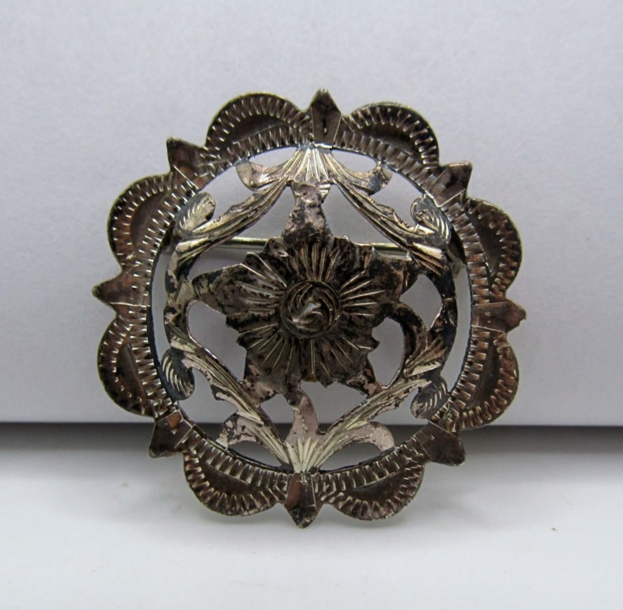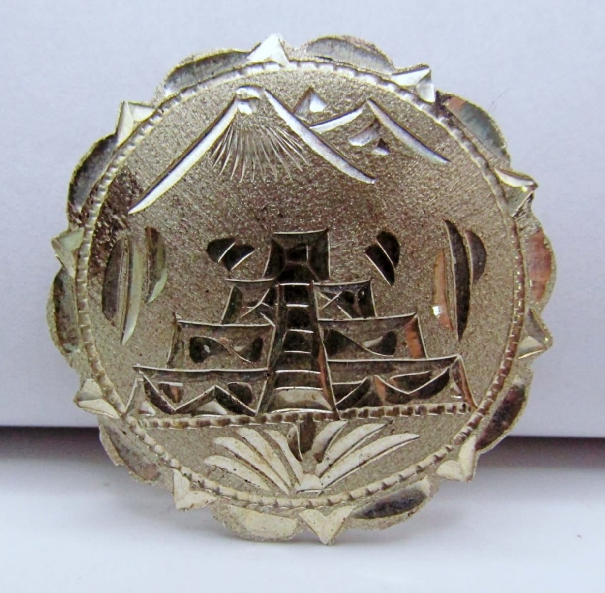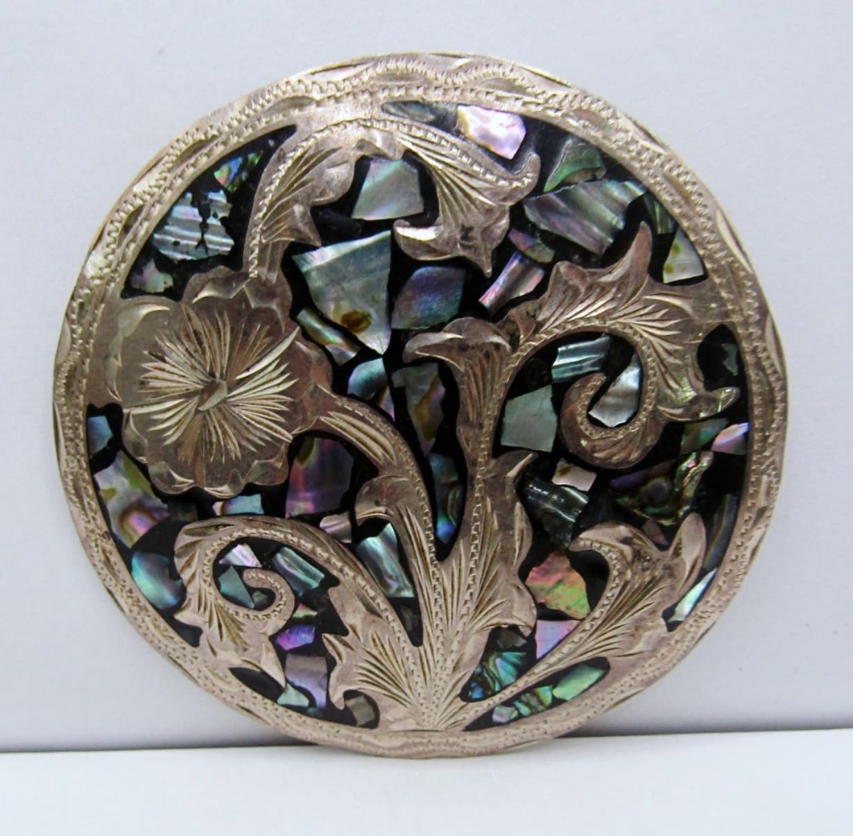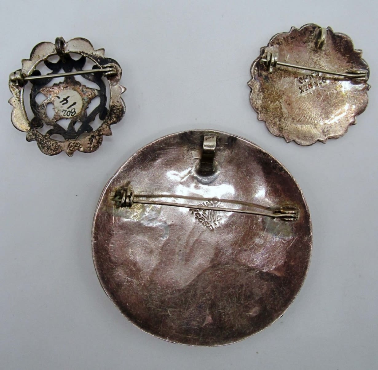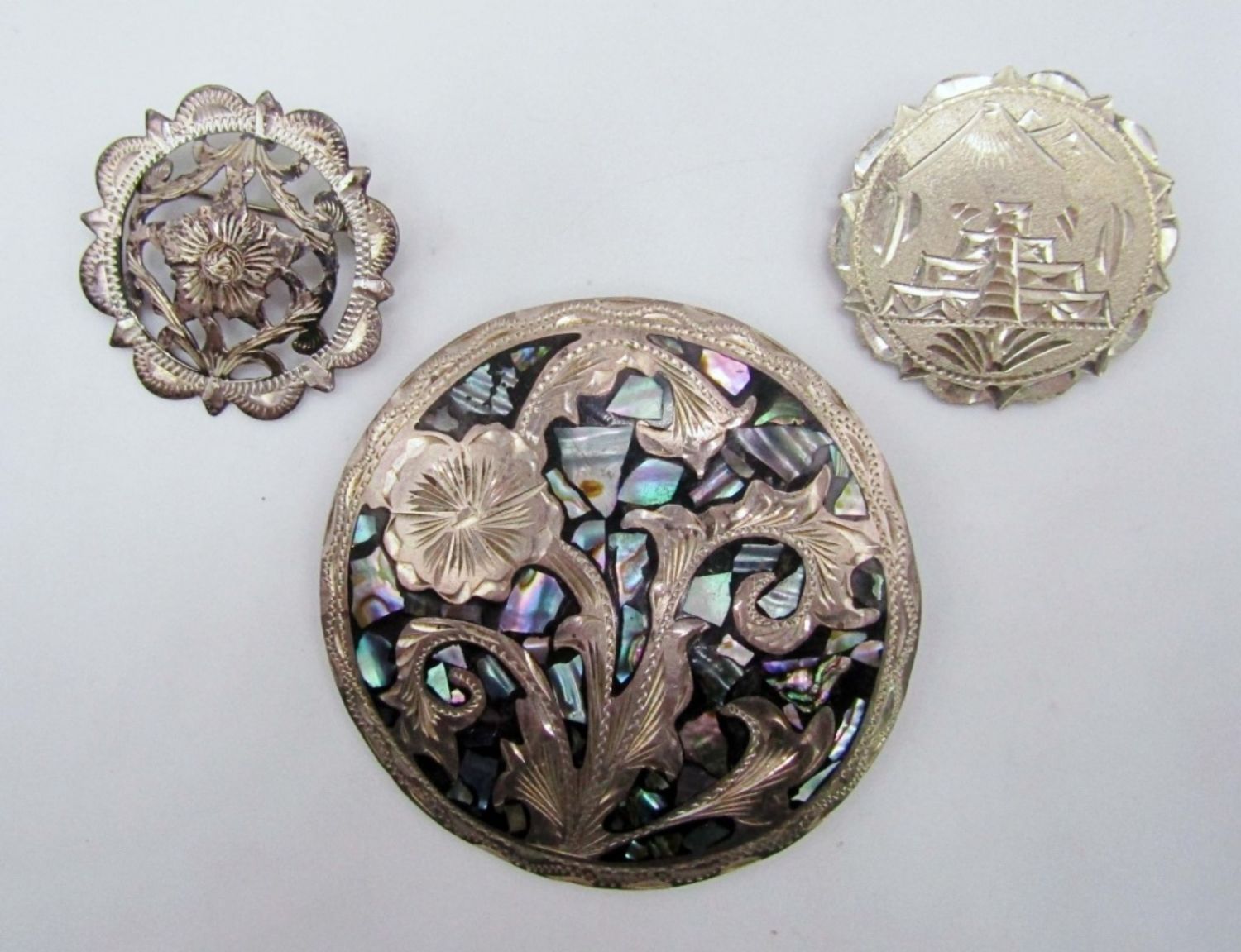 23.1dwt, (1) flower design stamped Mexico, (1) Aztec scene stamped 925 mex C.M.-10, Both about about 2in, (1) 3in mosaic with a flower stamped 925 Mexico